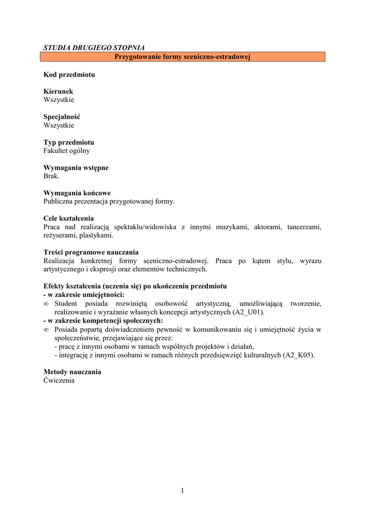 STUDIA DRUGIEGO STOPNIA Przygotowanie formy sceniczno-estradowej Kod przedmiotu Kierunek Wszystkie Specjalność Wszystkie Typ przedmiotu Fakultet ogólny Wymagania wstępne Brak. Wymagania końcowe Publiczna prezentacja przygotowanej formy. Cele kształcenia Praca nad realizacją spektaklu/widowiska z innymi muzykami, aktorami, tancerzami, reżyserami, plastykami. Treści programowe nauczania Realizacja konkretnej formy sceniczno-estradowej. Praca po kątem stylu, wyrazu artystycznego i ekspresji oraz elementów technicznych. Efekty kształcenia (uczenia się) po ukończeniu przedmiotu - w zakresie umiejętności: • Student posiada rozwiniętą osobowość artystyczną, umożliwiającą tworzenie, realizowanie i wyrażanie własnych koncepcji artystycznych (A2_U01). - w zakresie kompetencji społecznych: • Posiada popartą doświadczeniem pewność w komunikowaniu się i umiejętność życia w społeczeństwie, przejawiające się przez: - pracę z innymi osobami w ramach wspólnych projektów i działań, - integrację z innymi osobami w ramach różnych przedsięwzięć kulturalnych (A2_K05). Metody nauczania Ćwiczenia 1 Nakład pracy studenta potrzebny do osiągnięcia efektów uczenia się ROK SEMESTR Na dowolnym roku Punkty ECTS Ilość godzin w semestrze Rodzaj zaliczenia LEGENDA 1 2 3 3 45 45 zal zal zal – zaliczony; zs – zaliczenie ze stopniem; egz – egzamin; ed – egzamin dyplomowy Kryteria oceny Zaliczenie przedmiotu odbywa się na podstawie publicznej prezentacji. Ocenie podlegają aspekty artystyczne, wykonawcze i techniczne zrealizowanej formy. Literatura (piśmiennictwo) Literatura dotycząca: stylistyki i narzędzi potrzebnych do realizacji konkretnej formy sceniczno-estradowej. Język wykładowy Polski Imię i nazwisko wykładowcy Realizatorzy przedsięwzięcia. 2