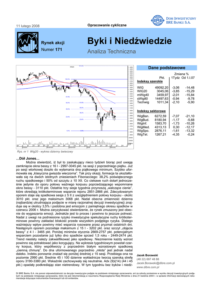 Byki i Niedźwiedzie BRE Bank BRE Bank Securities Opracowanie cykliczne 11 lutego 2008 Rynek akcji Byki i Niedźwiedzie Numer 171 Analiza Techniczna WIG20 161.8% 4050 4000 3950 3900 3850 3800 3750 3700 100.0% 3650 3600 3550 3500 100.0% 3450 3400 3350 61.8% 3300 3250 50.0% 61.8% 3200 Dane podstawowe Pkt. Indeksy szerokie WIG WIG20 mWig40 sWig80 Techwig 49092,20 3045,06 3459,97 14497,63 1011,34 Zmiana % 1Tydz Od 1.I.07 -3,06 -3,85 -2,01 -0,94 -2,10 -14,48 -15,29 -15,84 -9,78 -5,90 -7,07 -1,17 -1,73 0,30 -1,61 -4,35 -21,10 -5,68 -10,26 -12,17 -13,32 -0,24 3150 38.2% 50.0% 3100 3050 38.2% 3000 2950 23.6% 2900 23.6% 2850 2800 2750 2700 0.0% 0.0% 2650 2600 Indeksy sektorowe WigBan. WigBud. WigInf. WigMed. WigSpo. WigTel. 6272,59 8180,94 1583,70 4313,13 2876,11 1267,21 30000 20000 10000 x100 24 1 8 October 15 22 29 5 12 November 19 26 3 10 December 17 27 7 2008 14 21 28 4 11 February 18 2 Rys. nr 1 Wig20 - wykres dzienny świecowy …Dół Jones… Można stwierdzić, iż był to zaskakujący nieco tydzień biorąc pod uwagę zamknięcie okna bessy z 16 I - 2997-3045 pkt. na sesji z poprzedniego piątku. Już po sesji wtorkowej doszło do wyłamania dna piątkowego minimum. Szybko uformowała się „klasyczna gwiazda wieczorna”. Tak przy okazji, formacja ta ukształtowała się na dwóch istotnych zniesieniach Fibonacciego: 38,2% poświątecznego ruchu spadkowego i 50% od szczytu z 10 XII. Co ciekawe ruch dotarł jednocześnie jedynie do oporu połowy ważnego korpusu poprzedzającego wspomniane okno bessy - 3110 pkt. Ostatnie trzy sesje tygodnia przynoszą „walczące cienie”, które określają krótkoterminowe wsparcie rejonu 2851-2866 pkt. Zdecydowanym oporem staje się spadkowa sesja z 5 II z uwzględnieniem połowy korpusu - okolic 3010 pkt. oraz jego maksimum 3068 pkt. Nadal obecna zmienność dzienna (najbardziej utrudniająca podjęcie w miarę racjonalnej decyzji inwestycyjnej) znajduje się w okolicy 3,5% i podobna jest emocjom z pamiętnego okresu spadków w czerwcu 2006 r. Można zaryzykować stwierdzenie, że rynek zmuszony jest obecnie do wygaszania emocji. Jednakże jest to proces i powinno to jeszcze potrwać. Nadal z uwagi na podniesione ryzyko inwestycyjne spekulacyjne ruchy krótkoterminowe powinny zakładać bliskość przede wszystkim podjętego ryzyka. Dlatego ważniejszy wpływ powinny mieć wsparcia rysowane przez pryzmat ostatnich dni. Następnym oporem pozostaje maksimum z 15 I - 3202 pkt. oraz szczyt „objęcia bessy” z 4 I - 3465 pkt. Poniżej minimów stycznia 2669-2757 pkt. potencjalnym wsparciem pozostanie już tylko dno spadków sprzed 1,5 roku - 2449-2474 pkt. Trend niestety należy zakwalifikować jako spadkowy. Niezmiennie każdy wzrost powinno się potraktować jako korygujący. Na wykresie tygodniowym powstał czarny korpus, który współtworzy z poprzednim białym wzrostowym spadkową „ciemną chmurę”. Do dna uformowanego poprzednio „młota” jest jednak nadal daleko. Indeks ponownie znalazł się poniżej średniej z 15 sesji. Przebiega ona na poziomie 2990 pkt. Średnie 45 i 100 dzienne wykładnicze tworzą szeroką strefę oporu 3190-3380 pkt. Wskaźniki zachowywały się neutralnie. Adx (9)i(14) (44 i 45 pkt.) opadały podkreślając stan nietrendowy. W tym tygodniu bez byków i niedź- Jacek Borawski (48 22) 697 48 88 [email protected] www.dibre.com.pl DI BRE Banku S.A. nie ponosi odpowiedzialności za decyzje inwestycyjne podjęte na podstawie niniejszego opracowania, ani za szkody poniesione w wyniku decyzji inwestycyjnych podjętych na podstawie niniejszego opracowania, które nie jest rekomendacją w rozumieniu Rozporządzenia Rady Ministrów z dnia 21 kwietnia 2004 r. w sprawie informacji stanowiących rekomendacje dotyczące instrumentów finansowych lub ich emitentów. Byki i Niedźwiedzie BRE Bank ŚREDNIOTERMINOWY PORTFEL BYKÓW Nazwa spółki byki ZURAWIE ASTARTA POLICE INTERFERIE z ub tygodnia FAMUR TUP Data wydania Cena wydania Cena obecna Zmiana kursu (%) +7,37 22.01.08 29.01.08 29.01.08 22.01.08 17,37 29,93 15,60 5,33 18,80 30,96 18,64 5,24 8,23 3,44 19,49 -1,69 04.02.08 04.02.08 3,75 13,45 3,76 13,60 0,27 1,12 Warunki wyjścia Poziom ind. WIG < 17,50 id < 30,00 id < 16,01 id < 5,12 id < 3,52 id < 12,70 id Zmiana ind. WIG (%) 44509 46632 46632 44509 6,92 2,05 2,05 6,92 49092 49092 -3,06 -3,06 OPUŚCIŁY PORTFEL Nazwa spółki POWÓD OPUSZCZENIA Synthos N.S (-1,74%) Groclin O.S (-5,60%) HTL-Strefa O.S (-3,73%) Swissmed N.S (-1,53%) Budopol R.Z (+7,65%) Potencjalne byki R.Z Realizacja zysków O.S Ograniczenie strat N.S Niejasna sytuacja ŚREDNIOTERMINOWY PORTFEL NIEDŹWIEDZI Nazwa spółki Data wydania Cena wydania Cena obecna Zmiana kursu (%) niedźwiedzie IDMSA MILLENNIUM INGBSK -24,92 07.01.08 07.01.08 29.01.08 13,80 11,02 600,50 8,18 7,72 576,00 -40,72 -29,95 -4,08 z ub tygodnia B3SYSTEM CEZ COMARCH KETY 04.02.08 04.02.08 04.02.08 04.02.08 3,38 169,10 127,00 127,50 3,00 171,50 120,60 120,80 -11,24 1,42 -5,04 -5,25 Warunki wyjścia Poziom ind. WIG Zmiana ind. WIG (%) > 9,82 id > 8,38 id > 616,00 id 54851 54851 46632 -13,24 -13,24 2,05 > 3,41 id > 174,00 id > 129,70 id > 129,90 id 49092 49092 49092 49092 OPUŚCIŁY PORTFEL Nazwa spółki POWÓD OPUSZCZENIA MCI R.Z (+31,12%) Lotos R.Z (+8,95%) Getin R.Z (+8,08%) -3,06 -3,06 -3,06 -3,06 Potencjalne niedźwiedzie R.Z Realizacja zysków O.S Ograniczenie strat N.S Niejasna sytuacja Byki i Niedźwiedzie BRE Bank Podsumowanie portfela Byków i Niedźwiedzi z ostatniego tygodnia byki Z/Z spółka kurs Z kurs ost. różnica różnica w % ENERGOPOL 10,70 10,00 -0,70 -6,54 FAMUR 3,75 3,76 0,01 0,27 GANT 54,90 51,29 -3,61 -6,58 SFINKS 20,24 18,78 -1,46 -7,21 TUP 13,45 13,60 0,15 1,12 Średnio -3,79 Z/Z niedźwiedzie spółka kurs kurs ost. różnica różnica w % B3SYSTEM 3,38 3,00 -0,38 -11,24 CCIINT 29,41 29,80 0,39 1,33 CEZ 169,10 171,50 2,40 1,42 COMARCH 127,00 120,60 -6,40 -5,04 KETY 127,50 120,80 indeksy kurs -6,70 -5,25 Średnio -3,76 kurs ost. różnica różnica w % -3,06 