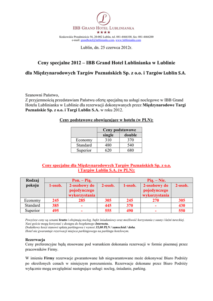 Krakowskie Przedmieście 56, 20-002 Lublin, tel. 081-4466100, fax: 081-4466200 e-mail: [email protected], www.lublinianka.com Lublin, dn. 25 czerwca 2012r. Ceny specjalne 2012 – IBB Grand Hotel Lublinianka w Lublinie dla Międzynarodowych Targów Poznańskich Sp. z o.o. i Targów Lublin S.A. Szanowni Państwo, Z przyjemnością przedstawiam Państwu ofertę specjalną na usługi noclegowe w IBB Grand Hotelu Lublinianka w Lublinie dla rezerwacji dokonywanych przez Międzynarodowe Targi Poznańskie Sp. z o.o. i Targi Lublin S.A. w roku 2012. Ceny podstawowe obowiązujące w hotelu (w PLN): Economy Standard Superior Ceny podstawowe single double 310 370 480 540 620 680 Ceny specjalne dla Międzynarodowych Targów Poznańskich Sp. z o.o. i Targów Lublin S.A. (w PLN): Rodzaj pokoju 1-osob. Economy Standard Superior 245 385 495 Pon. – Pią. 2-osobowy do pojedynczego wykorzystania 285 - 2-osob. 1-osob. 305 445 555 245 370 490 Pią. – Nie. 2-osobowy do pojedynczego wykorzystania 270 - 2-osob. 305 430 550 PowyŜsze ceny są cenami brutto i obejmują nocleg, bufet śniadaniowy oraz moŜliwość korzystania z sauny i łaźni tureckiej. Nasi goście mogą korzystać z dostępu do bezpłatnego Internetu. Dodatkowy koszt stanowi opłata parkingowa i wynosi 35,00 PLN / samochód / doba. Hotel nie gwarantuje rezerwacji miejsca parkingowego na parkingu hotelowym. Rezerwacja Ceny preferencyjne będą stosowane pod warunkiem dokonania rezerwacji w formie pisemnej przez pracowników Firmy. W imieniu Firmy rezerwacje gwarantowane lub niegwarantowane moŜe dokonywać Biuro PodróŜy po określonych cenach w niniejszym porozumieniu. Rezerwacje dokonane przez Biuro PodróŜy wyłącznie mogą uwzględniać następujące usługi: nocleg, śniadanie, parking. Anulacja rezerwacji Bezpłatna anulacja – 24 godziny przed planowanym przyjazdem w formie pisemnej (e-mail, faks). W przypadku niewykorzystania rezerwacji gwarantowanej Hotel obciąŜy Firmę za pierwszą dobę noclegu. Sposób płatności Płatność zostanie dokonana przez osobę podróŜującą przy przyjeździe gotówką lub kartą płatniczą. W przypadku płatności przelewem wymagane jest przesłanie dokumentów Firmy (kopii: KRS, nadania numerów REGON i NIP), oraz kaŜdorazowe zamówienie pisemne z uwzględnieniem usług, za które Firma zobowiązuje się zapłacić (przy płatności przelewem wyłącznie: nocleg, śniadanie, restauracja, parking). Poufność Porozumienie ma charakter poufny. Obie strony zobowiązują się, iŜ nie będą udostępniały jakichkolwiek informacji zawartych w porozumieniu stronom trzecim. JeŜeli akceptujecie Państwo przedstawioną powyŜej propozycję współpracy, prosimy o odesłanie podpisanej kopii oferty faksem lub pocztą. Podpisana oferta gwarantuje Państwu w/w. ceny w 2012 roku. W przypadku pytań prosimy o kontakt pod numerem telefonu 081 – 44 66 167, 694 46 55 36, fax: 081 – 44 66 200, e-mail: [email protected] Zapraszam do odwiedzenia strony internetowej: www.lublinianka.com Z powaŜaniem, Jarosław Trojak Zastępca Dyrektora IBB Grand Hotel Lublinianka