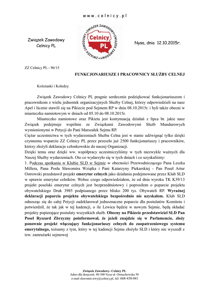 www.celnicy.pl Związek Zawodowy Celnicy PL Nysa, dnia 12.10.2015r. ZZ Celnicy PL - 96/15 FUNKCJONARIUSZE I PRACOWNICY SŁUŻBY CELNEJ Koleżanki i Koledzy. Związek Zawodowy Celnicy PL pragnie serdecznie podziękować funkcjonariuszom i pracownikom z wielu jednostek organizacyjnych Służby Celnej, którzy odpowiedzieli na nasz Apel i licznie stawili się na Pikiecie pod Sejmem RP w dniu 08.10.2015r. i byli także obecni w miasteczku namiotowym w dniach od 05.10 do 08.10.2015r. Miasteczko namiotowe oraz Pikieta jest kontynuacją działań z lipca br. jakie nasz Związek podejmuje wspólnie ze Związkami Zawodowymi Służb Mundurowych wymienionymi w Petycji do Pani Marszałek Sejmu RP. Ciężar uczestnictwa w tych wydarzeniach Służba Celna jest w stanie udźwignąć tylko dzięki czynnemu wsparciu ZZ Celnicy PL przez przeszło już 2500 funkcjonariuszy i pracowników, którzy złożyli deklaracje członkowskie do naszej Organizacji. Dzięki temu oraz dzięki ww. współpracy uczestniczyliśmy w tych niezwykle ważnych dla Naszej Służby wydarzeniach. Oto co wydarzyło się w tych dniach i co uzyskaliśmy: 1. Podczas spotkania w Klubie SLD w Sejmie w obecności Przewodniczącego Pana Leszka Millera, Pana Posła Sławomira Wziątka i Pani Katarzyny Piekarskiej - Pan Poseł Artur Ostrowski przedstawił projekt emerytur celnych jako działania podejmowane przez Klub SLD w sprawie emerytur celników. Wobec czego odpowiedziałem, że od dnia wyroku TK K39/13 projekt poselski emerytur celnych jest bezprzedmiotowy i poprosiłem o poparcie projektu obywatelskiego Druk 3985 podpisanego przez blisko 200 tys. Obywateli RP. Wyraźnej deklaracji poparcia projektu obywatelskiego bezpośrednio nie uzyskałem. Klub SLD odnosząc się do całej Petycji zadeklarował jednoznaczne poparcie dla postulatów Komitetu i potwierdził, że tak jak w tej kadencji, o ile Lewica będzie w nowym Sejmie, będą składać projekty popierające postulaty wszystkich służb. Obecny na Pikiecie przedstawiciel SLD Pan Poseł Ryszard Zbrzyzny poinformował, że jeżeli znajdzie się w Parlamencie, złoży ponownie projekt włączający funkcjonariuszy celnych do zaopatrzeniowego systemu emerytalnego, tożsamy z tym, który w tej kadencji Sejmu złożyło SLD i który nie wyszedł z tzw. zamrażarki sejmowej Związek Zawodowy- Celnicy PL Adres dla doręczeń: 48-300 Nysa ul. Otmuchowska 50 e-mail [email protected], tel: 668-438-041 www.celnicy.pl 2. Podczas spotkania w Klubie PiS w Sejmie w obecności Przewodniczącego Klubu Pana Mariusza Błaszczaka i Pana Posła Jarosława Zielińskiego poinformowałem o złożeniu w Sejmie projektu obywatelskiego jw. Uzyskałem odpowiedź, że projekt ten jest dobrze znany i że Klub PiS poprze go w przyszłej kadencji, bo aktualna już właśnie się kończy. Analogiczną deklarację Pan Poseł Jarosław Zieliński złożył w imieniu Klubu PiS wobec ponad 5 tys. funkcjonariuszy i pracowników wszystkich służb mundurowych obecnych na Pikiecie. Stanowisko Klubu PiS zostało przedstawione na Pikiecie w obecności Pani Poseł Beaty Mazurek, Pani Poseł Małgorzaty Gosiewskiej i Pana Posła Janusza Śniadka. Klub PiS zadeklarował także jednoznaczne poparcie dla postulatów zgłoszonych przez protestujące Związki. Związek Zawodowy- Celnicy PL Adres dla doręczeń: 48-300 Nysa ul. Otmuchowska 50 e-mail [email protected], tel: 668-438-041 www.celnicy.pl 3. Spotkania w miasteczku namiotowym z Posłami W miasteczku namiotowym w dniach od 05.10 do 08.10. odbywały się spotkania z wieloma Parlamentarzystami. Miasteczko odwiedził także Przewodniczący Mariusz Błaszczak z KP PiS i Przewodniczący Leszek Miller z KP SLD. 4. Spotkanie oficjalnej delegacji Komitetu Protestacyjnego wszystkich służb z Panią Marszałek Sejmu RP Małgorzatą Kidawą-Błońską, które miało miejsce w dniu Pikiety. Podczas rozmowy przedstawiona została Pani Marszałek Petycja służb mundurowych oraz pismo nr ZZ Celnicy PL – 95/15 z dnia 06.10.2015r. Te dwa dokumenty są dostępne na www.celnicy.pl pod linkiem: http://celnicy.pl/content.php/2636-PETYCJA-S%C5%81U%C5%BBB-MUNDUROWYCH-WR %C4%98CZONA-PANI-MARSZA%C5%81EK 5. W czasie protestu został nadany numer druku 3985 dla obywatelskiego projektu ustawy włączającego funkcjonariuszy celnych do zaopatrzeniowego systemu emerytalnego. W dniu 07.10.2015r., w przeddzień Pikiety, Pani Marszałek zleciła wydruk projektu dla wszystkich Posłów obecnej kadencji. Projekt przejdzie oczywiście na przyszłą kadencję i będzie ponownie przekazany wszystkim nowym Parlamentarzystom. W terminie do 6 miesięcy od dnia ukonstytuowania się nowego Sejmu musi odbyć się I czytanie tego projektu - możemy spodziewać się tego na pierwszych posiedzeniach nowego Sejmu i musimy wszyscy być na to przygotowani i czynnie w tych wydarzeniach uczestniczyć W miasteczku, podczas każdej zmiany, funkcjonariuszy Służby Celnej reprezentowała delegacja ZZ Celnicy PL jako współorganizatorzy całej akcji. VIDEO od 7 min https://www.youtube.com/watch?v=5g3oFaQL4kE&feature=youtu.be Związek Zawodowy- Celnicy PL Adres dla doręczeń: 48-300 Nysa ul. Otmuchowska 50 e-mail [email protected], tel: 668-438-041 www.celnicy.pl W związku z aktualną sytuacją, w której możliwość osiągnięcia celu emerytur mundurowych dla wszystkich funkcjonariuszy celnych stała się najbardziej realna w historii, prosimy wszystkich funkcjonariuszy o wyrażenie poparcia dla obywatelskiego projektu ustawy Druk 3985. Wciąż niezbędne jest wsparcie ZZ Celnicy PL poprzez złożenie deklaracji członkowskiej, zakładanie struktur Związku i czynne uczestnictwo w organizowanych przez ZZ Celnicy PL wydarzeniach. Aby działania mogły być znacznie skuteczniejsze powinno być nas dużo więcej, co najmniej 6 tys. członków ZZ Celnicy PL. Wtedy, jako silny ruch związkowy, znacznie skuteczniej zawalczymy o włączenie wszystkich funkcjonariuszy do zaopatrzeniowego systemu emerytalnego, jak również moc