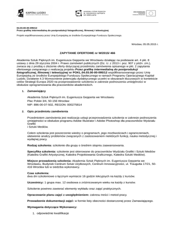 04.03.00-00-095/12 Przez grafikę intermedialną do postprodukcji fotograficznej, filmowej i telewizyjnej Projekt współfinansowany przez Unię Europejską ze środków Europejskiego Funduszu Społecznego. Wrocław, 05.05.2015 r. ZAPYTANIE OFERTOWE nr W/2015/ 466 Akademia Sztuk Pięknych im. Eugeniusza Gepperta we Wrocławiu działając na podstawie art. 4 pkt. 8 ustawy z dnia 29 stycznia 2004 r. Prawo zamówień publicznych (Dz. U. z 2013 r. poz. 907 z późn. zm.), zwraca się z prośbą o złożenie oferty dotyczącej przedmiotu zamówienia opisanego w pkt. 2 zapytania ofertowego związanego z realizacją projektu Przez grafikę intermedialną do postprodukcji fotograficznej, filmowej i telewizyjnej nr POKL.04.03.00-00-095/12 współfinansowanego przez Unię Europejską ze środków Europejskiego Funduszu Społecznego w ramach Programu Operacyjnego Kapitał Ludzki, Działanie 4.3 Wzmocnienie potencjału dydaktycznego uczelni w obszarach kluczowych w kontekście celów Strategii Europa 2020 na przeprowadzenie szkolenia w zakresie podnoszenia umiejętności w obsłudze oprogramowania dla pracowników akademickich. 1. Zamawiający Akademia Sztuk Pięknych im. Eugeniusza Gepperta we Wrocławiu Plac Polski 3/4, 50-156 Wrocław NIP: 896-00-07-502, REGON: 000275814 2. Opis przedmiotu zamówienia Przedmiotem zamówienia jest realizacja usługi przeprowadzenia szkolenia w zakresie podnoszenia umiejętności w obsłudze programu Adobe Illustrator i Adobe Photoshop dla pracowników Wydziału Grafiki i Sztuki Mediów. Celem szkolenia jest poszerzenie wiedzy o programach, jego możliwościach i ograniczeniach, ułatwienie analizy problemów związanych z zastosowaniem niektórych funkcji, nauka metodycznej i wydajnej pracy. Rodzaj szkolenia: szkolenie dla grupy o średnim stopniu zaawansowania. Specyfika szkolenia: szkolenie jest skierowane do pracowników Wydziału Grafiki i Sztuki Mediów (Katedra Grafiki Artystycznej, Katedra Projektowania Graficznego, Katedra Sztuki Mediów). Miejsce prowadzenia szkolenia: Akademia Sztuk Pięknych im. Eugeniusza Gepperta we Wrocławiu, Budynek Centrum Sztuk Użytkowych, Centrum Innowacyjności, ul. Traugutta 17/21, 50416 Wrocław lub w siedziba wykonawcy. Czas szkolenia: dwa dni szkoleniowe o łącznym wymiarze 16 godzin lekcyjnych na każdy z kursów. Uczestnicy: 1 grupa max. 12 osobowa o zróżnicowanym wieku na każdy z kursów. Szkolenie powinno zawierać elementy wykładu oraz zajęć praktycznych. Opracowanie planu zajęć z uwzględnieniem: zakresu treści i metod pracy. Prowadzenie dokumentacji zajęć: w formie listy obecności dostarczonej przez Zamawiającego. Wymagania dotyczące Wykonawcy: 1. odpowiednie kwalifikacje • doświadczenie w prowadzeniu szkoleń i kursów z zakresu programu Adobe Illustrator i Adobe Photoshop dla grup o różnych stopniach zaawansowania Dodatkowe wymagania: • możliwość uzyskania certyfikatu potwierdzającego udział w szkoleniu 3. Termin realizacji zamówienia czerwiec–lipiec 2015. 4. Kryteria oceny oferty Zamawiający zastosuje następujące kryteria wyboru oferty: Cena – 80% i kwalifikacje i doświadczenie Wykonawcy -20%. Zamawiający udzieli zamówienie Wykonawcy, które spełni wszystkie wymogi Zamawiającego opisane w niniejszym zapytaniu ofertowym. 5. Sposób przygotowania oferty Oferta powinna zawierać: wypełniony Formularz Oferty – załącznik nr 1 do niniejszego zapytania oświadczenie o braku powiązań osobowych i kapitałowych – załącznik nr 2 do niniejszego zapytania doświadczenie, przeprowadzone kursy, referencje . Oferta powinna być złożona w polskiej walucie. Wszystkie koszty związane z realizacją niniejszego zamówienia powinny być skalkulowane w cenie ofertowej stanowiącej kwotę brutto. 6. Sposób złożenia oferty Ofertę należy przesłać na adres mailowy: [email protected] z dopiskiem w temacie maila: Zapytanie ofertowe nr W/2015/466 przeprowadzenie szkolenia w zakresie podnoszenia umiejętności w obsłudze programu Adobe Illustrator i Adobe Photoshop dla pracowników Wydziału Grafiki i Sztuki Mediów. Ofertę należy dostarczyć w terminie do dnia 08.05.2015 r. 7. Procedura wyboru oferty oceny oferty dokona Zarząd Projektu o wyborze oferty Zamawiający poinformuje na swojej stronie internetowej www.asp.wroc.pl oferta nie spełniająca wymagań formalnych określonych w niniejszym postępowaniu zostanie odrzucona powodem odrzucenia oferty będzie podanie ceny przekraczającej zaplanowany budżet na zamówienie zamawiający nie dopuszcza składania ofert częściowych oraz wariantowych zamawiający zastrzega sobie prawo do unieważnienia postępowania bez podania przyczyn Akademia Sztuk Pięknych im. Eugeniusza Gepperta we Wrocławiu inż. Wojciech Orzechowski Załącznik nr 1 ……………………………………… miejscowość, data FORMULARZ OFERTY nr W/2015/466 Wykonawca Nazwa ......................................................... Adres .......................................................... ...................................................................... NIP ........................................................... Tel ......................... Fax ......................... E-mail ........................................................... …….……………………………………… pieczęć i podpis wykonawcy W odpowiedzi na zapytanie ofertowe nr W/2015/466 dotyczące przeprowadzenia szkolenia w zakresie podnoszenia umiejętności w obsłudze Adobe Illustrator i Adobe Photoshop dla pracowników Wydziału Grafiki i Sztuki Mediów. w ramach projektu pn. Przez grafikę intermedialną do postprodukcji fotograficznej, filmowej i telewizyjnej nr POKL.04.03.00-00-095/12 współfinansowanego przez Unię Europejską ze środków Europejskiego Funduszu Społecznego w ramach Programu Operacyjnego Kapitał Ludzki, Działanie 4.3 Wzmocnienie potencjału dydaktycznego uczelni w obszarach kluczowych w kontekście celów strategii Europa 2020, ofe