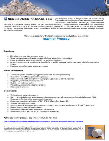 jest miejscem pracy, w którym wiemy, że sukces naszej firmy zawdzięczamy wyjątkowemu zespołowi pracowników. Posiadamy nowoczesną technologię, zaawansowane maszyny i urządzenia. Wiemy jednak, że bez wykwalifikowanych i zaangażowanych pracowników nie moglibyśmy osiągnąć zakładanych celów ani rozwijać naszej organizacji. Dlatego też od początku istnienia firmy staramy się stworzyć przyjazne i rozwojowe środowisko pracy, pozwalające każdemu pracownikowi realizować własny potencjał i osiągać satysfakcję zawodową. Do naszego zespołu w Gliwicach poszukujemy kandydata na stanowisko: Inżynier Procesu Oferujemy: • • • • • Zatrudnienie w oparciu o umowę o pracę Wsparcie rozwoju zawodowego poprzez szkolenia wewnętrzne i zewnętrzne Pracę w zakładzie gdzie hasło „Jakość” nie jest tylko sloganem Atrakcyjne świadczenia socjalne oraz benefity (m.in. pakiet sportowy, pakiet medyczny, piknik firmowy i wiele innych) Przyjazną atmosferę pracy w zgranym zespole Zakres obowiązków: • • • • • • • Tworzenie opisów procesów, przygotowywanie dokumentacji procesowej Ustawianie i modyfikacja parametrów procesu Rozwiązywanie problemów procesowych pojawiających się w czasie produkcji Przygotowywanie dokumentacji testowej Nadzór i prowadzenie testów Przygotowywanie analiz i raportów z testów Doskonalenie procesu Oczekiwania: • • • • • • • • Wykształcenie wyższe techniczne Min. 1 rok doświadczenia w pracy przemyśle motoryzacyjnym lub ceramicznym (Inżynieria Procesu, R&D, Zarządzanie Produkcją) na stanowisku inżynierskim Znajomość zagadnień takich jak APQP, SPC, FMEA, MSA, Kaizen, 5S Wysokie zdolności analityczne Dobra znajomość komputerowych narzędzi do analizy oraz prezentowania danych (Excel, Power Point) Bardzo dobra znajomość angielskiego Umiejętność radzenia sobie w sytuacjach stresowych Sumienność, duża dyspozycyjność, umiejętność współpracy Aplikacje prosimy przesyłać za pomocą formularza na adres: https://system.erecruiter.pl/FormTemplates/RecruitmentForm.aspx?WebID=4b2808d6e408434abb98ef225b29d648 W związku z ustawą z dnia 29 sierpnia 1997 r. o ochronie danych osobowych prosimy o zawarcie klauzuli: „Wyrażam zgodę na przetwarzanie danych osobowych zawartych w mojej ofercie pracy dla potrzeb niezbędnych do realizacji procesu rekrutacji oraz na potrzeby przyszłych rekrutacji prowadzonych przez NGK Ceramics Polska Sp. z o.o., zgodnie z ustawą z dnia 29 sierpnia 1997 roku o ochronie danych osobowych (Dz. U. Nr 133 poz. 883).