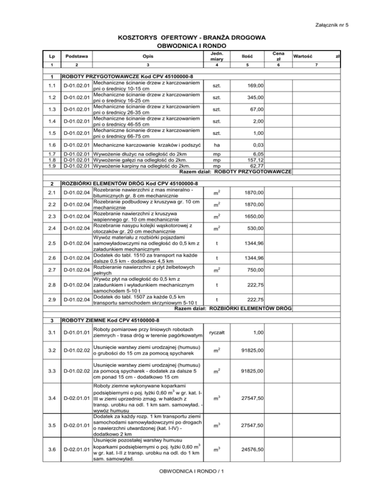 Załącznik nr 5 KOSZTORYS OFERTOWY - BRANśA DROGOWA OBWODNICA I RONDO Lp Podstawa Opis Jedn. miary Ilość Cena zł 1 2 3 4 5 6 1 1.1 1.2 1.3 1.4 1.5 ROBOTY PRZYGOTOWAWCZE Kod CPV 45100000-8 Mechaniczne ścinanie drzew z karczowaniem D-01.02.01 pni o średnicy 10-15 cm Mechaniczne ścinanie drzew z karczowaniem D-01.02.01 pni o średnicy 16-25 cm Mechaniczne ścinanie drzew z karczowaniem D-01.02.01 pni o średnicy 26-35 cm Mechaniczne ścinanie drzew z karczowaniem D-01.02.01 pni o średnicy 46-55 cm Mechaniczne ścinanie drzew z karczowaniem D-01.02.01 pni o średnicy 66-75 cm szt. 169,00 szt. 345,00 szt. 67,00 szt. 2,00 szt. 1,00 0,03 1.6 D-01.02.01 Mechaniczne karczowanie krzaków i podszyć ha 1.7 1.8 1.9 D-01.02.01 WywoŜenie dłuŜyc na odległość do 2km D-01.02.01 WywoŜenie gałęzi na odległość do 2km. D-01.02.01 WywoŜenie karpiny na odległość do 2km. Razem dział: mp 6,05 mp 157,12 mp 62,77 ROBOTY PRZYGOTOWAWCZE 2 2.1 2.2 2.3 2.4 2.5 2.6 2.7 2.8 2.9 3 ROZBIÓRKI ELEMENTÓW DRÓG Kod CPV 45100000-8 Rozebranie nawierzchni z mas mineralno D-01.02.04 1870,00 m2 bitumicznych gr. 8 cm mechanicznie Rozebranie podbudowy z kruszywa gr. 10 cm D-01.02.04 1870,00 m2 mechanicznie Rozebranie nawierzchni z kruszywa 1650,00 D-01.02.04 m2 wapiennego gr. 10 cm mechanicznie Rozebranie nasypu kolejki wąskotorowej z D-01.02.04 530,00 m2 otoczaków gr. 20 cm mechanicznie Wywóz materiału z rozbiórki pojazdami D-01.02.04 samowyładowczymi na odległość do 0,5 km z t 1344,96 załadunkiem mechanicznym Dodatek do tabl. 1510 za transport na kaŜde D-01.02.04 t 1344,96 dalsze 0,5 km - dodatkowo 4,5 km Rozbieranie nawierzchni z płyt Ŝelbetowych 2 D-01.02.04 750,00 m pełnych Wywóz płyt na odległość do 0,5 km z D-01.02.04 załadunkiem i wyładunkiem mechanicznym t 222,75 samochodem 5-10 t Dodatek do tabl. 1507 za kaŜde 0,5 km D-01.02.04 t 222,75 transportu samochodem skrzyniowym 5-10 t Razem dział: ROZBIÓRKI ELEMENTÓW DRÓG ROBOTY ZIEMNE Kod CPV 45100000-8 3.1 D-01.01.01 Roboty pomiarowe przy liniowych robotach ziemnych - trasa dróg w terenie pagórkowatym ryczałt 3.2 D-01.02.02 Usunięcie warstwy ziemi urodzajnej (humusu) o grubości do 15 cm za pomocą spycharek m2 91825,00 3.3 Usunięcie warstwy ziemi urodzajnej (humusu) D-01.02.02 za pomocą spycharek - dodatek za dalsze 5 cm ponad 15 cm - dodatkowo 15 cm m2 91825,00 m3 27547,50 m3 27547,50 m3 24576,50 3.4 3.5 3.6 Roboty ziemne wykonywane koparkami podsiębiernymi o poj. łyŜki 0,60 m3 w gr. kat. ID-02.01.01 III w ziemi uprzednio zmag. w hałdach z transp. urobku na odl. 1 km sam. samowyład. wywóz humusu Dodatek za kaŜdy rozp. 1 km transportu ziemi samochodami samowyładowczymi po drogach D-02.01.01 o nawierzchni utwardzonej (kat. I-IV) dodatkowo 2 km Usunięcie pozostałej warstwy humusu koparkami podsiębiernymi o poj. łyŜki 0,60 m3 D-02.01.01 w gr. kat. I-II z transp. urobku na odl. do 1 km sam. samowyład. OBWODNICA I RONDO / 1 1,00 Wartość zł 7 Załącznik nr 5 KOSZTORYS OFERTOWY - BRANśA DROGOWA OBWODNICA I RONDO Lp Podstawa 1 2 3.7 D-02.01.01 3.8 D-02.01.01 3.9 D-02.01.01 3.10 D-02.01.01 3.11 D-02.01.01 3.12 D-02.03.01 3.13 D-02.03.01 3.14 D-02.01.01d 3.15 D-02.01.01d 4 4.1 4.2 4.3 4.4 4.5 4.6 4.7 4.8 Opis Jedn. miary Ilość Cena zł 3 4 5 6 Dodatek za kaŜdy rozp. 1 km transportu ziemi samochodami samowyładowczymi po drogach o nawierzchni utwardzonej (kat. I-IV) dodatkowo 2 km Roboty ziemne wykonywane koparkami podsiębiernymi o poj. łyŜki 0,60 m3 w gr. kat. III-IV z transportem urobku na odl.do 1 km sam.samowyład. Dodatek za kaŜdy rozp. 1 km transportu ziemi samochodami samowyładowczymi po drogach o nawierzchni utwardzonej (kat. I-IV)dodatkowo 2 km Odspojenie i przewóz gruntu taczkami na odl.do 10 m w gr.kat. III Roboty ziemne wykonywane koparkami podsiębiernymi o poj.łyŜki 0,60 m3 w gr.kat. IIII w ziemi uprzednio zmag.w hałdach z transp.urobku na odl. 1 km sam.samowyład. wywóz ziemi po ręcznych wykopach Formowanie nasypów spycharkami w gruncie kat. III - grunt z wykopów Zagęszczanie nasypów walcami samojezdnymi wibracyjnymi; grunt spoisty kat. III Warstwa separująca z geowłókniny Terram 3000 Warstwa wzmacniająca z siatki Raugrid 8/8 PODBUDOWY Kod CPV 45233000-9 Profilowanie i zagęszczanie podłoŜa D-04.01.01 wykonywane mechanicznie w gruncie kat. II-IV pod warstwy konstrukcyjne nawierzchni Stabilizacja gruntu cementem gr. 15 cm D-04.05.01 Rm=2,5 Mpa Warstwa podbudowy z kruszyw łamanych gr. D-04.04.02 20 cm Oczyszczenie mechaniczne podbudowy z D-04.03.01 kruszywa D-04.03.01 Skropienie emulsją asfaltową Podbudowa zasadnicza z betonu asfaltowego D-04.07.01 gr. 7 cm Oczyszczenie mechaniczne podbudowy D-04.03.01 bitumicznej Skropienie emulsją asfaltową pod warstwę D-04.03.01 wiąŜącą m 3 24576,50 m 3 92439,80 m 3 30384,70 m 3 300,00 m3 300,00 m3 62055,00 m3 62055,00 m2 3095,00 2 3095,00 m Razem dział: ROBOTY ZIEMNE m2 32327,98 m2 32327,98 m2 30496,86 m2 27184,18 m 2 27184,18 m 2 27184,18 m2 26807,36 m2 26807,36 Razem dział: PODBUDOWY 5 5.1 NAWIERZCHNIE Kod CPV 45233000-9 Warstwa wiąŜąca z betonu asfaltowego gr. 6 D-05.03.05 cm m2 26817,36 5.2 D-04.03.01 Oczyszczenie mechaniczne warstwy wiąŜącej m2 26444,86 5.3 D-04.03.01 Skropienie warstwy wiąŜącej emulsją asfaltową Warstwa ścieralna z mastyksu grysowego D-05.03.13 SMA gr. 5 cm m2 26444,86 m2 26444,86 m2 192,00 5.4 5.5 Droga dojazdowa z płyt Ŝelbetowych na D-10.03.01 podsypce piaskowej gr. 15 cm - płyty z odzysku, kruszywo na podbudowę z odzysku Razem dział: NAWIERZCHNIE 6 ELEMENTY DROGI - KRAWĘśNIKI Kod CPV 45233100-0 OBWODNICA I RONDO / 2 Wartość zł 7 Załącznik nr 5 KOSZTORYS OFERTOWY - BRANśA DROGOWA OBWODNICA I RONDO Lp Podstawa 1 2 6.1 D-08.01.01 6.2 D-08.01.01 6.3 D-08.01.02 6.4 D-08.01.01 6.5 D-08.03.01 7 7.1 7.2 Opis Jedn. miary Ilość Cena zł 3 4 5 6 Wartość 8.1 9 9.1 9.2 ELEMENTY DROGI - CHODNIKI I WYSPY KANALIZUJĄCE RUCH Z KOSTKI BRUKOWEJ BETONOWEJ Chodniki z kostki betonowej szarej 