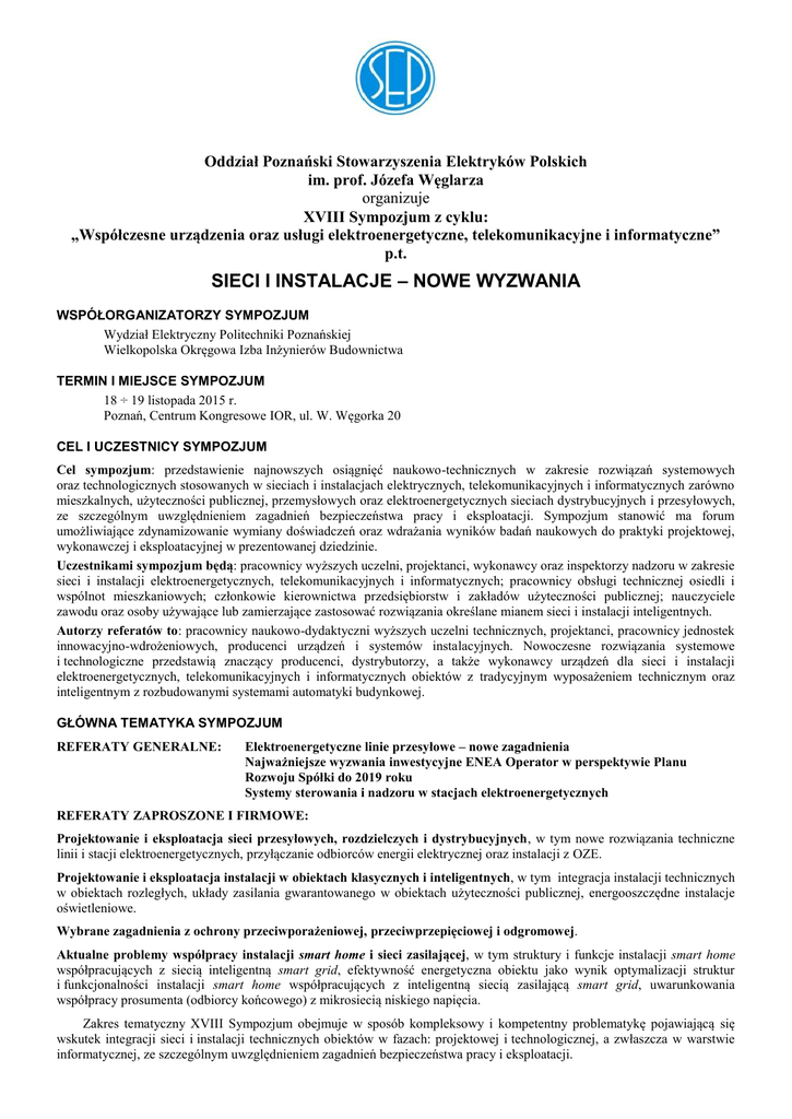 Oddział Poznański Stowarzyszenia Elektryków Polskich im. prof. Józefa Węglarza organizuje XVIII Sympozjum z cyklu: „Współczesne urządzenia oraz usługi elektroenergetyczne, telekomunikacyjne i informatyczne” p.t. SIECI I INSTALACJE – NOWE WYZWANIA WSPÓŁORGANIZATORZY SYMPOZJUM Wydział Elektryczny Politechniki Poznańskiej Wielkopolska Okręgowa Izba Inżynierów Budownictwa TERMIN I MIEJSCE SYMPOZJUM 18 ÷ 19 listopada 2015 r. Poznań, Centrum Kongresowe IOR, ul. W. Węgorka 20 CEL I UCZESTNICY SYMPOZJUM Cel sympozjum: przedstawienie najnowszych osiągnięć naukowo-technicznych w zakresie rozwiązań systemowych oraz technologicznych stosowanych w sieciach i instalacjach elektrycznych, telekomunikacyjnych i informatycznych zarówno mieszkalnych, użyteczności publicznej, przemysłowych oraz elektroenergetycznych sieciach dystrybucyjnych i przesyłowych, ze szczególnym uwzględnieniem zagadnień bezpieczeństwa pracy i eksploatacji. Sympozjum stanowić ma forum umożliwiające zdynamizowanie wymiany doświadczeń oraz wdrażania wyników badań naukowych do praktyki projektowej, wykonawczej i eksploatacyjnej w prezentowanej dziedzinie. Uczestnikami sympozjum będą: pracownicy wyższych uczelni, projektanci, wykonawcy oraz inspektorzy nadzoru w zakresie sieci i instalacji elektroenergetycznych, telekomunikacyjnych i informatycznych; pracownicy obsługi technicznej osiedli i wspólnot mieszkaniowych; członkowie kierownictwa przedsiębiorstw i zakładów użyteczności publicznej; nauczyciele zawodu oraz osoby używające lub zamierzające zastosować rozwiązania określane mianem sieci i instalacji inteligentnych. Autorzy referatów to: pracownicy naukowo-dydaktyczni wyższych uczelni technicznych, projektanci, pracownicy jednostek innowacyjno-wdrożeniowych, producenci urządzeń i systemów instalacyjnych. Nowoczesne rozwiązania systemowe i technologiczne przedstawią znaczący producenci, dystrybutorzy, a także wykonawcy urządzeń dla sieci i instalacji elektroenergetycznych, telekomunikacyjnych i informatycznych obiektów z tradycyjnym wyposażeniem technicznym oraz inteligentnym z rozbudowanymi systemami automatyki budynkowej. GŁÓWNA TEMATYKA SYMPOZJUM REFERATY GENERALNE: Elektroenergetyczne linie przesyłowe – nowe zagadnienia Najważniejsze wyzwania inwestycyjne ENEA Operator w perspektywie Planu Rozwoju Spółki do 2019 roku Systemy sterowania i nadzoru w stacjach elektroenergetycznych REFERATY ZAPROSZONE I FIRMOWE: Projektowanie i eksploatacja sieci przesyłowych, rozdzielczych i dystrybucyjnych, w tym nowe rozwiązania techniczne linii i stacji elektroenergetycznych, przyłączanie odbiorców energii elektrycznej oraz instalacji z OZE. Projektowanie i eksploatacja instalacji w obiektach klasycznych i inteligentnych, w tym integracja instalacji technicznych w obiektach rozległych, układy zasilania gwarantowanego w obiektach użyteczności publicznej, energooszczędne instalacje oświetleniowe. Wybrane zagadnienia z ochrony przeciwporażeniowej, przeciwprzepięciowej i odgromowej. Aktualne problemy współpracy instalacji smart home i sieci zasilającej, w tym struktury i funkcje instalacji smart home współpracujących z siecią inteligentną smart grid, efektywność energetyczna obiektu jako wynik optymalizacji struktur i funkcjonalności instalacji smart home współpracujących z inteligentną siecią zasilającą smart grid, uwarunkowania współpracy prosumenta (odbiorcy końcowego) z mikrosiecią niskiego napięcia. Zakres tematyczny XVIII Sympozjum obejmuje w sposób kompleksowy i kompetentny problematykę pojawiającą się wskutek integracji sieci i instalacji technicznych obiektów w fazach: projektowej i technologicznej, a zwłaszcza w warstwie informatycznej, ze szczególnym uwzględnieniem zagadnień bezpieczeństwa pracy i eksploatacji. SESJA WARSZTATOWA Sesjom referatowym XVIII Sympozjum towarzyszyć będzie tradycyjnie sesja warsztatowa, na której przedstawiciele producentów, dystrybutorów i wykonawców urządzeń i systemów instalacji zaprezentują nowoczesne rozwiązania techniczne i technologiczne związane tematycznie z programem sympozjum. RADA PROGRAMOWA SYMPOZJUM: Dr hab. inż. Zbigniew Nadolny, prof. nadzw., Dziekan Wydziału Elektrycznego Politechniki Poznańskiej – przewodniczący Prof. dr hab. inż. Władysław Opydo, Politechnika Poznańska, Członek Zarządu OP SEP Prof. dr hab. inż. Aleksandra Rakowska, Politechnika Poznańska, Przewodnicząca Sekcji Energetyki OP SEP Mgr inż. Stefan Granatowicz, Wiceprezes Zarządu Głównego SEP Mgr inż. Kazimierz Pawlicki, Prezes OP SEP Mgr inż. Jan Chrzanowski, Przewodniczący Sekcji Telekomunikacji i Elektroniki OP SEP Dr inż. Ryszard Niewiedział, Wiceprezes ZO i Przew. Sekcji Instalacji i Urządzeń Elektrycznych OP SEP – sekretarz Dr inż. Eugeniusz Sroczan, Politechnika Poznańska – redaktor materiałów sympozjum INFORMACJE DLA CZYNNYCH UCZESTNIKÓW SYMPOZJUM WYSTAWY I PREZENTACJE FIRM Prezentacja firmy obejmować może: Wygłoszenie referatu (zamieszczonego w materiałach sympozjum) lub komunikatu firmowego podczas obrad. Wystawienie eksponatów, plansz i ofert na wystawie towarzyszącej sympozjum. Przeprowadzenie warsztatów i opcjonalnie pokazu własnych urządzeń w miejscu ich użytkowania. TERMINY Zgłoszenie udziału Firmy w XVIII Sympozjum na załączonym formularzu do 15 września 2015r. Zgłoszenie referatu indywidualnego lub firmowego do 15 września 2015 r. Potwierdzenie przyjęcia referatu do 30 września 2015 r. Nadesłanie pełnego tekstu referatu do 15 października 2015 r. INFORMACJA DLA AUTORÓW REFERATÓW Zgłoszenie referatu – autor/autorzy, tytuł, krótkie streszczenie – należy przesłać do dnia 15 września 2015 r. na adres OP SEP (e-mail: [email protected]) lub dr inż. Eugeniusza Sroczana (e-mail: [email protected]). Pełne teksty referatów przesłane na adres OP SEP lub dr inż. Eugeniusza Sroczana do dnia 15 października 2015 r
