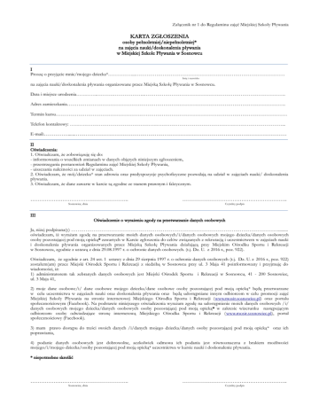 Załącznik nr 1 do Regulaminu zajęć Miejskiej Szkoły Pływania KARTA ZGŁOSZENIA osoby pełnoletniej/niepełnoletniej* na zajęcia nauki/doskonalenia pływania w Miejskiej Szkole Pływania w Sosnowcu I Proszę o przyjęcie mnie/mojego dziecka*……………...………………………………………………………………………………… Imię i nazwisko na zajęcia nauki/doskonalenia pływania organizowane przez Miejską Szkołę Pływania w Sosnowcu. Data i miejsce urodzenia…………..……….………………..……………………………………………………………………………. Adres zamieszkania………………………………………………………………………………………………………………………. Termin kursu……………………………………………………………………………………………………………………………… Telefon kontaktowy: ……………………………………………………………………………………………………………………... E-mail:……………......…………………………………………………………………………………………………………………… II Oświadczenia: 1. Oświadczam, że zobowiązuję się do: - informowania o wszelkich zmianach w danych objętych niniejszym zgłoszeniem, - przestrzegania postanowień Regulaminu zajęć Miejskiej Szkoły Pływania, - uiszczania należności za udział w zajęciach. 2. Oświadczam, że mój/dziecka* stan zdrowia oraz predyspozycje psychofizyczne pozwalają na udział w zajęciach nauki/ doskonalenia pływania. 3. Oświadczam, że dane zawarte w karcie są zgodne ze stanem prawnym i faktycznym. ………………………………………………. Sosnowiec, dnia III ………………………………………………….. Czytelny podpis Oświadczenie o wyrażeniu zgody na przetwarzanie danych osobowych Ja, niżej podpisana(y) …………………………………………………………………………………………………………………......... oświadczam, iż wyrażam zgodę na przetwarzanie moich danych osobowych/i/danych osobowych mojego dziecka/danych osobowych osoby pozostającej pod moją opieką* zawartych w Karcie zgłoszenia do celów związanych z rekrutacją i uczestnictwem w zajęciach nauki i doskonalenia pływania organizowanych przez Miejską Szkołę Pływania działającą przy Miejskim Ośrodku Sportu i Rekreacji w Sosnowcu, zgodnie z ustawą z dnia 29.08.1997 r. o ochronie danych osobowych. (t.j. Dz. U. z 2016 r., poz. 922). Oświadczam, że zgodnie z art. 24 ust. 1 ustawy z dnia 29 sierpnia 1997 r. o ochronie danych osobowych (t.j. Dz. U. z 2016 r., poz. 922) zostałem(am) przez Miejski Ośrodek Sportu i Rekreacji z siedzibą w Sosnowcu przy ul. 3 Maja 41 poinformowany i przyjmuję do wiadomości, iż: 1) administratorem tak zebranych danych osobowych jest Miejski Ośrodek Sportu i Rekreacji w Sosnowcu, 41 - 200 Sosnowiec, ul. 3 Maja 41, 2) moje dane osobowe/i/ dane osobowe mojego dziecka/dane osobowe osoby pozostającej pod moją opieką* będą przetwarzane w celu uczestnictwa w zajęciach nauki oraz doskonalenia pływania oraz będą udostępniane innym odbiorcom w celu promocji zajęć Miejskiej Szkoły Pływania na stronie internetowej Miejskiego Ośrodka Sportu i Rekreacji (www.mosir.sosnowiec.pl) oraz portalu społecznościowym (Facebook). Na podstawie niniejszego oświadczenia wyrażam zgodę na udostępnienie moich danych osobowych / i/ danych osobowych mojego dziecka/danych osobowych osoby pozostającej pod moją opieką* w zakresie wizerunku następującym odbiorcom: osoby odwiedzające stronę internetową Miejskiego Ośrodka Sportu i Rekreacji (www.mosir.sosnowiec.pl), portal społecznościowy (Facebook). 3) mam prawo dostępu do treści swoich danych /i/danych mojego dziecka/danych osoby pozostającej pod moją opieką* oraz ich poprawiania, 4) podanie danych osobowych jest dobrowolne, aczkolwiek odmowa ich podania jest równoznaczna z brakiem możliwości mojego/i/mojego dziecka/osoby pozostającej pod moją opieką* uczestnictwa w kursie nauki i doskonalenie pływania. * niepotrzebne skreślić ………………………………………………. Sosnowiec, dnia ………………………………………………….. Czytelny podpis