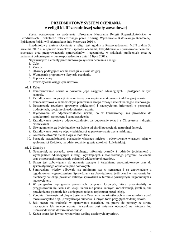 PRZEDMIOTOWY SYSTEM OCENIANIA z religii kl. III zasadniczej szkoły zawodowej Został opracowany na podstawie ,,Programu Nauczania Religii Rzymskokatolickiej w Przedszkolach i Szkołach” zatwierdzonego przez Komisję Wychowania Katolickiego Konferencji Episkopatu Polski w Białymstoku z dniu 9 czerwca 2010 r. Przedmiotowy System Oceniania z religii jest zgodny z Rozporządzeniem MEN z dnia 30 kwietnia 2007 r. w sprawie warunków i sposobu oceniania, klasyfikowania i promowania uczniów i słuchaczy oraz przeprowadzania sprawdzianów i egzaminów w szkołach publicznych oraz ze zmianami dokonanymi w tym rozporządzeniu z dnia 13 lipca 2007 r. Najważniejsze elementy przedmiotowego systemu oceniania z religii: 1. Cele. 2. Zasady. 3. Obszary podlegające ocenie z religii w klasie drugiej. 4. Wymagania programowe i kryteria oceniania. 5. Poprawa oceny. 6. Przewidywane osiągnięcia uczniów. ad. 1. Cele: 1. Poinformowanie ucznia o poziomie jego osiągnięć edukacyjnych i postępach w tym zakresie. 2. Kształtowanie motywacji do uczenia się oraz wspieranie aktywności edukacyjnej ucznia. 3. Pomoc uczniowi w samodzielnym planowaniu swego rozwoju intelektualnego i duchowego. 4. Dostarczanie rodzicom (prawnym opiekunom) i nauczycielom informacji o postępach, trudnościach, specjalnych uzdolnieniach ucznia. 5. Wychowanie do odpowiedzialności ucznia, co w konsekwencji ma prowadzić do samokontroli, samooceny i samokształcenia. 6. Kształtowanie postawy odpowiedzialności za budowanie relacji z Chrystusem i drugim człowiekiem. 7. Uświadomienie, że życie ludzkie jest święte od chwili poczęcia do naturalnej śmierci. 8. Kształtowanie postawy odpowiedzialności za przekazywanie życia ludzkiego. 9. Gotowość otwarcia się na Boga w modlitwie. 10. Poczucie przynależności, posiadanie własnego miejsca i odczytywanie własnych zdań w społeczności Kościoła, narodzie, rodzinie, grupie szkolnej i koleżeńskiej. ad. 2. Zasady : 1. Nauczyciel, na początku roku szkolnego, informuje uczniów i rodziców (opiekunów) o wymaganiach edukacyjnych z religii wynikających z realizowanego programu nauczania oraz o sposobach sprawdzania osiągnięć edukacyjnych uczniów. 2. Uczeń jest zobowiązany do noszenia zeszytu i katechizmu przedmiotowego oraz do systematycznego odrabiania prac domowych. 3. Sprawdziany wiedzy odbywają się minimum raz w semestrze i są zapowiadane z tygodniowym wyprzedzeniem. Sprawdziany są obowiązkowe, jeśli uczeń w tym czasie był nieobecny na lekcji, powinien zaliczyć sprawdzian w terminie późniejszym, uzgodnionym z nauczycielem. 4. W przypadku wystąpienia poważnych przyczyn losowych, które przeszkodziły w przygotowaniu się ucznia do lekcji, uczeń nie ponosi żadnych konsekwencji, jeżeli są one potwierdzone pisemnie lub ustnie przez rodzica (opiekuna) przed lekcją. 5. Zgodnie z Wewnątrzszkolnym Systemem Oceniania i na określonych w nim zasadach uczeń może skorzystać z np. ,,szczęśliwego numerka” i innych form przyjętych w danej szkole. 6. Jeśli uczeń ma trudności w opanowaniu materiału, ma prawo do pomocy ze strony nauczyciela lub innego ucznia. Warunkiem jest aktywna obecność na lekcjach lub usprawiedliwiona dłuższa nieobecność. 7. Każda ocena jest jawna i wystawiana według ustalonych kryteriów. 1 8. O ocenie niedostatecznej śródrocznej czy rocznej uczeń informowany jest ustnie, a jego rodzice (opiekunowie) w formie pisemnej na miesiąc przed radą pedagogiczną klasyfikacyjną. Za pisemne poinformowanie rodzica (opiekuna) odpowiada wychowawca. 9. Na 7 dni przed posiedzeniem klasyfikacyjnym rady pedagogicznej uczniowie są informowani o przewidywanych ocenach śródrocznych lub rocznych. 10. Kryteria odpowiadające poszczególnym śródrocznym i rocznym stopniom szkolnym zgodne są z Wewnątrzszkolnym Systemem Oceniania. ad. 3. Obszary podlegające ocenianiu na katechezie w klasie III: Formy ustne: Odpowiedzi ustne Opowiadania odtwórcze i twórcze Prezentacja (referat, prezentacja multimedialna) Formy pisemne: Sprawdziany, testy, kartkówki Zadania domowe Wypracowania (opowiadanie, charakterystyka, list, zaproszenie, telegram) Ćwiczenia wykonane podczas lekcji Formy praktyczne: Realizacja projektów (np. album, gazetka, przedstawienia) Podejmowanie działań wynikających z głównego celu katechezy szkolnej Pomoce dydaktyczne Rozwijanie postawy religijnej (np. udział w przedstawieniach szkolnych o charakterze religijnym, konkursach religijnych, poszerzanie wiadomości o literaturę religijną, korzystanie ze stron internetowych o tematyce religijnej). Aktywność ucznia na lekcji i współpraca w zespole. Uczeń ma obowiązek: Prowadzić zeszyt przedmiotowy. Zaliczyć wszystkie sprawdziany i testy. W razie nieobecności na sprawdzianie lub teście zaliczyć pracę w ciągu 2 tygodni od dnia powrotu do szkoły. Poprawić ocenę niedostateczną w ciągu tygodnia od otrzymania wyników sprawdzianu wiedzy. Dodatkowo uczeń może: Za prace typu: projekty, albumy, prezentacje multimedialne uzyskać dodatkowe oceny (od dobrej do celującej po wcześniejszym uzgodnieniu z nauczycielem). Za zajęcie I, II, III miejsca lub wyróżnienia w konkursach religijnych otrzymać ocenę celującą. Za bardzo dobre wyniki nauczania, zajęcie najwyższych miejsc lub wyróżnień w konkursach przedmiotowych z religii (np. Konkurs Biblijny, Olimpiada Teologii Katolickiej) na etapie dekanalnym, diecezjalnym, ogólnopolskim otrzymać ocenę celującą śródroczną lub końcoworoczną. Katecheta ma obowiązek: Powiadomić ucznia o sprawdzianie lub teście na 1 tydzień przed terminem. Sprawdzić prace pisemne w ciągu 2 tygodni, w razie potrzeby z wynikami testu zapoznać rodziców w czasie konsultacji lub Dni Otwartych Szkoły. Udzielać informacji rodzicom i uczniom na temat prac pisemnych i postępów ucznia. Nauczyciele dostosowują wymagania do indywidualnych możliwości ucznia, uwzględniając przy tym rodzaj dysfunkcji: W przypadku dyso