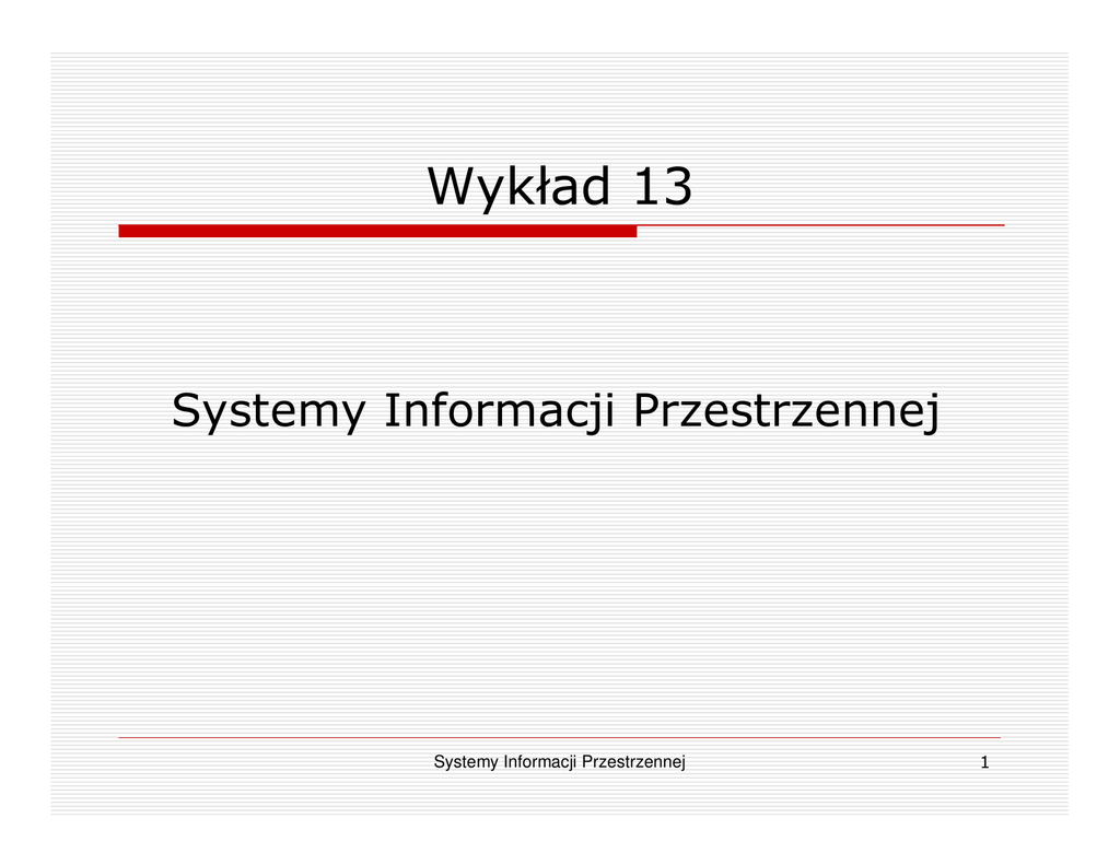 Wykład 13 Systemy Informacji Przestrzennej Systemy Informacji Przestrzennej 1 Mapa jako element Systemu Informacji Geograficznej Systemy Informacyjne Systemy Informacji przestrzennej Systemy Informacji Geograficznej ‘małe skale’ Systemy Informacji Terenowej Systemy Informacji Przestrzennej ‘duże skale’ 2 Mapa obiektowa Mapa obiektowa nie jest ideą nową –jest tak starą jak sama mapa. Co widzimy na mapie wykonanej na papierze? Budynek, droga, działka, przewody – obiekty te natychmiast interpretuje nasz mózg. Praktycznie są to kreski i napisy, które przedstawiają obiekty istniejące w rzeczywistości. I jest to cel istnienia mapy – przedstawienie obiektów rzeczywistego świata. Systemy Informacji Przestrzennej 3 Zalety mapy komputerowej 1. Dokonywanie dowolnej ilości kopii, 2. Selekcja treści, wybór warstw tematycznych, 3. Poprawa jakości, 4. Uproszczenie przeskalowania, ale nie generalizacji, 5. Przyspieszenie aktualizacji, ale nie automatycznie, 6. Proste analizy – ale w ograniczonym zakresie. Systemy Informacji Przestrzennej 4 Ograniczenia mapy komputerowej Elementy graficzne powiązane są jedynie wizualnie i nie ma możliwości sprawnego i pewnego wyszukiwania i agregowania informacji. Sytuacja zmienia się diametralnie gdy obiekty „widziane” są przez oprogramowanie. Stworzona z takich obiektów numeryczna mapa obiektowa ma nową jakość. Systemy Informacji Przestrzennej 5 Numeryczna mapa obiektowa MN jest to mapa komputerowa, zawierająca elementy, które tworzą obiekty rozpoznawalne przez oprogramowanie, o zaletach: 1. łatwość i pewność aktualizacji, 2. bogate możliwości analiz, porównań, kontroli, 3. automatyzacja prac. Wady – jest jedna – koszt. Systemy Informacji Przestrzennej 6 Jednostka przestrzenna - obiekt typ atrybuty czas obiekt wektor geometria relacje raster Systemy Informacji Przestrzennej 7 Charakterystyka podanych własności Położenie – jednostka zajmuje obszar w przestrzeni i można ją zlokalizować poprzez współrzędne, Przynależność do typu – jednostki można łączyć w grupy, np. jeziora rynnowe, ... Atrybuty – opisują ich podstawowe własności, Relacje – 1:1 (one to one), np tylko 1 miast jest stolicą kraju, ale do jednego powiatu należy wiele gmin Czas – pozwala monitorować ewolucję jednostek Systemy Informacji Przestrzennej 8 Nowoczesne techniki pozyskiwania danych terenowych Pomiary satelitarne GPS Pomiary elektronicznymi tachimetrami z rejestratorami polowymi Opracowanie numeryczne map wraz z tworzeniem baz danych. Systemy Informacji Przestrzennej 9 Współczesne technologie pozyskiwania danych Digitalizacja inaczej cyfrowanie konwersja danych z postaci analogowej na cyfrową Skanowanie z wektoryzacją - konwersja danych rastrowych na dane wektorowe Bezpośrednie pomiary w terenie Metoda kombinowana Systemy Informacji Przestrzennej 10 Inne źródła pozyskiwania danych Stereodigitalizacja zdjęć lotniczych Pliki współrzędnych Niekartometryczne materiały archiwalne, jak: - szkice, - wykazy, - zarysy. Systemy Informacji Przestrzennej 11 Podstawowe funkcje Systemu Informacji Przestrzennej Przetwarzanie danych Wprowadzanie danych Zarządzanie bazą danych Systemy Informacji Przestrzennej Wyprowadzanie danych 12 SIP podstawowe elementy systemu sprzęt, oprogramowanie, instytucje, tj. ludzie i organizacje, dane. Systemy Informacji Przestrzennej 13 Struktura GIS Organizacja zarządzanie wprowadzanie przetwarzanie prezentacja gromadzenie Dane przestrzenne użytkownicy 14 Systemy Informacji Przestrzennej NMT- prekursor systemów geoinformatycznych Systemy Informacji Przestrzennej 15 System Informacji Przestrzennej Systemy Informacji Przestrzennej 16 Podstawowe pojęcia związane z tworzeniem mapy cyfrowej Obiekt = informacja topologiczna + informacja geometryczna Atrybut = informacja tematyczna Głównym zadaniem GIS jest powiązanie obiektu z atrybutami. Systemy Informacji Przestrzennej 17 Klasyfikacja Każda mapa cyfrowa jest zwykle podzielona na warstwy, grupujące obiekty o tych samych cechach, opisane przez własny zestaw atrybutów. Aby ułatwić orientację na mapie warto wprowadzić klasyfikację obiektów. Systemy Informacji Przestrzennej 18 Warstwa z drogami 1. Mapa bez klasyfikacji /wszystkie drogi wyglądają tak samo/ 2. Mapa z włączoną klasyfikacją /rozróżnienie dróg za pomocą grubości i koloru linii/ 1 2 Systemy Informacji Przestrzennej 19 SIP - integracja danych Multimedia GPS SIP Teledetekcja Mapy Pomiary terenowe Systemy Informacji Przestrzennej 20 SIP - modele danych Podział danych na warstwy informacyjne Modele rastrowe, Modele wektorowe - topologiczne - nietopologiczne. Systemy Informacji Przestrzennej 21 Geokodowanie Adresy to popularna forma przechowywania danych geograficznych. W związku z tym istnieje funkcja pozwalająca na automatyczne umieszczanie na mapie dowolnych obiektów na podstawie ich adresu bez znajomości współrzędnych. Systemy Informacji Przestrzennej 22 Dokładność mapy Dokładność mapy nie jest związana z jej stopniem szczegółowości. Szczegółowość jest cechą, którą można łatwo zmienić; jeśli mapa przestaje być czytelna zmniejszamy liczbę pokazywanych obiektów lub ich opisów. Dokładność natomiast jest cechą nadaną w trakcie jej tworzenia, nie zależy od bieżącej skali, a jedynie dokładności materiałów i procesu ich wprowadzania do komputera oraz rozdzielczości ekranu, a wydrukowana od rozdzielczości użytej drukarki. Systemy Informacji Przestrzennej 23 Rozdzielczość – związana jest z dokładnością I zależy od; 1. Metody użytej przy tworzeniu mapy 2. Rodzaju użytych symboli 3. Sposobu drukowania lub wyświetlania. Tworząc mapę rastrową skanujemy materiały źródłowe z rozdzielczością 300dpi /dots per inch/ i otrzymana mapa ma tą samą rozdz. Tworząc mapę wektorową rysujemy linią o pewnej grubości niezależnie od bieżącej skali i linia o grubości 1mm w różnych skalach oznacz