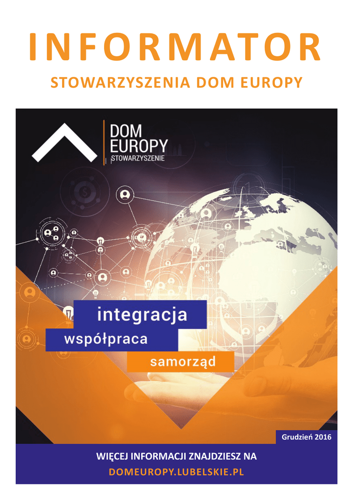 I N F O R M AT O R STOWARZYSZENIA DOM EUROPY Nr 2/2016 Grudzień 2016 WIĘCEJ INFORMACJI ZNAJDZIESZ NA DOMEUROPY.LUBELSKIE.PL Życzenia Świąteczne Szanowni Państwo Z okazji nadchodzących Świąt Bożego Narodzenia składamy życzenia zdrowia, pogody ducha oraz spełnienia marzeń. Niech będzie to czas pełen ciepła, wzajemnego zrozumienia i prawdziwej radości. Życzymy, aby Nowy Rok obfitował w szczęśliwe wydarzenia i przyniósł wiele satysfakcji w życiu rodzinnym i zawodowym W imieniu Zarządu i pracowników Stowarzyszenia Dom Europy Radosław Dudziński Prezes Zarządu Stowarzyszenia 2 Podsumowanie Forum Cyfryzacji Województwa Lubelskiego W dniu 18 listopada 2016r. w Lubelskim Centrum Konferencyjnym w Lublinie odbyło się I Forum Cyfryzacji Województwa Lubelskiego zorganizowane przez Europejskie Centrum Integracji i Współpracy Samorządowej „Dom Europy”. Współorganizatorami Forum byli Urząd Marszałkowski w Lublinie i Lubelski Inkubator Technologii Informatycznych. Forum Cyfryzacji Województwa Lubelskiego było odpowiedzią na aktualne potrzeby jednostek samorządu terytorialnego związane z rozwojem cyfryzacji i wprowadzaniem nowych rozwiązań technologicznych w samorządach. Zgodnie z hasłem przewodnim forum: „Samorząd Jutra Zaczyna Się Dziś” duży nacisk położyliśmy na tematykę dotyczącą obsługi przedsiębiorców i inwestorów z wykorzystaniem narzędzi cyfrowych oraz poprawę jakości usług publicznych świadczonych przez JST. Samorządowcy podczas forum mogli dowiedzieć się również, jak skutecznie pozyskiwać i inwestować unijne środki na wprowadzanie nowych technologii usprawniających działanie instytucji. Dodatkowo w strefie prezentacji firm ICT zapewniliśmy uczestnikom możliwość nawiązania współpracy i zapoznania się z szeroką ofertą regionalnych reprezentantów firm informatycznych. 3 W tegorocznym Forum wzięło udział ponad 150 uczestników, w tym przedstawiciele jednostek samorządu terytorialnego z województwa lubelskiego, a także przedstawiciele firm z branży informatycznej z całego regionu. Patronat Honorowy nad Forum objęli Krzysztof Hetman – Poseł do Parlamentu Europejskiego, Sławomir Sosnowski – Marszałek Województwa Lubelskiego, Krzysztof Żuk – Prezydent Miasta Lublin oraz Ministerstwo Cyfryzacji i Wyższa Szkoła Przedsiębiorczości i Administracji w Lublinie. Relacja i prezentacje z forum dostępne są na stronie forumcyfryzacji.pl 4 Podsumowanie szkoleń z pisania projektów międzynarodowych Stowarzyszenie „Dom Europy” we współpracy z Fundacją Edukacyjnych zorganizowało bezpłatne warsztaty i szkolenie Alternatywnych Inicjatyw „Jak zaplanować, napisać i zrealizować projekt międzynarodowy”. Warsztaty obyły się w Urzędzie Marszałkowskim Województwa Lubelskiego w dniach 28-30 października. Grupą docelową byli członkowie, pracownicy, współpracownicy i wolontariusze organizacji pozarządowych, planujących realizację projektów międzynarodowych z województwa lubelskiego. Podczas szkoleń uczestnicy mieli okazję zdobyć podstawowa wiedzę i nabyć umiejętności związane z planowaniem i realizacją partnerskich projektów międzynarodowych oraz pozyskiwaniem na nie dofinansowań. Szkolenie realizowane było w ramach projektu "Wiemy czego chcemy. Sieć realizatorów projektów międzynarodowych" dofinansowanego w ramach programu FIO 2014-2020. 5 Spotkanie z przedstawicielami Prowincji Gelderland W dniu 13 października przedstawiciele Zarządu Stowarzyszenia "Dom Europy" spotkali się z oficjalną delegacją holenderskiej prowincji Gelderland z Komisarzem Króla - Celmens'em Cornielje na czele. Na spotkaniu zostały przedstawione efekty pracy Stowarzyszenia przez ostatnie 5 lat oraz plany na przyszłe działania. Przedstawiciele delegacji z zainteresowaniem wysłuchali prezentacji stowarzyszenia oraz wyrazili zainteresowanie podjęciem współpracy przy realizacji Międzynarodowego Kongresu Miast i Regionów Partnerskich Województwa Lubelskiego. Delegacja z Gelderland, z którą Województwo Lubelskie aktywnie współpracuje od 1993 r., przebywała na Lubelszczyźnie z oficjalną wizytą w dn. 12-15 października br., m.in. w związku z wkładem Prowincji Gelderland w powstanie Europejskiego Centrum Integracji i Współpracy Samorządowej "Dom Europy". 6 Spotkanie z partnerami z Ukrainy W dniu 27 września br. w siedzibie Stowarzyszenia "Dom Europy" odbyło się spotkanie z przedstawicielami Międzynarodowej Instytucji Rozwoju Regionalnego. W spotkaniu wzięli udział Wiceprezes Stowarzyszenia - Mateusz Winiarski, Dyrektor Biura Justyna Barwińska oraz Natalie Nosa - Prezydent Stowarzyszenia, Vadym Pylypenko Dyrektor, Natalliya Shtybel - Dyrektor Finansowy. Na spotkaniu zostały podsumowany projekt realizowany wspólnie przez stowarzyszenia — Polsko-Ukraińska Strategia Współpracy Transgranicznej finansowanej w ramach programu Interreg IIIA/Tacis CBC. Ponadto uczestnicy spotkania wyrazili chęć wspólnego podejmowania działań w ramach różnych funduszy wspierających projekty międzynarodowe. 7 Spotkania, szkolenia, konferencje — plany na rok 2017 W celu realizacji celów strategicznych stowarzyszenia wiosną przyszłego roku Stowarzyszenie „Dom Europy” planuje zorganizować Kongres Miast i Regionów Partnerskich Województwa Lubelskiego. Jego realizacja jest związana z potrzebą wsparcia wśród jednostek samorządu terytorialnego województwa lubelskiego idei współpracy międzynarodowej i nawiązywania partnerstw samorządowych i gospodarczych. Już dziś zapraszamy Państwa do zgłaszania chęci uczestniczenia w Kongresie oraz informowania o nim swoich partnerów zagranicznych, pracowników i osób zainteresowanych ww. tematyką. Ponadto w planach na rok 2017 jest organizacja: II Forum Cyfryzacji Województwa Lubelskiego Szkolenie z Międzynarodowego Funduszu Wyszechradzkiego Szkolenia dla pracowników JST Kolonie dla dzieci i z terenów wie
