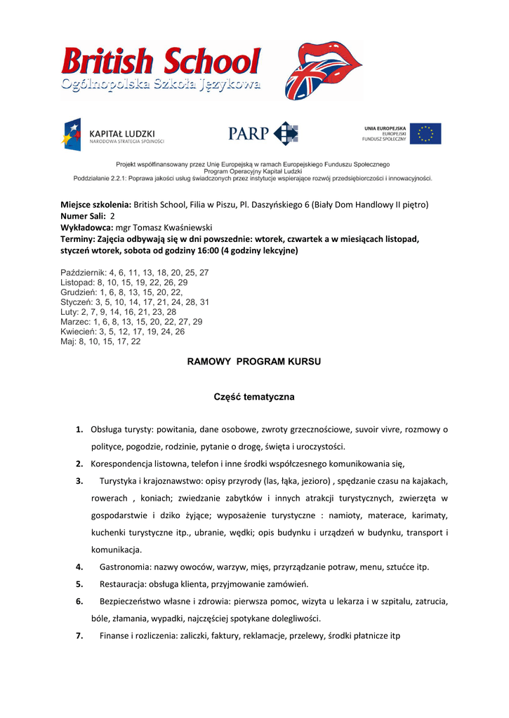 Miejsce szkolenia: British School, Filia w Piszu, Pl. Daszyoskiego 6 (Biały Dom Handlowy II piętro) Numer Sali: 2 Wykładowca: mgr Tomasz Kwaśniewski Terminy: Zajęcia odbywają się w dni powszednie: wtorek, czwartek a w miesiącach listopad, styczeo wtorek, sobota od godziny 16:00 (4 godziny lekcyjne) Październik: 4, 6, 11, 13, 18, 20, 25, 27 Listopad: 8, 10, 15, 19, 22, 26, 29 Grudzień: 1, 6, 8, 13, 15, 20, 22, Styczeń: 3, 5, 10, 14, 17, 21, 24, 28, 31 Luty: 2, 7, 9, 14, 16, 21, 23, 28 Marzec: 1, 6, 8, 13, 15, 20, 22, 27, 29 Kwiecień: 3, 5, 12, 17, 19, 24, 26 Maj: 8, 10, 15, 17, 22 RAMOWY PROGRAM KURSU Część tematyczna 1. Obsługa turysty: powitania, dane osobowe, zwroty grzecznościowe, suvoir vivre, rozmowy o polityce, pogodzie, rodzinie, pytanie o drogę, święta i uroczystości. 2. Korespondencja listowna, telefon i inne środki współczesnego komunikowania się, 3. Turystyka i krajoznawstwo: opisy przyrody (las, łąka, jezioro) , spędzanie czasu na kajakach, rowerach , koniach; zwiedzanie zabytków i innych atrakcji turystycznych, zwierzęta w gospodarstwie i dziko żyjące; wyposażenie turystyczne : namioty, materace, karimaty, kuchenki turystyczne itp., ubranie, wędki; opis budynku i urządzeo w budynku, transport i komunikacja. 4. Gastronomia: nazwy owoców, warzyw, mięs, przyrządzanie potraw, menu, sztudce itp. 5. Restauracja: obsługa klienta, przyjmowanie zamówieo. 6. Bezpieczeostwo własne i zdrowia: pierwsza pomoc, wizyta u lekarza i w szpitalu, zatrucia, bóle, złamania, wypadki, najczęściej spotykane dolegliwości. 7. Finanse i rozliczenia: zaliczki, faktury, reklamacje, przelewy, środki płatnicze itp 8. Komunikacja interpersonalna Część gramatyczna 1. Rodzajniki określone i nieokreślone, przeczenie kein – deklinacja 2. Rzeczownik w liczbie pojedynczej i mnogiej (cechy gramatyczne w zapisie leksykograficznym) 3. Zaimki osobowe, pytające, wskazujące, dzierżawcze, nieokreślone 4. Liczebniki główne i porządkowe 5. Czasownik – pełna koniugacja w czasie teraźniejszym, czasowniki posiłkowe trybu – Modalverben 6. Czas przeszły złożony Perfect – formy podstawowe 7. Tryb rozkazujący (druga osoba liczby pojedynczej i mnogiej) 8. Rekcja przyimków + D/A w wyrażeniach miejsca (D) 9. Wyrazy złożone – czasowniki rozdzielnie złożone i rzeczowniki 10. Deklinacja przymiotnika 11. Stopniowanie przymiotnika, struktury porównania 12. Czasowniki modalne 13. Zaimki osobowe, dzierżawcze, zwrotne, wskazujące, pytające, nieokreślone – deklinacja 14. Rekcja czasowników 15. Rekcja przyimków +D/A – przyimki miejsca (+Akk) 16. Czas przeszły prosty – Präteritum 17. Przeczenia i ich miejsce w zdaniu 18. Partykuły: denn, aber, doch 19. Budowa zdania + miejsce czasownika (verbum finitum i verbum infinitum) 20. Zdania pytające (inwersyjne i z pytaniami pytającymi) 21. Zdania rozkazujące (bezpodmiotowe i inwersyjne) 22. Pisownia wielką literą rzeczowników 23. Graficzny kontekst długich i krótkich samogłosek 24. Czas przyszły – Futur I i II