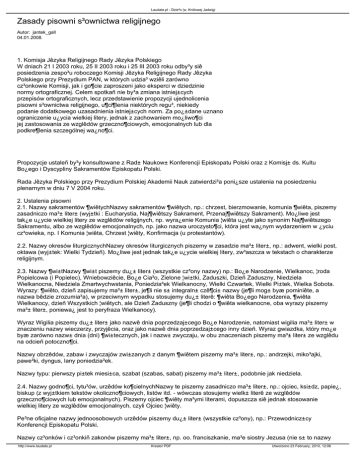 Laudate.pl - Dzie³o ¦w. Królowej Jadwigi Zasady pisowni s³ownictwa religijnego Autor: jantek_gall 04.01.2008. 1. Komisja Jêzyka Religijnego Rady Jêzyka Polskiego W dniach 21 I 2003 roku, 25 II 2003 roku i 25 III 2003 roku odby³y siê posiedzenia zespo³u roboczego Komisji Jêzyka Religijnego Rady Jêzyka Polskiego przy Prezydium PAN, w których udzia³ wziêli zarówno cz³onkowie Komisji, jak i go¶cie zaproszeni jako eksperci w dziedzinie normy ortograficznej. Celem spotkañ nie by³a zmiana istniej±cych przepisów ortograficznych, lecz przedstawienie propozycji ujednolicenia pisowni s³ownictwa religijnego, u¶ci¶lenia niektórych regu³, niekiedy podanie dodatkowego uzasadnienia istniej±cych norm. Za po¿±dane uznano ograniczenie u¿ycia wielkiej litery, jednak z zachowaniem mo¿liwo¶ci jej zastosowania ze wzglêdów grzeczno¶ciowych, emocjonalnych lub dla podkre¶lenia szczególnej wa¿no¶ci. Propozycje ustaleñ by³y konsultowane z Rad± Naukow± Konferencji Episkopatu Polski oraz z Komisj± ds. Kultu Bo¿ego i Dyscypliny Sakramentów Episkopatu Polski. Rada Jêzyka Polskiego przy Prezydium Polskiej Akademii Nauk zatwierdzi³a poni¿sze ustalenia na posiedzeniu plenarnym w dniu 7 V 2004 roku. 2. Ustalenia pisowni 2.1. Nazwy sakramentów ¶wiêtychNazwy sakramentów ¶wiêtych, np.: chrzest, bierzmowanie, komunia ¶wiêta, piszemy zasadniczo ma³± liter± (wyj±tki : Eucharystia, Naj¶wiêtszy Sakrament, Przenaj¶wiêtszy Sakrament). Mo¿liwe jest tak¿e u¿ycie wielkiej litery ze wzglêdów religijnych, np. wyra¿enie Komunia ¦wiêta u¿yte jako synonim Naj¶wiêtszego Sakramentu, albo ze wzglêdów emocjonalnych, np. jako nazwa uroczysto¶ci, która jest wa¿nym wydarzeniem w ¿yciu cz³owieka, np. I Komunia ¦wiêta, Chrzest ¦wiêty, Konfirmacja (u protestantów). 2.2. Nazwy okresów liturgicznychNazwy okresów liturgicznych piszemy w zasadzie ma³± liter±, np.: adwent, wielki post, oktawa (wyj±tek: Wielki Tydzieñ). Mo¿liwe jest jednak tak¿e u¿ycie wielkiej litery, zw³aszcza w tekstach o charakterze religijnym. 2.3. Nazwy ¶wi±tNazwy ¶wi±t piszemy du¿± liter± (wszystkie cz³ony nazwy) np.: Bo¿e Narodzenie, Wielkanoc, ¦roda Popielcowa (i Popielec), Wniebowziêcie, Bo¿e Cia³o, Zielone ¦wi±tki, Zaduszki, Dzieñ Zaduszny, Niedziela Wielkanocna, Niedziela Zmartwychwstania, Poniedzia³ek Wielkanocny, Wielki Czwartek, Wielki Pi±tek, Wielka Sobota. Wyrazy: ¶wiêto, dzieñ zapisujemy ma³± liter±, je¶li nie s± integraln± czê¶ci± nazwy (je¶li mog± byæ pominiête, a nazwa bêdzie zrozumia³a), w przeciwnym wypadku stosujemy du¿± literê: ¶wiêta Bo¿ego Narodzenia, ¶wiêta Wielkanocy, dzieñ Wszystkich ¦wiêtych, ale Dzieñ Zaduszny (je¶li chodzi o ¶wiêta wielkanocne, oba wyrazy piszemy ma³± liter±, poniewa¿ jest to peryfraza Wielkanocy). Wyraz Wigilia piszemy du¿± liter± jako nazwê dnia poprzedzaj±cego Bo¿e Narodzenie, natomiast wigilia ma³± liter± w znaczeniu nazwy wieczerzy, przyjêcia, oraz jako nazwê dnia poprzedzaj±cego inny dzieñ. Wyraz gwiazdka, który mo¿e byæ zarówno nazw± dnia (dni) ¶wi±tecznych, jak i nazw± zwyczaju, w obu znaczeniach piszemy ma³± liter± ze wzglêdu na odcieñ potoczno¶ci. Nazwy obrzêdów, zabaw i zwyczajów zwi±zanych z danym ¶wiêtem piszemy ma³± liter±, np.: andrzejki, miko³ajki, pawe³ki, dyngus, lany poniedzia³ek. Nazwy typu: pierwszy pi±tek miesi±ca, szabat (szabas, sabat) piszemy ma³± liter±, podobnie jak niedziela. 2.4. Nazwy godno¶ci, tytu³ów, urzêdów ko¶cielnychNazwy te piszemy zasadniczo ma³± liter±, np.: ojciec, ksi±dz, papie¿, biskup (z wyj±tkiem tekstów okoliczno¶ciowych, listów itd. - wówczas stosujemy wielk± literê ze wzglêdów grzeczno¶ciowych lub emocjonalnych). Piszemy ojciec ¶wiêty ma³ymi literami, dopuszcza siê jednak stosowanie wielkiej litery ze wzglêdów emocjonalnych, czyli Ojciec ¦wiêty. Pe³ne oficjalne nazwy jednoosobowych urzêdów piszemy du¿± liter± (wszystkie cz³ony), np.: Przewodnicz±cy Konferencji Episkopatu Polski. Nazwy cz³onków i cz³onkiñ zakonów piszemy ma³± liter±, np. oo. franciszkanie, ma³e siostry Jezusa (nie s± to nazwy http://www.laudate.pl Kreator PDF Utworzono 23 February, 2010, 12:06 Laudate.pl - Dzie³o ¦w. Królowej Jadwigi zakonów jako instytucji, tylko nazwy cz³onków). 2.5. Nazwy instytucji i jednostek organizacyjnych Ko¶cio³aPiszemy tylko wielk± liter± Ko¶ció³ w znaczeniu organizacji, instytucji, ogó³u wiernych. Okre¶lenia od³amów wyznaniowych piszemy ma³± liter±, czyli Ko¶ció³ katolicki, Ko¶ció³ prawos³awny, Ko¶ció³ ewangelicko-augsburski. Natomiast je¶li mamy do czynienia z oficjaln± zarejestrowan± nazw± w³asn± organizacji, piszemy du¿± liter± wszystkie cz³ony, np.: Polski Autokefaliczny Ko¶ció³ Prawos³awny w RP, Ko¶ció³ Ewangelicko-Augsburski w RP, Ko¶ció³ Starokatolicki Mariawitów w RP, Ko¶ció³ Rzymskokatolicki oraz Ko¶ció³ Katolicki (obie nazwy funkcjonuj± jako oficjalne). Nazwy ko¶cielnych jednostek administracyjnych, np.: archidiecezja krakowska, parafia, prowincja, kustodia, a tak¿e nazwy urzêdów, np.: kuria metropolitalna, kapitu³a generalna piszemy w zasadzie ma³± liter±, chyba ¿e s± to oficjalne nazwy, wówczas piszemy du¿± liter± wszystkie cz³ony, np.: Kuria Metropolitalna Archidiecezji Krakowskiej, Prowincja ¶w. Antoniego z Padwy i b³. Jakuba Strzemiê (równie¿ wyra¿enia typu: XIX Kapitu³a Generalna traktujemy jako nazwy w³asne). Nazwê episkopat piszemy zasadniczo ma³± liter± w znaczeniu ogó³u biskupów, mo¿liwe jest jednak równie¿ u¿ycie wielkiej litery (Episkopat) w odniesieniu do instytucji, któr± jest Konferencja Episkopatu Polski. Piszemy episkopat polski, uznaj±c polski za przymiotnik, lub episkopat Polski, maj±c na my¶li rzeczownik w dope³niaczu. 2.6. Nazwy budynków i obiektówNazwy te piszemy ma³± liter±, np.: ko¶ció³, bazylika, katedra, sanktuarium. W p