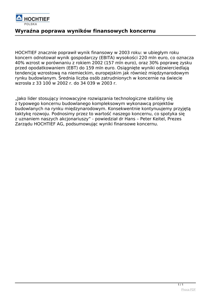 Wyraźna poprawa wyników finansowych koncernu HOCHTIEF znacznie poprawił wynik finansowy w 2003 roku: w ubiegłym roku koncern odnotował wynik gospodarczy (EBITA) wysokości 220 mln euro, co oznacza 40% wzrost w porównaniu z rokiem 2002 (157 mln euro), oraz 30% poprawę zysku przed opodatkowaniem (EBT) do 159 mln euro. Osiągnięte wyniki odzwierciedlają tendencję wzrostową na niemieckim, europejskim jak również międzynarodowym rynku budowlanym. Średnia liczba osób zatrudnionych w koncernie na świecie wzrosła z 33 100 w 2002 r. do 34 039 w 2003 r. „Jako lider stosujący innowacyjne rozwiązania technologiczne staliśmy się z typowego koncernu budowlanego kompleksowym wykonawcą projektów budowlanych na rynku międzynarodowym. Konsekwentnie kontynuujemy przyjętą taktykę rozwoju. Podnosimy przez to wartość naszego koncernu, co spotyka się z uznaniem naszych akcjonariuszy” - powiedział dr Hans – Peter Keitel, Prezes Zarządu HOCHTIEF AG, podsumowując wyniki finansowe koncernu. 1/1 Phoca PDF Powered by TCPDF (www.tcpdf.org)