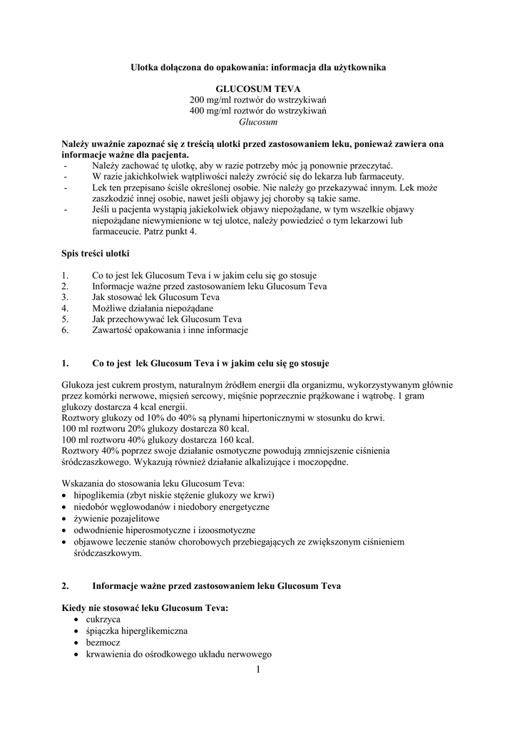 Ulotka dołączona do opakowania: informacja dla użytkownika GLUCOSUM TEVA 200 mg/ml roztwór do wstrzykiwań 400 mg/ml roztwór do wstrzykiwań Glucosum Należy uważnie zapoznać się z treścią ulotki przed zastosowaniem leku, ponieważ zawiera ona informacje ważne dla pacjenta. Należy zachować tę ulotkę, aby w razie potrzeby móc ją ponownie przeczytać. W razie jakichkolwiek wątpliwości należy zwrócić się do lekarza lub farmaceuty. Lek ten przepisano ściśle określonej osobie. Nie należy go przekazywać innym. Lek może zaszkodzić innej osobie, nawet jeśli objawy jej choroby są takie same. Jeśli u pacjenta wystąpią jakiekolwiek objawy niepożądane, w tym wszelkie objawy niepożądane niewymienione w tej ulotce, należy powiedzieć o tym lekarzowi lub farmaceucie. Patrz punkt 4. Spis treści ulotki 1. 2. 3. 4. 5. 6. Co to jest lek Glucosum Teva i w jakim celu się go stosuje Informacje ważne przed zastosowaniem leku Glucosum Teva Jak stosować lek Glucosum Teva Możliwe działania niepożądane Jak przechowywać lek Glucosum Teva Zawartość opakowania i inne informacje 1. Co to jest lek Glucosum Teva i w jakim celu się go stosuje Glukoza jest cukrem prostym, naturalnym źródłem energii dla organizmu, wykorzystywanym głównie przez komórki nerwowe, mięsień sercowy, mięśnie poprzecznie prążkowane i wątrobę. 1 gram glukozy dostarcza 4 kcal energii. Roztwory glukozy od 10% do 40% są płynami hipertonicznymi w stosunku do krwi. 100 ml roztworu 20% glukozy dostarcza 80 kcal. 100 ml roztworu 40% glukozy dostarcza 160 kcal. Roztwory 40% poprzez swoje działanie osmotyczne powodują zmniejszenie ciśnienia śródczaszkowego. Wykazują również działanie alkalizujące i moczopędne. Wskazania do stosowania leku Glucosum Teva: • hipoglikemia (zbyt niskie stężenie glukozy we krwi) • niedobór węglowodanów i niedobory energetyczne • żywienie pozajelitowe • odwodnienie hiperosmotyczne i izoosmotyczne • objawowe leczenie stanów chorobowych przebiegających ze zwiększonym ciśnieniem śródczaszkowym. 2. Informacje ważne przed zastosowaniem leku Glucosum Teva Kiedy nie stosować leku Glucosum Teva: • cukrzyca • śpiączka hiperglikemiczna • bezmocz • krwawienia do ośrodkowego układu nerwowego 1 • • • • • • • nietolerancja glukozy i galaktozy odwodnienie hipotoniczne stan przewodnienia delirium tremens u pacjentów odwodnionych stany po ostrym niedokrwieniu mózgu hipokaliemia uczulenie na zboża lub produkty zbożowe. Ostrzeżenia i środki ostrożności Przed rozpoczęciem stosowania leku Glucosum Teva należy omówić to z lekarzem lub farmaceutą. Podczas długotrwałego stosowania wlewów glukozy należy kontrolować skład elektrolitowy krwi, stopień nawodnienia organizmu oraz okresowo - stężenie glukozy we krwi. Roztwory glukozy o stężeniach powyżej 15 % powinny być podawane do naczyń centralnych, z wyjątkiem stanów zagrożenia życia (ciężka hipoglikemia - znaczny spadek stężenia cukru we krwi). W przypadku hipoglikemii i konieczności podania roztworu o dużym stężeniu do żyły obwodowej zaleca się podawanie powolne. Po nagłym przerwaniu wlewu hipertonicznego roztworu glukozy może dojść do wtórnego spadku stężenia glukozy we krwi. Ostrożność należy zachować również w trakcie wlewów stężonych roztworów glukozy pacjentom z posocznicą (sepsą), ciężkimi urazami, niedożywieniem znacznego stopnia, niedoborem witaminy B 1 , hypofosfatemią oraz hemodilucją (rozcieńczeniem krwi). Stosowanie leku Glucosum Teva u pacjentów z zaburzeniem czynności nerek i (lub) wątroby Brak danych wskazujących na konieczność dostosowania dawkowania u pacjentów z zaburzeniami czynności nerek i (lub) wątroby. Lek Glucosum Teva a inne leki Roztworów glukozy nie należy mieszać z aminofiliną, barbituranami, erytromycyną, hydrokortyzonem, warfaryną, kanamycyną, sulfonamidami, witaminą B 12 oraz fenytoiną. Nie należy podawać roztworu glukozy za pomocą tego samego zestawu do wlewów, przed przetaczaniem krwi, podczas i po zakończeniu przetaczania. Należy zachować ostrożność u pacjentów przyjmujących preparaty naparstnicy ponieważ stężone roztwory glukozy mogą nasilać ich działanie. Ciąża i karmienie piersią Jeśli pacjentka jest w ciąży lub karmi piersią, przypuszcza, że może być w ciąży lub gdy planuje mieć dziecko, powinna poradzić się lekarza lub farmaceuty przed zastosowaniem tego leku. Nie przeprowadzono odpowiednich badań u kobiet w ciąży i u kobiet karmiących piersią. O stosowaniu leku przez kobiety w ciąży i w okresie karmienia piersią decyduje lekarz. Prowadzenie pojazdów i obsługiwanie maszyn Glukoza nie osłabia sprawności psychofizycznej i nie wpływa na zdolność prowadzenia pojazdów oraz obsługi maszyn. 3. Jak stosować lek Glucosum Teva Ten lek należy zawsze stosować zgodnie z zaleceniami lekarza. W razie wątpliwości należy zwrócić się do lekarza lub farmaceuty. Roztwór 20 % i 40 % glukozy stosuje się dożylnie, we wstrzyknięciach lub we wlewach kroplowych, w dawkach dobieranych indywidualnie zależnie od stanu zdrowia, wieku i masy ciała pacjenta. Zaleca się uważne monitorowanie stężenia glukozy i elektrolitów we krwi, zwłaszcza podczas długotrwałego żywienia pozajelitowego. 2 Dorośli: • u pacjentów wyniszczonych i niedożywionych można podawać do 300 g glukozy w postaci powolnego wlewu. Podczas stosowania stężonych roztworów glukozy istnieje konieczność podawania insuliny w dawce 1 j.m. insuliny na około 4 g glukozy. • w żywieniu pozajelitowym: wymagana dawka wynosi zwykle 1,5 g - 3,0 g glukozy/kg mc. na dobę, dawką zalecaną jest 3 g glukozy/kg mc. na dobę, podawane w powolnym wlewie do żyły centralnej. • w hipoglikemii: należy podawać dożylnie 20 % lub 40 % roztwór glukozy (0,2 g/kg mc.) aż do uzyskania prawidłowego stężenia glukozy we krwi. Stosowanie u dzieci: • u dzi