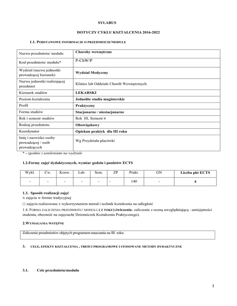 SYLABUS DOTYCZY CYKLU KSZTAŁCENIA 2016-2022 1.1. PODSTAWOWE INFORMACJE O PRZEDMIOCIE/MODULE Nazwa przedmiotu/ modułu Choroby wewnętrzne Kod przedmiotu/ modułu* P-ChW/P Wydział (nazwa jednostki prowadzącej kierunek) Wydział Medyczny Nazwa jednostki realizującej przedmiot Klinice lub Oddziale Chorób Wewnętrznych. Kierunek studiów LEKARSKI Poziom kształcenia Jednolite studia magisterskie Profil Praktyczny Forma studiów Stacjonarne / niestacjonarne Rok i semestr studiów Rok III, Semestr 6 Rodzaj przedmiotu Obowiązkowy Koordynator Opiekun praktyk dla III roku Imię i nazwisko osoby prowadzącej / osób prowadzących Wg Przydziału placówki * - zgodnie z ustaleniami na wydziale 1.2.Formy zajęć dydaktycznych, wymiar godzin i punktów ECTS Wykł. Ćw. Konw. Lab. Sem. - - - - - ZP - Prakt. GN Liczba pkt ECTS 140 - 4 1.3. Sposób realizacji zajęć X zajęcia w formie tradycyjnej ☐ zajęcia realizowane z wykorzystaniem metod i technik kształcenia na odległość 1.4. FORMA ZALICZENIA PRZEDMIOTU/ MODUŁU ( Z TOKU) ćwiczenia- zaliczenie z oceną uwzględniającą : umiejętności studenta, obecność na zajęciach( Dzienniczek Kształcenia Praktycznego). 2.WYMAGANIA WSTĘPNE Zaliczenie przedmiotów objętych programem nauczania na III roku. 3. 3.1. CELE, EFEKTY KSZTAŁCENIA , TREŚCI PROGRAMOWE I STOSOWANE METODY DYDAKTYCZNE Cele przedmiotu/modułu 1 C1 C2 C3 uzupełnienie wiadomości o organizacji Oddziału Wewnętrznego / Kliniki i powiązaniu organizacyjnym Oddziału / Kliniki z lecznictwem otwartym, doskonalenie umiejętności badania fizykalnego pogłębienie umiejętności rozpoznawania i różnicowania podstawowych jednostek chorobowych ze szczególnym uwzględnieniem przypadków ostrych, poznanie właściwej interpretacji wyników badań, radiologicznych i patomorfologicznych, udział w wizytach lekarskich, wykonywanie przez studentów zabiegów stosowanych w codziennej praktyce lekarskiej (wstrzyknięcia dożylne, podłączenie kroplówek, cewnikowanie itp.), pobieranie przez studentów materiału do badań diagnostycznych. 3.2 EFEKTY KSZTAŁCENIA DLA PRZEDMIOTU/ MODUŁU EK ( EFEKT KSZTAŁCENIA) TREŚĆ EFEKTU KSZTAŁCENIA ZDEFINIOWANEGO DLA PRZEDMIOTU (MODUŁU) ODNIESIENIE DO EFEKTÓW KIERUNKOWYCH (KEK) EK_01 EK_02 EK_03 EK_04 EK_05 zna uwarunkowania środowiskowe i epidemiologiczne najczęstszych chorób; przeprowadza pełne i ukierunkowane badanie fizykalne pacjenta dorosłego; E.W1. ocenia stan ogólny, stan przytomności i świadomości pacjenta; przeprowadza wywiad lekarski z pacjentem dorosłym; E.U 7 zna i rozumie przyczyny, objawy, zasady diagnozowania i postępowania terapeutycznego w odniesieniu do najczęstszych chorób wewnętrznych występujących u osób dorosłych oraz ich powikłań: a) chorób układu krążenia, w tym: choroby niedokrwiennej serca, wad serca, chorób wsierdzia, mięśnia serca, osierdzia, niewydolności serca (ostrej i przewlekłej), chorób naczyń tętniczych i żylnych, nadciśnienia tętniczego: pierwotnego i wtórnego, nadciśnienia płucnego, b) chorób układu oddechowego, w tym: chorób dróg oddechowych, przewlekłej obturacyjnej choroby płuc, astmy oskrzelowej, rozstrzenia oskrzeli, mukowiscydozy, zakażeń układu oddechowego, chorób śródmiąższowych płuc, opłucnej, śródpiersia, obturacyjnego i centralnego bezdechu sennego, niewydolności oddechowej (ostrej i przewlekłej), nowotworów układu oddechowego, c) chorób układu pokarmowego, w tym chorób: jamy ustnej, przełyku, żołądka i dwunastnicy, jelit, trzustki, wątroby, dróg E.W7 E.U3. E.U1. 2 EK_06 żółciowych i pęcherzyka żółciowego, d) chorób układu wydzielania wewnętrznego, w tym chorób: podwzgórza i przysadki, tarczycy, przytarczyc, kory i rdzenia nadnerczy, jajników i jąder, a także guzów neuroendokrynnych, zespołów wielogruczołowych, różnych typów cukrzycy i zespołu metabolicznego: hipoglikemii, otyłości, dyslipidemii, e) chorób nerek i dróg moczowych, w tym: ostrych i przewlekłych niewydolności nerek, chorób kłębuszków nerkowych i śródmiąższowych nerek, torbieli nerek, kamicy nerkowej, zakażeń układu moczowego, nowotworów układu moczowego, w szczególności raka pęcherza moczowego i raka nerki, f) chorób układu krwiotwórczego, w tym: aplazji szpiku, niedokrwistości, granulocytopenii i agranulocytozy, małopłytkowości, białaczek ostrych, nowotworów mieloproliferacyjnych i mielodysplastycznomieloproliferacyjnych, zespołów mielodysplastycznych, nowotworów z dojrzałych limfocytów B i T, skaz krwotocznych, trombofilii, stanów bezpośredniego zagrożenia życia w hematologii, zaburzeń krwi w chorobach innych narządów; Dziennik Ustaw – 9 – Poz. 631 g) chorób reumatycznych, w tym: chorób układowych tkanki łącznej, układowych zapaleń naczyń, zapaleń stawów z zajęciem kręgosłupa, chorób metabolicznych kości, w szczególności osteoporozy i choroby zwyrodnieniowej stawów, dny moczanowej, h) chorób alergicznych, w tym: anafilaksji i wstrząsu anafilaktycznego oraz obrzęku naczynioruchowego, i) zaburzeń wodno elektrolitowych i kwasowo‐zasadowych: stanów odwodnienia, stanów przewodnienia, zaburzeń gospodarki elektrolitowej, kwasicy i zasadowicy; stosuje się do zasad aseptyki i antyseptyki; F.U3 EK_07 prowadzi dokumentację medyczną pacjenta. E.U38. EK_08 potrafi nawiązać i utrzymać głęboki i pełen szacunku kontakt z chorym K.01 EK_09 posiada świadomość własnych ograniczeń i umiejętność stałego dokształcania się. K.04 3.3 TREŚCI PROGRAMOWE Badanie stanu ogólnego pacjenta. Stany nieprzytomności. Ocena kliniczna pacjenta. 3 Badanie przedmiotowe. Technika badania, obraz prawidłowy, podstawowe odchylenia od stanu prawidłowego. Ocena stanu ogólnego, badanie głowy i szyi, narządów klatki piersiowej, jamy brzusznej, kończyn Badanie podmiotowe. Komunikacja lekarza z pacjentem. Tajemnica lekarska. Podstawy elektrokardiografii Pobieranie krwi do badań labor