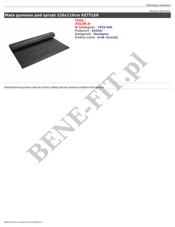 Informacje o produkcie Utworzono 08-03-2017 Mata gumowa pod sprzęt 220x110cm KETTLER Cena : 355,00 zł FI T .p l Nr katalogowy : 7929-400 Producent : Kettler Dostępność : Dostępny Średnia ocena : brak recenzji B EN E- Dźwiękochłonna gumowa mata do ochrony podłogi podczas używania urządzeń treningowych. Wygenerowano w programie www.oscGold.com