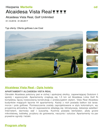 Hiszpania Marbella od 490 Alcaidesa Vista Real Alcaidesa Vista Real, Golf Unlimited 01.12.2016 - 31.05.2017 Typ oferty: Oferta golfowa Low Cost Alcaidesa Vista Real - Opis hotelu APARTAMENTY ALCAIDESA VISTA REAL Ośrodek Alcaidesa położony jest w cichej i spokojnej okolicy, zapewniającej Gościom bezpie spokój i wypoczynek. Apartamenty znajdują się 1,5 km od Alcaidesa Links Golf Resort kompleksu łączą nowoczesną konstrukcję z andaluzyjskim stylem. Vista Real Alcaidesa skła budynków mających łącznie 44 apartamenty. Każdy z nich posiada balkon lub taras z wi morze i pola golfowe. Pomieszczenia zostały zaprojektowane w stylu kolonialnym, wystrój przyjemną atmosferę. Na ich wyposażenie składają się: klimatyzacja, telewizja satelitarna, po Internetem, darmowy sejf i suszarkę. Kuchnia posiada wentylator, płytę grzewczą, mikrofalową, lodówkę, przybory do gotowania, naczynia i sztućce. Apartamenty na parterze prywatne ogrody i leżaki. Program oferty MARABELLA Apartamenty Alicaidesa Vista Real położone są zaledwie 65km od znanego kąpieliska m ośrodka wypoczynku – Marabelli. Marabella położona jest w prowincji Malaga (Andaluzja) wymarzonym miejscem do wypoczynku o każdej porze roku. Specyficzny mikroklimat śródziemnomorską pogodę przez cały rok, nawet zimą średnia temperatura oscyluje w okolic stopni, natomiast lata są suche i upalne, ale niska wilgotność i suchy klimat sprawiają, temperatury przekraczające 30 stopni nie doskwierają wypoczywającym turystom. Miasto op zabytków oferuje odwiedzającym wiele rozrywek, restauracji, kafejek, ekskluzywnych sklepów plaż, ciągnących się nieprzerwanie przez 26km. Pola w pakiecie Alcaidesa Links – jedyne pole golfowe typu links w południowej Europie. 18 dołkowe pole zos zaprojektowane przez Petera Ellisa i Clivea Clarka, otworzone w 1992r. Topografia pola chara się łagodnymi stokami schodzącymi w stronę morza. Większość dołków umiejscowione są prz skąd rozciąga się niesamowity widok na Morze Śródziemne, Giblartar i Afrykę. W 2011 roku zo wpisane na listę 20. najlepszych pól golfowych typu links w Europie przez prestiżowy magazyn World”. Par 72. Alcaidesa Heathland – 18 dołków, par 72. Zaprojektowane przez byłego zawodnika Ryder C Davea Thomasa. Pole to oferuje grę w różnorodnym krajobrazie: przypominającym wrzosowis szerokim fairwayami z widokiem na Morze Śródziemne oraz z licznymi przeszkodami wodnym Propozycje przelotów Linia Norwegian – loty 2x tygodniu Linia Odlot Przylot WYLOT 1125 1525 POWRÓT 0700 1050 CENA za przelot od 500 PLN Bagaz rejsowy 20 kg od 150 PLN Bagaż golfa od 244 PLN Alternatywnie loty z Waw Modlin. Udogodnienia hotelu Bar Całoroczny basen Internet Wi-Fi Klimatyzacja Mini Bar Pokój z tarasem Sejf Suszarka Telewizja Telewizja satelitarna Urządzenia do przyrządzania kawy i herbaty Usługi pralni Apartamenty Vista Real Pakiet bez lotu Golfer DBL Golfe 7 nocy/ cena w €/os 01.12.15-29.02.16 490.00 EUR 640.00 01.03-31.05.16 530.00 EUR 680.00 Cena przy min 2 os! Oferta zawiera 7 nocy w pokoju DBL lub SGL lub w apartamencie z 1 sypialnia Pakiet 5 dni Golf Unlimited na 2 polach, Auto na czas pobytu, Ubezpieczenie KL NNW z OC Podatek i obsługę. Oferta nie zawiera Przelotu do Malagi Wyżywienia, śniadania 85€, HB 205€, Opłaty za transport sprzętu golfowego (ok. 50 €/ 1 strona), lub Wynajem sprzętu 50-60€/ tydz/ cały set, Opłat za club cary, wózki, Paliwa, opłat za ubezpieczenie od uszkodzeń, kaucji, Katarzyna Bobińska tel: +48 600 88 55 44 e-mail: kbobinska@travel
