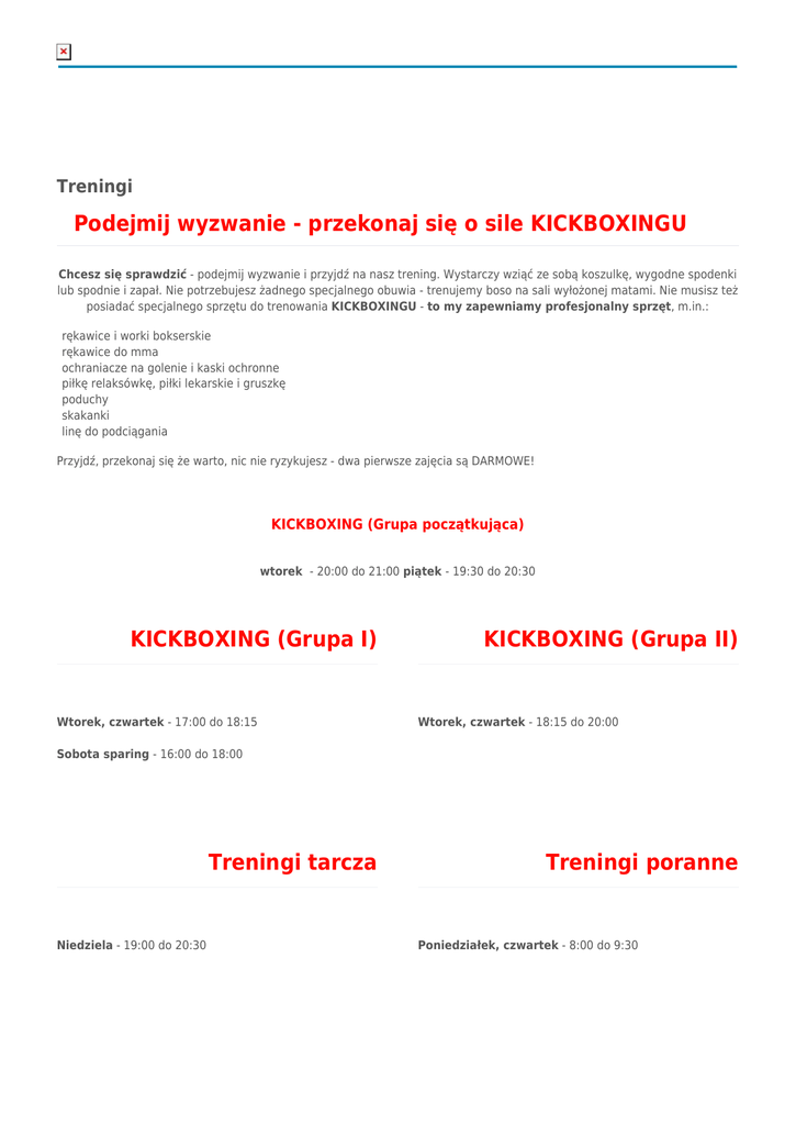 Treningi Podejmij wyzwanie - przekonaj się o sile KICKBOXINGU Chcesz się sprawdzić - podejmij wyzwanie i przyjdź na nasz trening. Wystarczy wziąć ze sobą koszulkę, wygodne spodenki lub spodnie i zapał. Nie potrzebujesz żadnego specjalnego obuwia - trenujemy boso na sali wyłożonej matami. Nie musisz też posiadać specjalnego sprzętu do trenowania KICKBOXINGU - to my zapewniamy profesjonalny sprzęt, m.in.: rękawice i worki bokserskie rękawice do mma ochraniacze na golenie i kaski ochronne piłkę relaksówkę, piłki lekarskie i gruszkę poduchy skakanki linę do podciągania Przyjdź, przekonaj się że warto, nic nie ryzykujesz - dwa pierwsze zajęcia są DARMOWE! KICKBOXING (Grupa początkująca) wtorek - 20:00 do 21:00 piątek - 19:30 do 20:30 KICKBOXING (Grupa I) Wtorek, czwartek - 17:00 do 18:15 KICKBOXING (Grupa II) Wtorek, czwartek - 18:15 do 20:00 Sobota sparing - 16:00 do 18:00 Treningi tarcza Niedziela - 19:00 do 20:30 Treningi poranne Poniedziałek, czwartek - 8:00 do 9:30