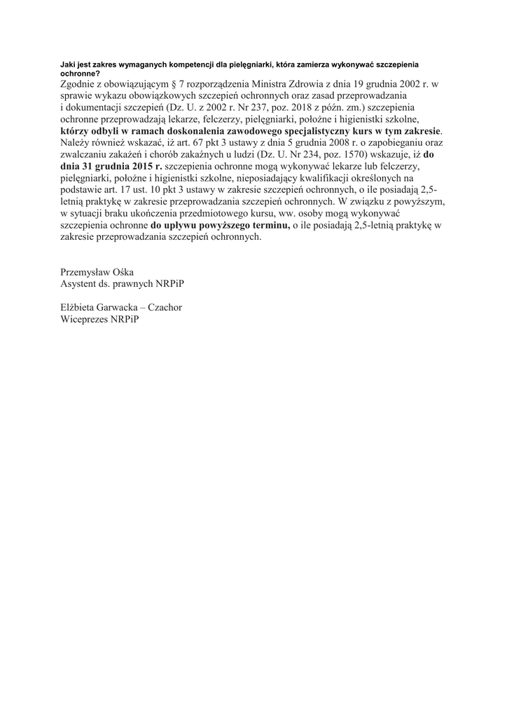 Jaki jest zakres wymaganych kompetencji dla pielęgniarki, która zamierza wykonywać szczepienia ochronne? Zgodnie z obowiązującym § 7 rozporządzenia Ministra Zdrowia z dnia 19 grudnia 2002 r. w sprawie wykazu obowiązkowych szczepień ochronnych oraz zasad przeprowadzania i dokumentacji szczepień (Dz. U. z 2002 r. Nr 237, poz. 2018 z późn. zm.) szczepienia ochronne przeprowadzają lekarze, felczerzy, pielęgniarki, połoŜne i higienistki szkolne, którzy odbyli w ramach doskonalenia zawodowego specjalistyczny kurs w tym zakresie. NaleŜy równieŜ wskazać, iŜ art. 67 pkt 3 ustawy z dnia 5 grudnia 2008 r. o zapobieganiu oraz zwalczaniu zakaŜeń i chorób zakaźnych u ludzi (Dz. U. Nr 234, poz. 1570) wskazuje, iŜ do dnia 31 grudnia 2015 r. szczepienia ochronne mogą wykonywać lekarze lub felczerzy, pielęgniarki, połoŜne i higienistki szkolne, nieposiadający kwalifikacji określonych na podstawie art. 17 ust. 10 pkt 3 ustawy w zakresie szczepień ochronnych, o ile posiadają 2,5letnią praktykę w zakresie przeprowadzania szczepień ochronnych. W związku z powyŜszym, w sytuacji braku ukończenia przedmiotowego kursu, ww. osoby mogą wykonywać szczepienia ochronne do upływu powyŜszego terminu, o ile posiadają 2,5-letnią praktykę w zakresie przeprowadzania szczepień ochronnych. Przemysław Ośka Asystent ds. prawnych NRPiP ElŜbieta Garwacka – Czachor Wiceprezes NRPiP