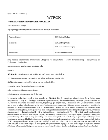 Sygn. akt II AKa 120/14 WYROK W IMIENIU RZECZYPOSPOLITEJ POLSKIEJ Dnia 13 czerwca 2014 r. Sąd Apelacyjny w Białymstoku w II Wydziale Karnym w składzie Przewodniczący SSA Halina Czaban Sędziowie SSA Andrzej Ulitko SSA Janusz Sulima (spr.) Protokolant Magdalena Suchocka przy udziale Prokuratora Prokuratury Okręgowej w Białymstoku – Beaty Kwiećkowskiej – delegowanej do Prokuratury Apelacyjnej po rozpoznaniu w dniu 11 czerwca 2014 roku sprawy: M. K. s. B. oskarżonego z art. 148 §2 pkt 2 k.k. w zb. z art. 280 §2 k.k., W. C. s. J. oskarżonego z art. 148 §2 pkt 2 k.k. w zb. z art. 280 §2 k.k., K. M. oskarżonego z art. 18 §3 k.k. w zw. z art. 280 §1 k.k., z powodu apelacji wniesionej przez obrońców od wyroku Sądu Okręgowego w Łomży z dnia 5 marca 2014 r., sygn. akt II K 47/13 I. zmienia zaskarżony wyrok w ten sposób, że M. K. i W. C. uznaje za winnych tego, że w dniu 5 maja 2013 roku w R. woj. (...) działając wspólnie i w porozumieniu, dokonali kradzieży, używając przemocy wobec W. K., poprzez zadawanie mu razów rękoma, kopanie go po całym ciele, a następnie tzw. „kolankowanie”, zabrali mu w celu wypłaty z bankomatu dwie karty bankomatowe z numerem PIN oraz telefon komórkowy marki (...)o wartości 30 złotych i spowodowali u W. K., przewidując i godząc się na to, ciężki uszczerbek na zdrowiu: liczne obrażenia twarzy, głowy, klatki piersiowej oraz rozległe złamania rusztowania kostnego klatki piersiowej, zwłaszcza strony prawej – złamanie żeber II – X w linii środkowo – obojczykowej i VII – XI w linii przykręgosłupowej z odłamami kostnymi żeber sterczącymi do jamy opłucnowej, rozerwaniem tylnych partii płuca prawego z następową prawostronną odmą opłucnową, prowadzące do ostrej niewydolności oddechowej w przebiegu rozległego urazu rusztowania kostnego klatki piersiowej, stanowiące chorobę realnie zagrażającą życiu, następstwem czego była śmierć W. K., którą przewidywali, to jest czynu z art. 156 §3 k.k. w zb. z art. 280 §1 k.k. i za to na podstawie art. 156 §3 k.k. w zb. z art. 280 §1 k.k. w zw. z art. 11 §2 k.k. skazuje ich, a na podstawie art. 156 §3 k.k. w zw. z art. 11 §3 k.k. wymierza im kary: M. K. 12 (dwunastu) lat pozbawienia wolności, a W. C. 10 (dziesięciu) lat pozbawienia wolności; II. w pozostałym zakresie zaskarżony wyrok utrzymuje w mocy, uznając apelację obrońcy K. M. za oczywiście bezzasadną; III. zwalnia oskarżonych od ponoszenia kosztów sądowych za postępowanie odwoławcze. UZASADNIENIE M. K. i W. C. zostali oskarżeni o to, że W dniu 5 maja 2013 roku w R. gm. M. pow. K. woj. (...), około godz. 1-ej, w domu na posesji oznaczonej nr (...), działając wspólnie i w porozumieniu, z zamiarem ewentualnym pozbawienia życia W. K., używając przemocy poprzez zadawanie mu razów rękoma, w tym W. C. niebezpiecznym przedmiotem w postaci kastetu i kopanie go po całym ciele, a następnie tzw. „kolankowanie”, zabrali mu w celu przywłaszczenia dwie karty bankomatowe z numerem PIN oraz telefon komórkowy marki (...) o wartości około 30 złotych, powodując u niego w ten sposób liczne obrażenia zewnętrzne - twarzy, głowy, klatki piersiowej oraz rozległe złamania rusztowania kostnego klatki piersiowej, zwłaszcza strony prawej - złamanie żeber II-X w linii środkowo obojczykowej i VII-XI w linii przykręgosłupowej z odłamami kostnymi żeber sterczącymi do jamy opłucnowej, rozerwaniem tylnych partii płuca prawego oraz odmą opłucnową prawostronną, co spowodowało ostrą niewydolność oddechową w przebiegu rozległego urazu rusztowania kostnego klatki piersiowej z następową odmą opłucnową skutkującą jego zgon, to jest o przestępstwo z art. 148 §2 pkt 2 k.k. w zw. z art. 280 §2 k.k. K. M. został natomiast oskarżony o to, że w dniu 5 maja 2013 roku w R., gm. M., pow. K., woj. (...), około godziny 1-ej, działając w zamiarze, aby M. K. i W. C. dokonali napadu rabunkowego na osobie W. K., w jego własnym domu ułatwił im popełnienie tegoż czynu, poprzez podwiezienie ich samochodem osobowym marki (...) o nr rej. (...) pod jego dom gdzie na nich oczekiwał, po czym zabrał ich z miejsca napadu z powrotem, - to jest o przestępstwo z art. 18 §3 k.k. w zw. z art. 280 §1 k.k. Sąd Okręgowy w Łomży wyrokiem z dnia 5 marca 2014 roku uznał M. K. i W. C. za winnych tego, że w dniu 5 maja 2013 roku w R. woj. (...) działając wspólnie i w porozumieniu, z zamiarem ewentualnym pozbawienia życia oraz kradzieży posługując się niebezpiecznym narzędziem w postaci kastetu używając przemocy wobec W. K. poprzez zadawanie mu razów rękoma, kopanie go po całym ciele, a następnie tzw. „kolankowanie”, zabrali mu w celu wypłaty z bankomatu dwie karty bankomatowe z numerem PIN oraz telefon komórkowy marki (...) o wartości 30,00 złotych, powodując u W. K. w ten sposób liczne obrażenia zewnętrzne - twarzy, głowy, klatki piersiowej oraz rozległe złamania rusztowania kostnego klatki piersiowej, zwłaszcza strony prawej - złamanie żeber II-X w linii środkowo obojczykowej i VII-XI w linii przykręgosłupowej z odłamami kostnymi żeber sterczącymi do jamy opłucnowej, rozerwaniem tylnych partii płuca prawego oraz odmą opłucnową prawostronną, co spowodowało ostrą niewydolność oddechową w przebiegu rozległego urazu rusztowania kostnego klatki piersiowej z następową odmą opłucnową skutkującą jego zgon, tj. o przestępstwo z art. 148 §2 pkt 2 k.k. w zb. z art. 280 §2 k.k. i za to na podstawie art. 148 §2 pkt 2 k.k. w zb. z art. 280 §2 k.k. w zw. z art. 11 §2 k.k. skazał ich, a na podstawie art. 148 §2 pkt 2 k.k. w zw. z art. 11 §3 k.k. M. K.wymierzył karę 15 lat pozbawienia wolności, zaś W. C. wymierzył karę 12 lat pozbawienia wolności. Ponadto tym samym wyrokiem Sąd Okręgowy w Łomży oskarżonego K. M. uznał za winnego popełnienia zarzucanego mu czynu i za to skazał go na podstawie art. 18 §3 k.k