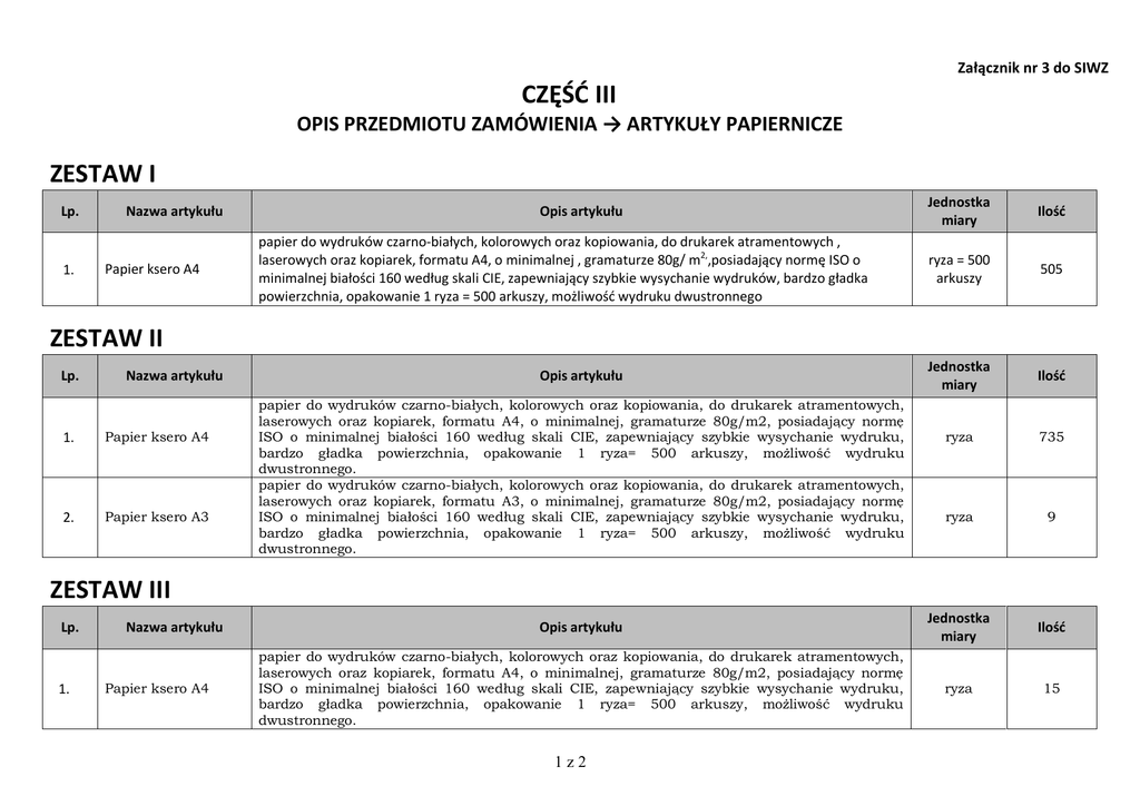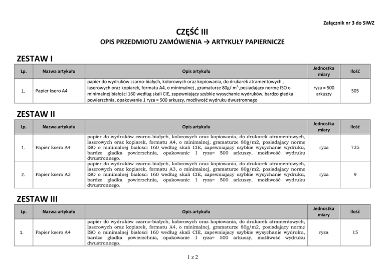 Załącznik nr 3 do SIWZ CZĘŚĆ III OPIS PRZEDMIOTU ZAMÓWIENIA → ARTYKUŁY PAPIERNICZE ZESTAW I Lp. 1. Nazwa artykułu Papier ksero A4 Jednostka miary Ilość ryza = 500 arkuszy 505 Jednostka miary Ilość ryza 735 ryza 9 Opis artykułu Jednostka miary Ilość papier do wydruków czarno-białych, kolorowych oraz kopiowania, do drukarek atramentowych, laserowych oraz kopiarek, formatu A4, o minimalnej, gramaturze 80g/m2, posiadający normę ISO o minimalnej białości 160 według skali CIE, zapewniający szybkie wysychanie wydruku, bardzo gładka powierzchnia, opakowanie 1 ryza= 500 arkuszy, możliwość wydruku dwustronnego. ryza 15 Opis artykułu papier do wydruków czarno-białych, kolorowych oraz kopiowania, do drukarek atramentowych , laserowych oraz kopiarek, formatu A4, o minimalnej , gramaturze 80g/ m2,,posiadający normę ISO o minimalnej białości 160 według skali CIE, zapewniający szybkie wysychanie wydruków, bardzo gładka powierzchnia, opakowanie 1 ryza = 500 arkuszy, możliwość wydruku dwustronnego ZESTAW II Lp. Nazwa artykułu 1. Papier ksero A4 2. Papier ksero A3 Opis artykułu papier do wydruków czarno-białych, kolorowych oraz kopiowania, do drukarek atramentowych, laserowych oraz kopiarek, formatu A4, o minimalnej, gramaturze 80g/m2, posiadający normę ISO o minimalnej białości 160 według skali CIE, zapewniający szybkie wysychanie wydruku, bardzo gładka powierzchnia, opakowanie 1 ryza= 500 arkuszy, możliwość wydruku dwustronnego. papier do wydruków czarno-białych, kolorowych oraz kopiowania, do drukarek atramentowych, laserowych oraz kopiarek, formatu A3, o minimalnej, gramaturze 80g/m2, posiadający normę ISO o minimalnej białości 160 według skali CIE, zapewniający szybkie wysychanie wydruku, bardzo gładka powierzchnia, opakowanie 1 ryza= 500 arkuszy, możliwość wydruku dwustronnego. ZESTAW III Lp. 1. Nazwa artykułu Papier ksero A4 1z2 ZESTAW IV Lp. Nazwa artykułu Opis artykułu Jednostka miary Ilość ryza 66 arkuszy 100 Opis artykułu Jednostka miary Ilość papier do wydruków czarno-białych, kolorowych oraz kopiowania, do drukarek atramentowych, laserowych oraz kopiarek, formatu A4, o minimalnej, gramaturze 80g/m2, posiadający normę ISO o minimalnej białości 160 według skali CIE, zapewniający szybkie wysychanie wydruku, bardzo gładka powierzchnia, opakowanie 1 ryza= 500 arkuszy, możliwość wydruku dwustronnego. ryza 30 1. Papier ksero A4 papier do wydruków czarno-białych, kolorowych oraz kopiowania, do drukarek atramentowych, laserowych oraz kopiarek, formatu A4, o minimalnej, gramaturze 80g/m2, posiadający normę ISO o minimalnej białości 160 według skali CIE, zapewniający szybkie wysychanie wydruku, bardzo gładka powierzchnia, opakowanie 1 ryza= 500 arkuszy, możliwość wydruku dwustronnego. 2. Papier kancelaryjny papier w kratkę formatu A3, arkusz składany do formatu A4 ZESTAW V Lp. 1. Nazwa artykułu Papier ksero A4 2z2