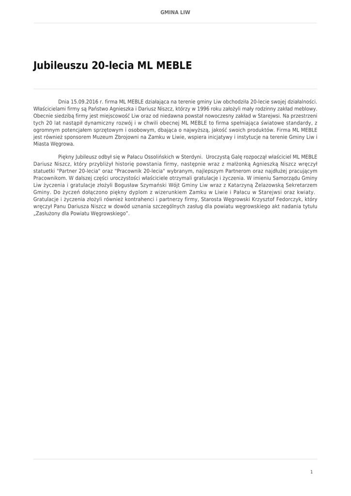GMINA LIW Jubileuszu 20-lecia ML MEBLE Dnia 15.09.2016 r. firma ML MEBLE działająca na terenie gminy Liw obchodziła 20-lecie swojej działalności. Właścicielami firmy są Państwo Agnieszka i Dariusz Niszcz, którzy w 1996 roku założyli mały rodzinny zakład meblowy. Obecnie siedzibą firmy jest miejscowość Liw oraz od niedawna powstał nowoczesny zakład w Starejwsi. Na przestrzeni tych 20 lat nastąpił dynamiczny rozwój i w chwili obecnej ML MEBLE to firma spełniająca światowe standardy, z ogromnym potencjałem sprzętowym i osobowym, dbająca o najwyższą, jakość swoich produktów. Firma ML MEBLE jest również sponsorem Muzeum Zbrojowni na Zamku w Liwie, wspiera inicjatywy i instytucje na terenie Gminy Liw i Miasta Węgrowa. Piękny Jubileusz odbył się w Pałacu Ossolińskich w Sterdyni. Uroczystą Galę rozpoczął właściciel ML MEBLE Dariusz Niszcz, który przybliżył historię powstania firmy, następnie wraz z małżonką Agnieszką Niszcz wręczył statuetki "Partner 20-lecia" oraz "Pracownik 20-lecia" wybranym, najlepszym Partnerom oraz najdłużej pracującym Pracownikom. W dalszej części uroczystości właściciele otrzymali gratulacje i życzenia. W imieniu Samorządu Gminy Liw życzenia i gratulacje złożyli Bogusław Szymański Wójt Gminy Liw wraz z Katarzyną Żelazowską Sekretarzem Gminy. Do życzeń dołączono piękny dyplom z wizerunkiem Zamku w Liwie i Pałacu w Starejwsi oraz kwiaty. Gratulacje i życzenia złożyli również kontrahenci i partnerzy firmy, Starosta Węgrowski Krzysztof Fedorczyk, który wręczył Panu Dariusza Niszcz w dowód uznania szczególnych zasług dla powiatu węgrowskiego akt nadania tytułu „Zasłużony dla Powiatu Węgrowskiego”. 1
