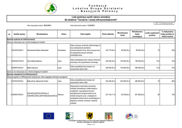 Lista zawierąca wyniki naboru wniosków dla działania "Tworzenie i rozwój mikroprzedsiębiorstw" Zał. 7.4. Książki procedur Data rozpoczęcia naboru: 29.04.2014 Lp. Symbol sprawy Wnioskodawca Data zakończenia naboru: 12.05.2014 Gmina Tytuł projektu Koszt całkowity Wnioskowana kwota Wnioskowana kwota (narastająco) % maksymalnej Liczba uzyskanych liczby punktów za punktów lokalne kryteria Operacje wybrane do dofinansowania Operacje mieszczące się w limicie dostępnych środków 1 001/M/VIII/2014 Gierszewski Marek Aleksander Przechlewo Zakup maszyny (automatu lakierniczego) w celu podwyższenia standardu konkurencyjności firmy, który przyczyni się do polepszenia pozycji rynkowej przedsiębiorstwa. 2 005//M/VIII/2014 Szulc Błażej Mateusz Lipka Zakup specjalistycznych maszyn rolniczych przyczepy oraz opryskiwacza rolniczego 246 000,00 zł 100 000,00 zł 199 500,00 zł 72,5 91% 3 006/M/VIII/2014 Bełka Dagmara Lipka Zakup specjalistycznej maszyny do czyszczenia nasion zbóż 282 900,00 zł 100 000,00 zł 299 500,00 zł 72,5 91% Zakup specjalistycznej maszyny do czyszczenia nasion zbóż 504 300,00 zł 200 000,00 zł 499 500,00 zł 70 88% Wyposażenie stanowiska serwisanta instalacji odnawialnych źródeł energii w urządzenia i wyposażenie biurowe, specjalistyczne oprogramowanie oraz środek transportu wraz z niezbędnymi narzędziami technicznymi umożliwiającymi diagnozę, kontrolę, wymianę i naprawę instalacji 227 155,17 zł 92 339,50 zł 591 839,50 zł 60 75% 244 770,00 zł 99 500,00 zł 99 500,00 zł 75 94% Operacje nie mieszczące się w limicie dostępnych środków* Operacje niewybrane do dofinansowania Operacje zgodne z LSR/konkursem tamtycznym, które osiągnęły minimalne wymagania 4 007/M/VIII/2014 5 004/M/VIII/2014 Bełka-Szulc Aleksandra Emilia Lipka SUN RESOURCES SPÓŁKA Z Debrzno OGRANICZONĄ ODPOWIEDZIALNOŚCIĄ Strona 1 z 2 Lp. Symbol sprawy Wnioskodawca Gmina Operacje wybrane do dofinansowania Tytuł projektu Koszt całkowity Wnioskowana kwota Wnioskowana kwota (narastająco) % maksymalnej Liczba uzyskanych liczby punktów za punktów lokalne kryteria 6 009/M/VIII/2014 Kopiszka Agnieszka Magdalena Lipka Rozpoczęcie działalności gospodarczej oraz stworzenie dodatkowego źródła dochodu poprzez zakup sprzętu - 2 szt przyczep oraz 1 szt pługa obracalnego wraz z ramieniem do wału 7 003/M/VIII/2014 Kołatka Grzegorz Roman Człuchów Zakup maszyn do cięcia wodą wraz z adaptacją pomieszczeń, instalacji i montażem maszyny 690 486,00 zł 280 685,50 zł 972 525,00 zł 55 69% Człuchów Budowa budynku gospodarczomagazynowego z przeznaczeniem na warsztat elektromechaniczny 791 603,00 zł 200 000,00 zł 1 172 525,00 zł 40 50% 30 531,06 zł 12 411,00 zł 1 184 936,00 zł 25 31% 8 002/M/VIII/2014 Hruszka-Meyer Lucyna 9 008/M/VIII/2014 Ziach Aldona Zakrzewo Założenie biura rachunkowego Operacje zgodne z LSR/ konkursem tematycznym, które nie osiągneły minimalnych wymagań Operacje niezgodne z LSR/ konkursem tematycznym * tylko w przypadku podania do publicznej wiadomości informacji o możliwści składania wniosków o przyznanie pomocy po raz ostatni Strona 2 z 2 247 230,00 zł 100 000,00 zł 691 839,50 zł 57,5 72%