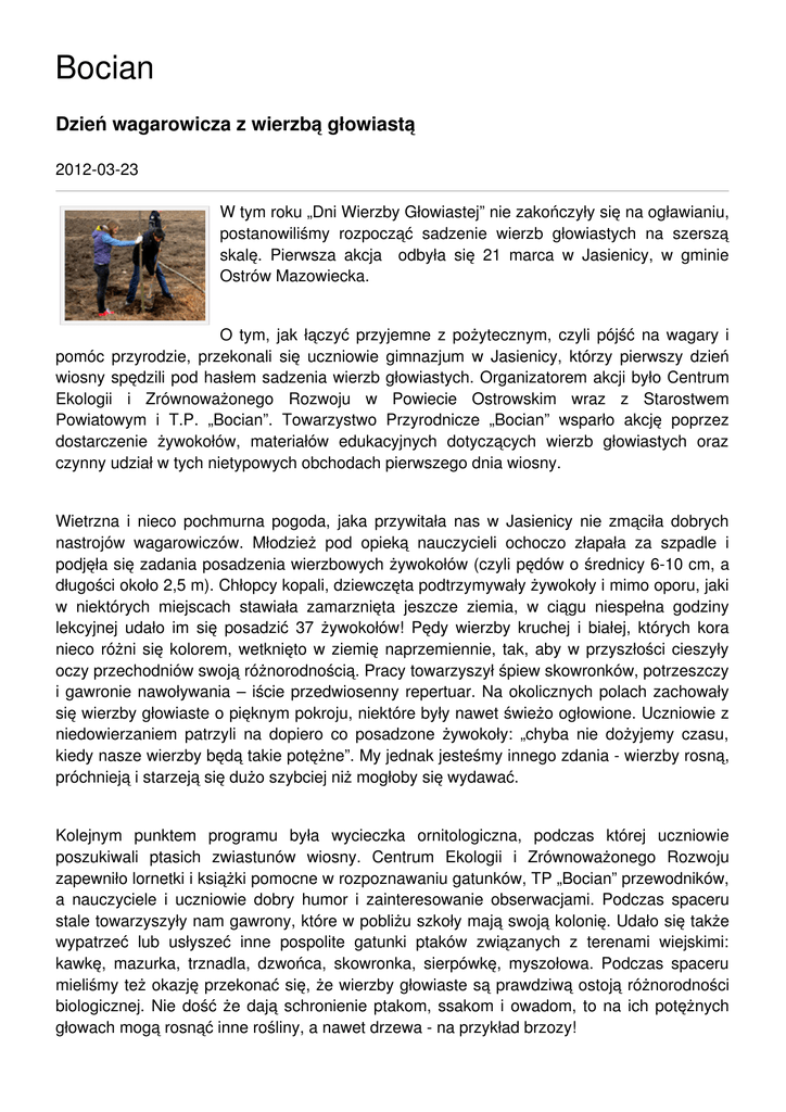 Bocian Dzień wagarowicza z wierzbą głowiastą 2012-03-23 W tym roku „Dni Wierzby Głowiastej” nie zakończyły się na ogławianiu, postanowiliśmy rozpocząć sadzenie wierzb głowiastych na szerszą skalę. Pierwsza akcja odbyła się 21 marca w Jasienicy, w gminie Ostrów Mazowiecka. O tym, jak łączyć przyjemne z pożytecznym, czyli pójść na wagary i pomóc przyrodzie, przekonali się uczniowie gimnazjum w Jasienicy, którzy pierwszy dzień wiosny spędzili pod hasłem sadzenia wierzb głowiastych. Organizatorem akcji było Centrum Ekologii i Zrównoważonego Rozwoju w Powiecie Ostrowskim wraz z Starostwem Powiatowym i T.P. „Bocian”. Towarzystwo Przyrodnicze „Bocian” wsparło akcję poprzez dostarczenie żywokołów, materiałów edukacyjnych dotyczących wierzb głowiastych oraz czynny udział w tych nietypowych obchodach pierwszego dnia wiosny. Wietrzna i nieco pochmurna pogoda, jaka przywitała nas w Jasienicy nie zmąciła dobrych nastrojów wagarowiczów. Młodzież pod opieką nauczycieli ochoczo złapała za szpadle i podjęła się zadania posadzenia wierzbowych żywokołów (czyli pędów o średnicy 6-10 cm, a długości około 2,5 m). Chłopcy kopali, dziewczęta podtrzymywały żywokoły i mimo oporu, jaki w niektórych miejscach stawiała zamarznięta jeszcze ziemia, w ciągu niespełna godziny lekcyjnej udało im się posadzić 37 żywokołów! Pędy wierzby kruchej i białej, których kora nieco różni się kolorem, wetknięto w ziemię naprzemiennie, tak, aby w przyszłości cieszyły oczy przechodniów swoją różnorodnością. Pracy towarzyszył śpiew skowronków, potrzeszczy i gawronie nawoływania – iście przedwiosenny repertuar. Na okolicznych polach zachowały się wierzby głowiaste o pięknym pokroju, niektóre były nawet świeżo ogłowione. Uczniowie z niedowierzaniem patrzyli na dopiero co posadzone żywokoły: „chyba nie dożyjemy czasu, kiedy nasze wierzby będą takie potężne”. My jednak jesteśmy innego zdania - wierzby rosną, próchnieją i starzeją się dużo szybciej niż mogłoby się wydawać. Kolejnym punktem programu była wycieczka ornitologiczna, podczas której uczniowie poszukiwali ptasich zwiastunów wiosny. Centrum Ekologii i Zrównoważonego Rozwoju zapewniło lornetki i książki pomocne w rozpoznawaniu gatunków, TP „Bocian” przewodników, a nauczyciele i uczniowie dobry humor i zainteresowanie obserwacjami. Podczas spaceru stale towarzyszyły nam gawrony, które w pobliżu szkoły mają swoją kolonię. Udało się także wypatrzeć lub usłyszeć inne pospolite gatunki ptaków związanych z terenami wiejskimi: kawkę, mazurka, trznadla, dzwońca, skowronka, sierpówkę, myszołowa. Podczas spaceru mieliśmy też okazję przekonać się, że wierzby głowiaste są prawdziwą ostoją różnorodności biologicznej. Nie dość że dają schronienie ptakom, ssakom i owadom, to na ich potężnych głowach mogą rosnąć inne rośliny, a nawet drzewa - na przykład brzozy! Po dobrze wykonanej pracy i obserwacjach przyszedł czas na pokrzepienie ciała – ognisko z kiełbaskami. Mamy nadzieję, że gimnazjaliści z Jasienicy będą wspominać ten dzień równie miło jak my, a przede wszystkim, że akcje takie jak ta pomogą podtrzymać pożyteczny zwyczaj sadzenia i ogławiania wierzb. Trzymamy też kciuki za przyjęcie się nowego jasienickiego szpaleru wierzb! Kolejne akcje sadzenia wierzb głowiastych już wkrótce, sezon dopiero się rozpoczyna! Podziękowania: Dziękujemy za możliwość pozyskania żywokołów z wierzb rosnących na działce Mariusza Jońskiego w Secyminie Nowym, żywokoły pozyskali i dostarczyli wolontariusze TP Bocian: Przemysław Kurdej i Adam Tarłowski. Dziękujemy za współpracę przy sadzeniu wierzb Powiatowemu Zarządowi Dróg z Ostrowi Mazowieckiej, którego pracownicy wyznaczyli miejsca sadzenia żywokołów. Aleksandra Wierzbicka O akcji pisała też prasa lokalna: Tygodnik Ostrołęcki - zaproszenie Tygodnik Ostrołęcki - sprawozdanie