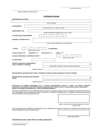 .................................................. (miejscowość i data) ............................................................ (pieczęć nagłówkowa zakładu pracy) ZAŚWIADCZENIE Zaświadcza się, że Pan/i: (imię i nazwisko) zamieszkały/a ( miejscowość, ulica, nr domu, nr lokalu) legitymujący/a się (dowód osobisty/karta stałego pobytu, seria i numer) nr ewidencyjny według PESEL jest/był/a* zatrudniony/a w (nazwa i adres zakładu pracy, numer telefonu) od dnia - - na podstawie: (dzień, miesiąc, rok) umowy o pracę powołania mianowania wyboru na czas nieokreślony / określony do dnia * - (dzień, miesiąc, rok) na stanowisku Średnie miesięczne wynagrodzenie netto z ostatnich 3 miesięcy: zł (bez podatku i składek na ubezp. zdrowotne i społeczne) słownie złotych: Wynagrodzenie powyższe jest/ nie jest * obciążone z tytułu wyroków sądowych lub innych tytułów. Wynagrodzenie powyższe jest obciążone kwotą: zł słownie złotych: Pracownik nie znajduje się/znajduje się* w okresie wypowiedzenia umowy o pracę*, na okresie próbnym*, pracownikowi doręczono /pracownik doręczył wypowiedzenie umowy o pracę*, nie jest pracownikiem sezonowym*. Zakład nie znajduje się/znajduje się* w stanie likwidacji/upadłości*. Wystawca Zaświadczenia ponosi odpowiedzialność prawną w przypadku podania danych niezgodnych ze stanem faktycznym, oraz zobowiązuje się do potwierdzenia danych zawartych w niniejszym Zaświadczeniu w przypadku telefonicznego zapytania pracownika Banku Ochrony Środowiska SA. (podpis i stempel imienny osoby upoważnionej w imieniu zakładu pracy) Klient wyraża zgodę na telefoniczne sprawdzenie w w/w. zakładzie pracy danych zawartych w niniejszym zaświadczeniu przez pracownika Banku Ochrony Środowiska SA. (data i podpis Klienta) Zaświadczenie jest ważne 30 dni od daty wystawienia. -------------------------------*niepotrzebne skreślić