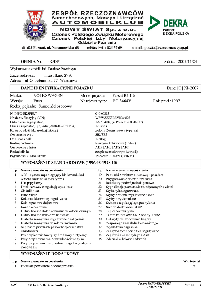 OPINIA Nr: 02/DP z dnia: 2007/11/24 Wykonawca opinii : inż. Dariusz Pawliszyn Zleceniodawca: Invest Bank S>A Adres: ul. Ostrobramska 77 Warszawa DANE IDENTYFIKACYJNE POJAZDU Marka: VOLKSWAGEN Wersja: Basis Rodzaj pojazdu: Samochód osobowy Dane: [O] XI-2007 Model pojazdu: Nr rejestracyjny: Nr INFO-EKSPERT Nr identyfikacyjny (VIN) Data pierwszej rejestracji Okres eksploatacji pojazdu (97/04/02-07/11/24) Kolor powłoki lak., (rodzaj lakieru) Oznaczenie typu Dop. masa całk. Rodzaj nadwozia Oznaczenie silnika Rodzaj silnika Pojemność / Moc silnika Passat B5 1.6 PO 3464V Rok prod.: 1997 040-00883 WVWZZZ3BZVE084893 1997/04/02, (w Polsce: 2005/09/27) 128 mies. zielony 2-warstwowy typu uni 3B2/3B5 1750 kg limuzyna 4 drzwiowa (sedan) ADP | AHL | AKS | AFT z zapłonem iskrowym (wtrysk) 1595 ccm / 74kW (101KM) WYPOSAŻENIE STANDARDOWE (1996.08-1998.10) L.p. 1 2 3 4 5 6 7 8 9 10 11 12 13 14 15 16 17 18 Nazwa elementu wyposażenia ABS - system zapobiegający blokowaniu kół Antena radiowa automatyczna Filtr p/pyłkowy Fotel kierowcy z regulacją wysokości Głośniki 4 szt. Immobilizer Kolumna kierownicy regulowana Koło zapasowe dojazdowe Konsola centralna Listwy boczne dolne ochronne w kolorze czarnym Listwy boczne w kolorze nadwozia Lusterka zewnętrzne regulowane elektrycznie Lusterka zewnętrzne w kolorze nadwozia Napinacze przednich pasów bezpieczeństwa Obrotomierz Pas bezpieczeństwa tylny środkowy statyczny Pasy bezpieczeństwa bezwładnościowe tylne Pasy bezpieczeństwa przednie z regul. wysokości mocowania L.p. 19 20 21 22 23 24 25 26 27 28 29 30 31 32 33 34 35 Nazwa elementu wyposażenia Poduszki powietrzne kierowcy i pasażera Przygotowanie do montażu radia Reflektory podwójne halogenowe Sygnalizacja pozostawienia włączonych świateł Szyba tylna ogrzewana Szyby przednie regulowane elektr. Szyby przyciemniane Światła z regulacją kąta pochylenia Światło dodatkowe STOP Tapicerka tekstylna Tarcze kół stalowe 6Jx15 opony 195/65 Uchwyty do mocowania bagażu Wspomaganie układu kierowniczego Wykładzina bagażnika Zagłówki foteli przednich regulowane Zagłówki siedzeń tylnych 2 szt. Zderzaki w kolorze nadwozia WYPOSAŻENIE DODATKOWE L.p. Nazwa elementu wyposażenia 1 Poduszki powietrzne boczne przednie 3.26 19146 inż. Dariusz Pawliszyn Wartość [zł] 96 System INFO-EKSPERT / SRTSiRD Strona 1 02/DP OPIS ZAMONTOWANEGO W POJEŹDZIE OGUMIENIA Koło Przednie lewe: Przednie prawe: Tylne lewe: Tylne prawe: Marka, typ PLATIN 195/65 R15 91H PLATIN 195/65 R15 91H DUNLOP 195/65 R15 91H PLATIN 195/65 R15 91H WINTER RP 30 WINTER RP 30 SP SPORT 200E TL DIAMANT RP 30 TL Bieżnik [mm] Zużycie [% ] 90 90 70 80 STAN TECHNICZNY POJAZDU Pojazd jest po kolizji drogowej. Podczas ogledzin nie można odczytać wzkazań drogomierza.Brak mozliwości uruchomienia pojazdu i przeprowadzenia jazdy próbnej.Z powodu ugiętej ściany grodziowej brak mozliwosci oddczytania i sfotografowania numeru VIN. Pojazd posiada uszkodzone nastepuj,ace elementy: - pokrywa komory silnika-trwale odkształcona - błotnik przedni lewy- trwale odkształcony - błotnik przedni prawy -trwale odkształcony - podłużnica przednia lewa-ugieta - podłuznica przednia prawa- ugieta - ściana grodzowa- ugięta - wzmocnienie czołowe- brak - reflektor przedni lewy i prawy-brak - zderzak przedni- trwale odkształcony - obudowa filtra powietrza- trwale odkształcona - chłodnica cieczy chłodzącej-brak - szyba czołowa- peknieta w kilku miejscach - wzmocnienie dolne- trwale odkształcone - jednostka napedowa wraz ze skrzynia biegów- cofnięta w kierunku kabiny - poduszka powietrzna kierowcy- brak - lewarek skrzyni biegów- brak mozliwosci ruszenia - błotnik tylny lewy- ugięty w ciąści dolnej - drzwi tylne lewe- ugiete i zarysowane - drzwi przednie lewe- ugiete i zarysowane - drzwi przednie lewe- tapicerka wyrwana z mocowań - lusterko zewnętrzne lewe- brak wkładu lusterka Zastrzeżenia Ograniczające Rzeczoznawca nie bierze na siebie odpowiedzialności za wady ukryte i skutki wynikające z dalszego użytkowania przedmiotu wyceny, a także za skutki wykorzystania samej wyceny. Powyższa wycena nie jest ekspertyzą stanu technicznego przedmiotu oszacowania i za taką nie może być uznawana, w szczególności nie może być traktowana jako gwarancja sprzedaży przedmiotu wyceny za cenę równą oszacowanej wartości. Nie badano poprawności ani budowy numerów identyfikacyjnych pojazdu. Nie weryfikowano także prawdziwości pozostałych danych pojazdu (w tym roku produkcji), które przyjęto wg. przedstawionych dokumentów. Nie badano tytułu użytkowania ani tytułu własności przedmiotu wyceny. Nie weryfikowano także ewentualnego istnienia ograniczonych praw rzeczowych. - 3.26 19146 inż. Dariusz Pawliszyn System INFO-EKSPERT / SRTSiRD Strona 2 02/DP KOREKTY WARTOŚĆ BAZOWA BRUTTO (126 mies.) .................................... KOREKTA ZA WYPOSAŻENIE DODATKOWE ................................. KOREKTA ZA PIERWSZĄ REJESTRACJĘ ..................................... KOREKTA ZA OGUMIENIE ................................................. KOREKTY RÓŻNE ........................................................ W tym: [%] Wartość [zł] Stan utrzymania i dbałość o pojazd Zadana szacunkowa korekta z tytułu wcześniejszych napraw Korekta z tytułu wymaganych napraw -5,0 -10,0 -30,0 - 777 -1 555 -4 667 15 650 zł 96 zł - 188 zł - 383 zł - 6 999 zł Wartość rynkowa brutto wyżej zidentyfikowanego pojazdu, określona na dzień wykonania opinii wynosi: 8200 zł (słownie: osiem tysięcy dwieście złotych) w tym VAT: 1478,69 zł Wartość określono na podstawie: - notowań rynkowych z katalogu 'Pojazdy Samochodowe - Wartości Rynkowe XI-2007 ' zaakceptowanych przez wykonawcę opinii, - korekt mających wpływ na wartość pojazdu 3.26 19146 inż. Dariusz Pawliszyn System INFO-EKSPERT / SRTSiRD Strona 3 ARKUSZ USTALENIA WARTOŚCI POJAZDU do opinii nr: 02/DP z dnia: 2007/11/24 Wykonawca opinii : inż. Dariusz Pawlis