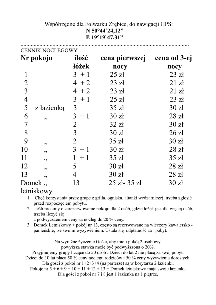 Współrzędne dla Folwarku Zrębice, do nawigacji GPS: N 50°44`24,12” E 19°19`47,31” .................................................................................................................... CENNIK NOCLEGOWY Nr pokoju 1 2 3 4 5 z łazienką 6 „ 7 8 9 „ 10 „ 11 „ 12 „ 13 „ Domek „ letniskowy ilość łóżek 3 +1 4 +2 4 +2 3 +1 3 3 +1 2 3 2 3 +1 1 +1 5 4 13 cena pierwszej nocy 25 zł 23 zł 23 zł 25 zł 35 zł 30 zł 32 zł 30 zł 35 zł 30 zł 35 zł 30 zł 30 zł 25 zł- 35 zł cena od 3-ej nocy 23 zł 21 zł 21 zł 23 zł 30 zł 28 zł 30 zł 26 zł 30 zł 28 zł 35 zł 28 zł 28 zł 30 zł 1. Chęć korzystania przez grupę z grilla, ogniska, altanki wędzarniczej, trzeba zgłosić przed rozpoczęciem pobytu. 2. Jeśli prosimy o zarezerwowanie pokoju dla 2 osób, gdzie łóżek jest dla więcej osób, trzeba liczyć się z podwyższeniem ceny za nocleg do 20 % ceny. 3. Domek Letniskowy + pokój nr 13, często są rezerwowane na wieczory kawalersko panieńskie, ze swoim wyżywieniem. Ustala się odpłatność za pobyt. Na wyraźne życzenie Gości, aby mieli pokój 2 osobowy, powyższa stawka może być podwyższona o 20%. Przyjmujemy grupy liczące do 50 osób . Dzieci do lat 2 nie płacą za swój pobyt. Dzieci do 10 lat płacą 50 % ceny noclegu rodziców i 50 % ceny wyżywienia dorosłych. Dla gości z pokoi nr 1+2+3+4 (na parterze) są w korytarzu 2 łazienki. Pokoje nr 5 + 6 + 9 + 10 + 11 + 12 + 13 + Domek letniskowy mają swoje łazienki. Dla gości z pokoi nr 7 i 8 jest 1 łazienka na 1 piętrze. CENNIK WYŻYWIENIA Wyżywienie: Śniadanie 12 zł | obiad 18 zł | kolacja 12 zł Suchy prowiant – 12 zł = dla osób, które go zamówiły, gdy jedzą po śniadaniu dopiero obiadokolację. Ze stołówki nie można wynosić komponentów na „drugie śniadanie” Dzieci do 10 lat za wyżywienie płacą: Śniadanie 6 zł | obiad 9 zł | kolacja 6 zł Dzieci do 14 lat płacą : Śniadanie 8,5 zł | obiad 13 zł | kolacja 8,5 zł Rodzaj szkoły Podstawowa Gimnazjum śniadanie 11,00 zł 11 zł Wycieczki Szkolne obiadokolacja wyżywienie 15,00 zł 26,00 zł 15 zł 26 zł noclegi 18,00 zł 20,00 zł osobodzień 44,00 zł 46,00 zł Grupy sportowców – ceny na wyżywienie mogą być podwyższone od 10 do 40 % Grupy liczące powyżej 40 uczniów - uczestników i przebywające w Folwarku minimum 2 pełne doby mogą otrzymać upust na wyżywienie od 1 do 10 %. Za 10 uczniów 1 Wychowawca otrzymuje nocleg bezpłatnie. Wycieczki autokarowe dorosłych, przyjęcia okolicznościowe, wyżywienie i nocleg śniadani obiad kolacja wyżywienie nocleg osobodzień grill e 12 zł 18 zł 12 zł 42 zł 28 do 33 zł 42 zł + do 30 zł 18 do 28 zł Użyczenie kącika gilowego grupie+ nakryć stołowych i talerzy od 19.oo do 22.oo kosztuje 2 zł od 1 osoby. Wypożyczone wyposażenie z kuchni należy zwrócić czyste. W Folwarku są kuchnie gazowe i czajniki. Nie używamy własnych czajników elektrycznych. W pokojach są parkiety. Jesteśmy wdzięczni za przywożenie z sobą kapci. W całym domu nie palimy papierosów. Są do tego wyznaczone miejsca. Folwark Zrębice. 42-256 Zrębice, ul. Główna 17, tel. 605 532 097 i 34 328 62 28