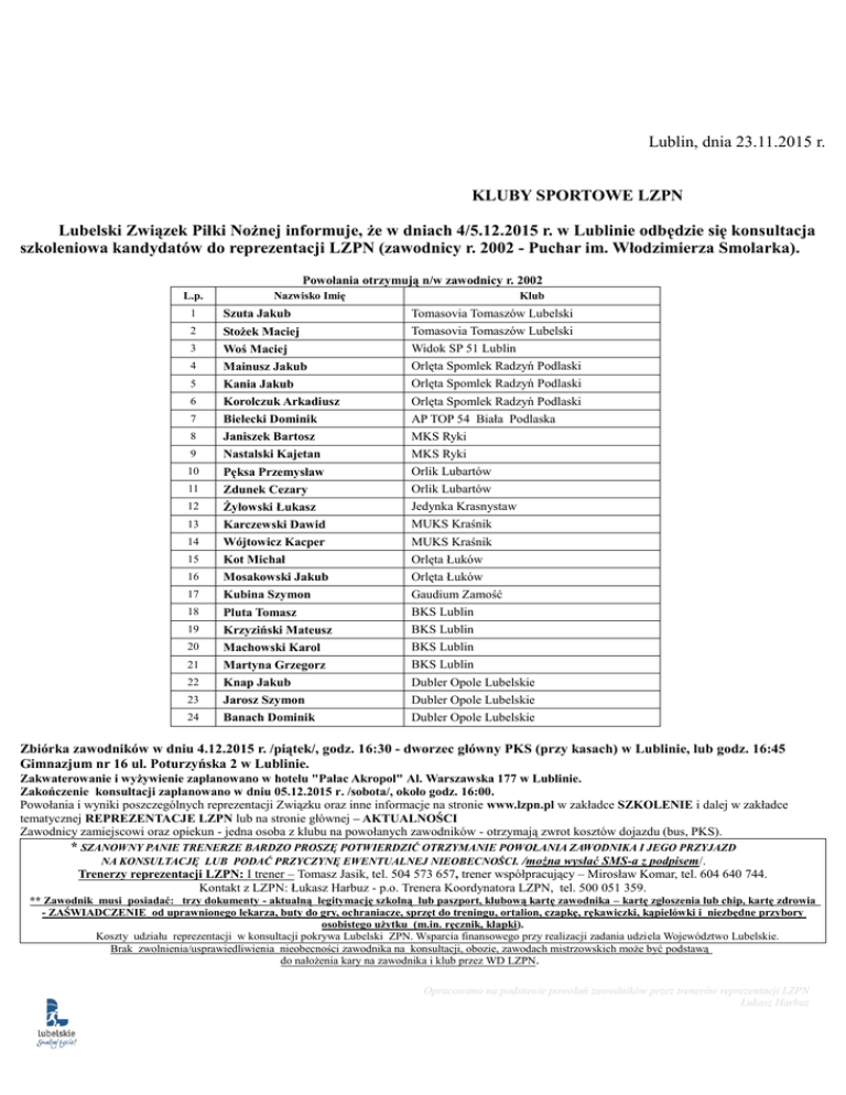 Lublin, dnia 23.11.2015 r. KLUBY SPORTOWE LZPN Lubelski Związek Piłki Nożnej informuje, że w dniach 4/5.12.2015 r. w Lublinie odbędzie się konsultacja szkoleniowa kandydatów do reprezentacji LZPN (zawodnicy r. 2002 - Puchar im. Włodzimierza Smolarka). Powołania otrzymują n/w zawodnicy r. 2002 L.p. Nazwisko Imię Klub 1 Szuta Jakub Tomasovia Tomaszów Lubelski 2 Stożek Maciej Woś Maciej Tomasovia Tomaszów Lubelski Widok SP 51 Lublin Mainusz Jakub Kania Jakub Orlęta Spomlek Radzyń Podlaski Orlęta Spomlek Radzyń Podlaski Korolczuk Arkadiusz Bielecki Dominik Orlęta Spomlek Radzyń Podlaski AP TOP 54 Biała Podlaska Janiszek Bartosz Nastalski Kajetan MKS Ryki MKS Ryki Pęksa Przemysław Zdunek Cezary Orlik Lubartów Orlik Lubartów Żyłowski Łukasz Karczewski Dawid Jedynka Krasnystaw MUKS Kraśnik Wójtowicz Kacper Kot Michał MUKS Kraśnik Orlęta Łuków Mosakowski Jakub Kubina Szymon Orlęta Łuków Gaudium Zamość Pluta Tomasz Krzyziński Mateusz BKS Lublin BKS Lublin Machowski Karol Martyna Grzegorz BKS Lublin BKS Lublin 23 Knap Jakub Jarosz Szymon Dubler Opole Lubelskie Dubler Opole Lubelskie 24 Banach Dominik Dubler Opole Lubelskie 3 4 5 6 7 8 9 10 11 12 13 14 15 16 17 18 19 20 21 22 Zbiórka zawodników w dniu 4.12.2015 r. /piątek/, godz. 16:30 - dworzec główny PKS (przy kasach) w Lublinie, lub godz. 16:45 Gimnazjum nr 16 ul. Poturzyńska 2 w Lublinie. Zakwaterowanie i wyżywienie zaplanowano w hotelu "Pałac Akropol" Al. Warszawska 177 w Lublinie. Zakończenie konsultacji zaplanowano w dniu 05.12.2015 r. /sobota/, około godz. 16:00. Powołania i wyniki poszczególnych reprezentacji Związku oraz inne informacje na stronie www.lzpn.pl w zakładce SZKOLENIE i dalej w zakładce tematycznej REPREZENTACJE LZPN lub na stronie głównej – AKTUALNOŚCI Zawodnicy zamiejscowi oraz opiekun - jedna osoba z klubu na powołanych zawodników - otrzymają zwrot kosztów dojazdu (bus, PKS). * SZANOWNY PANIE TRENERZE BARDZO PROSZĘ POTWIERDZIĆ OTRZYMANIE POWOŁANIA ZAWODNIKA I JEGO PRZYJAZD NA KONSULTACJĘ LUB PODAĆ PRZYCZYNĘ EWENTUALNEJ NIEOBECNOŚCI. /można wysłać SMS-a z podpisem/. Trenerzy reprezentacji LZPN: I trener – Tomasz Jasik, tel. 504 573 657, trener współpracujący – Mirosław Komar, tel. 604 640 744. Kontakt z LZPN: Łukasz Harbuz - p.o. Trenera Koordynatora LZPN, tel. 500 051 359. ** Zawodnik musi posiadać: trzy dokumenty - aktualną legitymację szkolną lub paszport, klubową kartę zawodnika – kartę zgłoszenia lub chip, kartę zdrowia - ZAŚWIADCZENIE od uprawnionego lekarza, buty do gry, ochraniacze, sprzęt do treningu, ortalion, czapkę, rękawiczki, kąpielówki i niezbędne przybory osobistego użytku (m.in. ręcznik, klapki). Koszty udziału reprezentacji w konsultacji pokrywa Lubelski ZPN. Wsparcia finansowego przy realizacji zadania udziela Województwo Lubelskie. Brak zwolnienia/usprawiedliwienia nieobecności zawodnika na konsultacji, obozie, zawodach mistrzowskich może być podstawą do nałożenia kary na zawodnika i klub przez WD LZPN. Opracowano na podstawie powołań zawodników przez trenerów reprezentacji LZPN Łukasz Harbuz