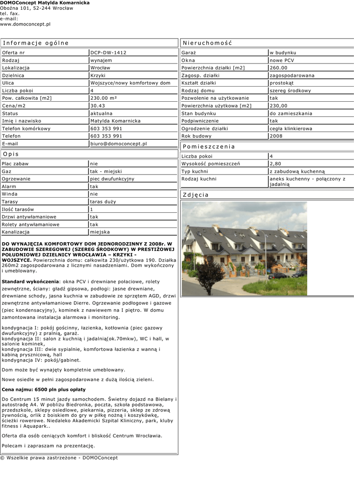 DOMOConcept Matylda Komarnicka Oboźna 101, 52-244 Wrocław tel. fax. e-mail: www.domoconcept.pl Informacje ogólne Nieruchomość Oferta nr DCP-DW-1412 Garaż w budynku Rodzaj wynajem Okna nowe PCV Lokalizacja Wrocław Powierzchnia działki [m2] 260.00 Dzielnica Krzyki Zagosp. działki zagospodarowana Ulica Wojszyce/nowy komfortowy dom Kształt działki prostokąt Liczba pokoi 4 Rodzaj domu szereg środkowy Pow. całkowita [m2] 230.00 m² Pozwolenie na użytkowanie tak Cena/m2 30.43 Powierzchnia użytkowa [m2] 230,00 Status aktualna Stan budynku do zamieszkania Imię i nazwisko Matylda Komarnicka Podpiwniczenie tak Telefon komórkowy 603 353 991 Ogrodzenie działki cegła klinkierowa Telefon 603 353 991 Rok budowy 2008 E-mail [email protected] Opis Pomieszczenia Liczba pokoi 4 Plac zabaw nie Wysokość pomieszczeń 2,80 Gaz tak - miejski Typ kuchni z zabudową kuchenną Ogrzewanie piec dwufunkcyjny Rodzaj kuchni Alarm tak aneks kuchenny - połączony z jadalnią Winda nie Tarasy taras duży Ilość tarasów 1 Drzwi antywłamaniowe tak Rolety antywłamaniowe tak Kanalizacja miejska DO WYNAJĘCIA KOMFORTOWY DOM JEDNORODZINNY Z 2008r. W ZABUDOWIE SZEREGOWEJ (SZEREG ŚRODKOWY) W PRESTIŻOWEJ POŁUDNIOWEJ DZIELNICY WROCŁAWIA – KRZYKI WOJSZYCE. Powierzchnia domu: całkowita 230/użytkowa 190. Działka 260m2 zagospodarowana z licznymi nasadzeniami. Dom wykończony i umeblowany. Standard wykończenia: okna PCV i drewniane połaciowe, rolety zewnętrzne, ściany: gładź gipsowa, podłogi: jasne drewniane, drewniane schody, jasna kuchnia w zabudowie ze sprzętem AGD, drzwi zewnętrzne antywłamaniowe Dierre. Ogrzewanie podłogowe i gazowe (piec kondensacyjny), kominek z nawiewem na I piętro. W domu zamontowana instalacja alarmowa i monitoring. kondygnacja I: pokój gościnny, łazienka, kotłownia (piec gazowy dwufunkcyjny) z pralnią, garaż. kondygnacja II: salon z kuchnią i jadalnią( ok.70mkw), WC i hall, w salonie kominek, kondygnacja III: dwie sypialnie, komfortowa łazienka z wanną i kabiną prysznicową, hall kondygnacja IV: pokój/gabinet. Dom może być wynajęty kompletnie umeblowany. Nowe osiedle w pełni zagospodarowane z dużą ilością zieleni. Cena najmu: 6500 pln plus opłaty Do Centrum 15 minut jazdy samochodem. Świetny dojazd na Bielany i autostradę A4. W pobliżu Biedronka, poczta, szkoła podstawowa, przedszkole, sklepy osiedlowe, piekarnia, pizzeria, sklep ze zdrową żywnością, orlik z boiskiem do gry w piłkę nożną i koszykówkę, ścieżki rowerowe. Niedaleko Akademicki Szpital Kliniczny, park, kluby fitness i Aquapark.. Oferta dla osób ceniących komfort i bliskość Centrum Wrocławia. Polecam i zapraszam na prezentację. © Wszelkie prawa zastrzeżone - DOMOConcept Zdjęcia