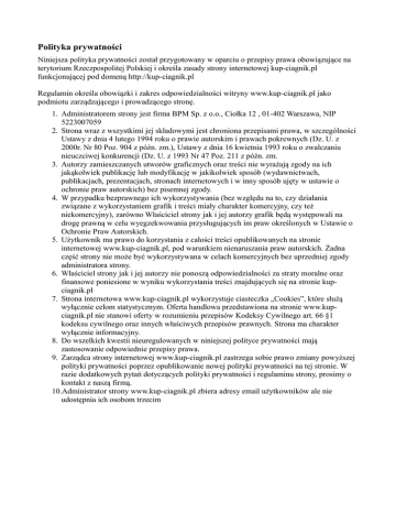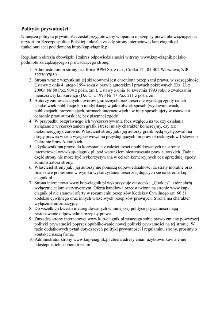 Polityka prywatności Niniejsza polityka prywatności został przygotowany w oparciu o przepisy prawa obowiązujące na terytorium Rzeczpospolitej Polskiej i określa zasady strony internetowej kup-ciagnik.pl funkcjonującej pod domeną http://kup-ciagnik.pl Regulamin określa obowiązki i zakres odpowiedzialności witryny www.kup-ciagnik.pl jako podmiotu zarządzającego i prowadzącego stronę. 1. Administratorem strony jest firma BPM Sp. z o.o., Ciołka 12 , 01-402 Warszawa, NIP 5223007059 2. Strona wraz z wszystkimi jej składowymi jest chroniona przepisami prawa, w szczególności Ustawy z dnia 4 lutego 1994 roku o prawie autorskim i prawach pokrewnych (Dz. U. z 2000r. Nr 80 Poz. 904 z późn. zm.), Ustawy z dnia 16 kwietnia 1993 roku o zwalczaniu nieuczciwej konkurencji (Dz. U. z 1993 Nr 47 Poz. 211 z późn. zm. 3. Autorzy zamieszczanych utworów graficznych oraz treści nie wyrażają zgody na ich jakąkolwiek publikację lub modyfikację w jakikolwiek sposób (wydawnictwach, publikacjach, prezentacjach, stronach internetowych i w inny sposób ujęty w ustawie o ochronie praw autorskich) bez pisemnej zgody. 4. W przypadku bezprawnego ich wykorzystywania (bez względu na to, czy działania związane z wykorzystaniem grafik i treści miały charakter komercyjny, czy też niekomercyjny), zarówno Właściciel strony jak i jej autorzy grafik będą występowali na drogę prawną w celu wyegzekwowania przysługujących im praw określonych w Ustawie o Ochronie Praw Autorskich. 5. Użytkownik ma prawo do korzystania z całości treści opublikowanych na stronie internetowej www.kup-ciagnik.pl, pod warunkiem nienaruszania praw autorskich. Żadna część strony nie może być wykorzystywana w celach komercyjnych bez uprzedniej zgody administratora strony. 6. Właściciel strony jak i jej autorzy nie ponoszą odpowiedzialności za straty moralne oraz finansowe poniesione w wyniku wykorzystania treści znajdujących się na stronie kupciagnik.pl 7. Strona internetowa www.kup-ciagnik.pl wykorzystuje ciasteczka „Cookies”, które służą wyłącznie celom statystycznym. Oferta handlowa przedstawiona na stronie www.kupciagnik.pl nie stanowi oferty w rozumieniu przepisów Kodeksy Cywilnego art. 66 §1 kodeksu cywilnego oraz innych właściwych przepisów prawnych. Strona ma charakter wyłącznie informacyjny. 8. Do wszelkich kwestii nieuregulowanych w niniejszej polityce prywatności mają zastosowanie odpowiednie przepisy prawa. 9. Zarządca strony internetowej www.kup-ciagnik.pl zastrzega sobie prawo zmiany powyższej polityki prywatności poprzez opublikowanie nowej polityki prywatności na tej stronie. W razie dodatkowych pytań dotyczących polityki prywatności i regulaminu strony, prosimy o kontakt z naszą firmą. 10.Administrator strony www.kup-ciagnik.pl zbiera adresy email użytkowników ale nie udostępnia ich osobom trzecim