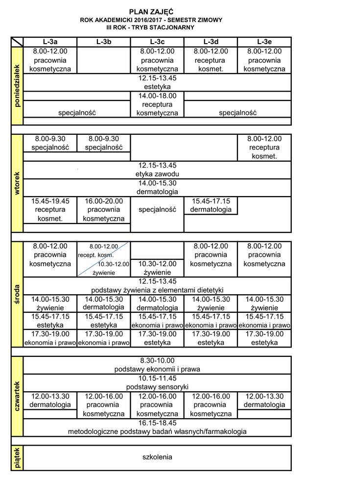 PLAN ZAJĘĆ poniedziałek ROK AKADEMICKI 2016/2017 - SEMESTR ZIMOWY III ROK - TRYB STACJONARNY L-3a 8.00-12.00 pracownia kosmetyczna L-3b specjalność 8.00-9.30 specjalność L-3c 8.00-12.00 pracownia kosmetyczna 12.15-13.45 estetyka 14.00-18.00 receptura kosmetyczna L-3e 8.00-12.00 pracownia kosmetyczna specjalność 8.00-9.30 specjalność 8.00-12.00 receptura kosmet. wtorek 12.15-13.45 etyka zawodu 14.00-15.30 dermatologia 15.45-19.45 receptura kosmet. 16.00-20.00 pracownia kosmetyczna specjalność 8.00-12.00 8.00-12.00 pracownia recept. kosm. kosmetyczna 10.30-12.00 15.45-17.15 dermatologia 8.00-12.00 pracownia kosmetyczna 8.00-12.00 pracownia kosmetyczna czwartek 10.30-12.00 żywienie żywienie 12.15-13.45 podstawy żywienia z elementami dietetyki 14.00-15.30 14.00-15.30 14.00-15.30 14.00-15.30 14.00-15.30 dermatologia żywienie dermatologia żywienie żywienie 15.45-17.15 15.45-17.15 15.45-17.15 15.45-17.15 15.45-17.15 ekonomia i prawo ekonomia i prawo ekonomia i prawo estetyka estetyka 17.30-19.00 17.30-19.00 17.30-19.00 17.30-19.00 17.30-19.00 estetyka estetyka estetyka ekonomia i prawo ekonomia i prawo 8.30-10.00 podstawy ekonomii i prawa 10.15-11.45 podstawy sensoryki 12.00-13.30 12.00-16.00 12.00-16.00 12.00-16.00 12.00-13.30 dermatologia pracownia pracownia pracownia dermatologia kosmetyczna kosmetyczna kosmetyczna 16.15-18.45 metodologiczne podstawy badań własnych/farmakologia piątek środa L-3d 8.00-12.00 receptura kosmet. szkolenia