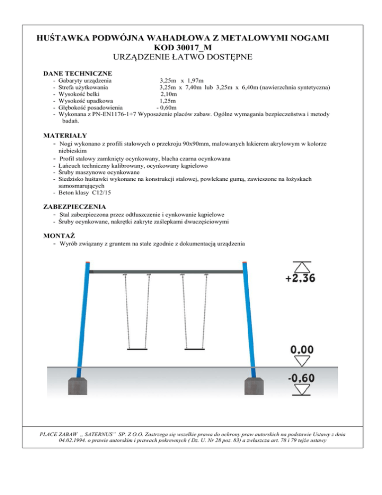 HUŚTAWKA PODWÓJNA WAHADŁOWA Z METALOWYMI NOGAMI KOD 30017_M URZĄDZENIE ŁATWO DOSTĘPNE DANE TECHNICZNE - Gabaryty urządzenia 3,25m x 1,97m Strefa użytkowania 3,25m x 7,40m lub 3,25m x 6,40m (nawierzchnia syntetyczna) Wysokość belki 2,10m Wysokość upadkowa 1,25m Głębokość posadowienia - 0,60m Wykonana z PN-EN1176-1÷7 Wyposażenie placów zabaw. Ogólne wymagania bezpieczeństwa i metody badań. MATERIAŁY - Nogi wykonano z profili stalowych o przekroju 90x90mm, malowanych lakierem akrylowym w kolorze - niebieskim Profil stalowy zamknięty ocynkowany, blacha czarna ocynkowana Łańcuch techniczny kalibrowany, ocynkowany kąpielowo Śruby maszynowe ocynkowane Siedzisko huśtawki wykonane na konstrukcji stalowej, powlekane gumą, zawieszone na łożyskach samosmarujących Beton klasy C12/15 ZABEZPIECZENIA - Stal zabezpieczona przez odtłuszczenie i cynkowanie kąpielowe - Śruby ocynkowane, nakrętki zakryte zaślepkami dwuczęściowymi MONTAŻ - Wyrób związany z gruntem na stałe zgodnie z dokumentacją urządzenia PLACE ZABAW „ SATERNUS” SP. Z O.O. Zastrzega się wszelkie prawa do ochrony praw autorskich na podstawie Ustawy z dnia 04.02.1994. o prawie autorskim i prawach pokrewnych ( Dz. U. Nr 28 poz. 83) a zwłaszcza art. 78 i 79 tejże ustawy