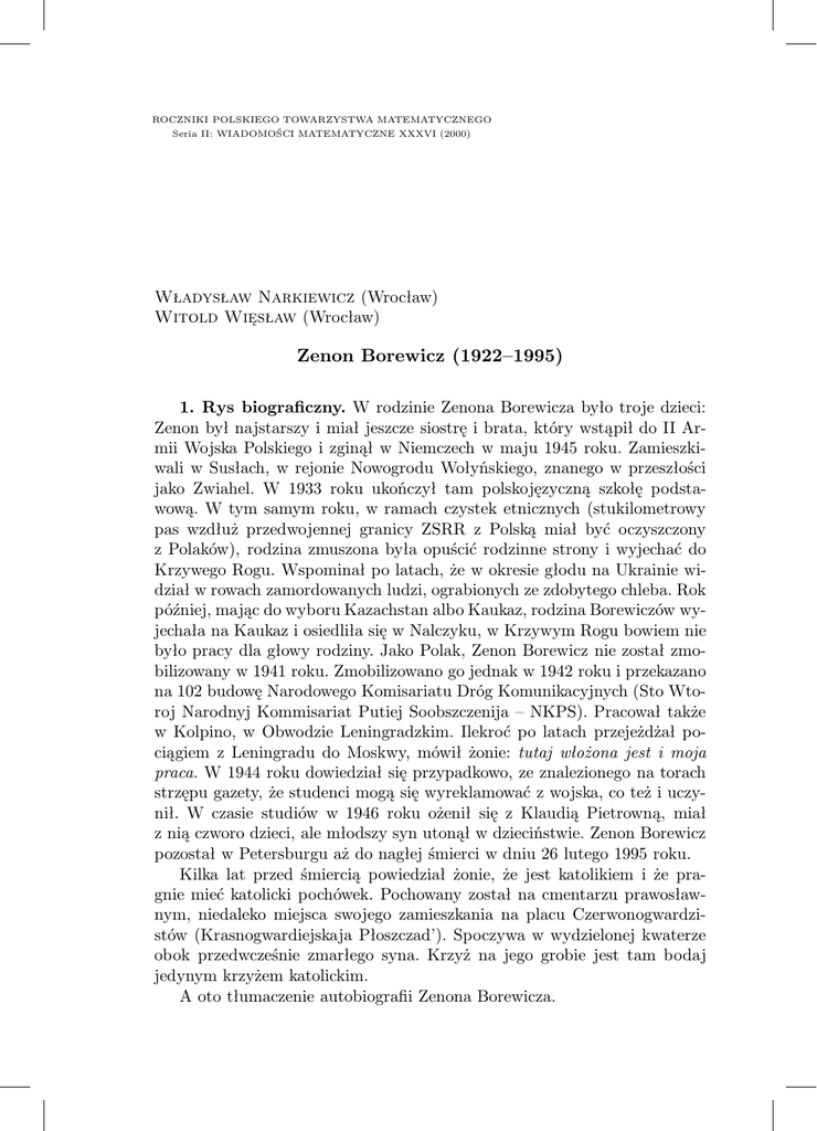 ROCZNIKI POLSKIEGO TOWARZYSTWA MATEMATYCZNEGO Seria II: WIADOMOŚCI MATEMATYCZNE XXXVI (2000) Władysław Narkiewicz (Wrocław) Witold Więsław (Wrocław) Zenon Borewicz (1922–1995) 1. Rys biograficzny. W rodzinie Zenona Borewicza było troje dzieci: Zenon był najstarszy i miał jeszcze siostrę i brata, który wstąpił do II Armii Wojska Polskiego i zginął w Niemczech w maju 1945 roku. Zamieszkiwali w Susłach, w rejonie Nowogrodu Wołyńskiego, znanego w przeszłości jako Zwiahel. W 1933 roku ukończył tam polskojęzyczną szkołę podstawową. W tym samym roku, w ramach czystek etnicznych (stukilometrowy pas wzdłuż przedwojennej granicy ZSRR z Polską miał być oczyszczony z Polaków), rodzina zmuszona była opuścić rodzinne strony i wyjechać do Krzywego Rogu. Wspominał po latach, że w okresie głodu na Ukrainie widział w rowach zamordowanych ludzi, ograbionych ze zdobytego chleba. Rok później, mając do wyboru Kazachstan albo Kaukaz, rodzina Borewiczów wyjechała na Kaukaz i osiedliła się w Nalczyku, w Krzywym Rogu bowiem nie było pracy dla głowy rodziny. Jako Polak, Zenon Borewicz nie został zmobilizowany w 1941 roku. Zmobilizowano go jednak w 1942 roku i przekazano na 102 budowę Narodowego Komisariatu Dróg Komunikacyjnych (Sto Wtoroj Narodnyj Kommisariat Putiej Soobszczenija – NKPS). Pracował także w Kolpino, w Obwodzie Leningradzkim. Ilekroć po latach przejeżdżał pociągiem z Leningradu do Moskwy, mówił żonie: tutaj włożona jest i moja praca. W 1944 roku dowiedział się przypadkowo, ze znalezionego na torach strzępu gazety, że studenci mogą się wyreklamować z wojska, co też i uczynił. W czasie studiów w 1946 roku ożenił się z Klaudią Pietrowną, miał z nią czworo dzieci, ale młodszy syn utonął w dzieciństwie. Zenon Borewicz pozostał w Petersburgu aż do nagłej śmierci w dniu 26 lutego 1995 roku. Kilka lat przed śmiercią powiedział żonie, że jest katolikiem i że pragnie mieć katolicki pochówek. Pochowany został na cmentarzu prawosławnym, niedaleko miejsca swojego zamieszkania na placu Czerwonogwardzistów (Krasnogwardiejskaja Płoszczad’). Spoczywa w wydzielonej kwaterze obok przedwcześnie zmarłego syna. Krzyż na jego grobie jest tam bodaj jedynym krzyżem katolickim. A oto tłumaczenie autobiografii Zenona Borewicza. 66 W. N a r k i e w i c z, W. W i ę s ł a w Autobiografia Ja, Zenon Borewicz, urodziłem się 7-go listropada 1922 roku w Susłach, rejon Nowogród Wołyński, obwód Żytomierz. Ojciec zajmował się gospodarstwem rolnym do 1930 roku, potem pracował jako stolarz. W 1933 roku ukończyłem polskojęzyczną szkołę podstawową w Nowogrodzie Wołyńskim. W tymże 1933 roku rodzina wyjechała do Krzywego Rogu, a w 1934 do Nalczyka. W Nalczyku moi rodzice żyją do dziś. W 1939 roku ukończyłem szkołę średnią nr 1 w Nalczyku; w tymże roku wstąpiłem na pierwszy rok Uniwersytetu Państwowego w Leningradzie. W lutym 1942 ewaukowałem się wraz z uniwersytetem do Saratowa, gdzie w czerwcu 1942 zostałem zmobilizowany i przekazany na 102 budowę NKPS. Przebywając na tej budowie, pracowałem w różnych miejscach do 15 września 1944. W 1944 powróciłem do Leningradu i od 15 września ponownie zostałem studentem III roku uniwersytetu. W 1947 roku ukończyłem uniwersytet w zakresie algebry wyższej, otrzymując dyplom z wyróżnieniem. 4 lipca 1947 Z. Borewicz 2. Działalność naukowa i organizacyjna. Zenon Borewicz był jednym z najwybitniejszych uczniów Dymitra Konstantynowicza Faddiejewa. Całą swą działalność zawodową związał z Uniwersytetem Leningradzkim, gdzie przez niemal trzydzieści lat (1963–1992) kierował Katedrą Algebry Wyższej i Teorii Liczb. W tym okresie Katedra stała się silnym ośrodkiem światowej algebry, o czym świadczą takie związane z nią nazwiska, jak D. K. Faddiejew, A. W. Jakowlew, A. I. Skopin, A. A. Suslin, N. A. Wawiłow, B. B. Wenkow, S. W. Wostokow i inni. Staż na Uniwersytecie Leningradzkim odbywali tacy znani matematycy, jak Helmut Koch z Berlina. Na Wydziale Matematyczno-Mechanicznym pełnił najpierw funkcję prodziekana, a potem dziekana (1973–1983). Nie były to lata łatwe: najpierw Wydział rozpadł się na dwa wydziały, a potem nastąpiła przeprowadzka do Peterhofu (Pietrodworiec). Dziekan Borewicz potrafił w każdej sytuacji bronić interesów Wydziału. Profesor był członkiem wielu ciał kolegialnych, komitetów, komisji itp. Pod jego redakcją ukazało się wiele tomów Naucznych Zapiskow Seminarow ŁOMI oraz inne publikacje. Opublikował ponad sto prac naukowych. Przeprowadził 30 przewodów doktorskich (na stopień kandydata nauk ), opiekował się czterema habilitacjami (stopień doktora nauk ). Słynął z pracowitości i solidności. Poświęcał wiele godzin swoim uczniom i współpracownikom, systematycznie się z nimi spotykając, w tym także u siebie w domu. Dzisiaj jego uczniowie i współpracownicy rozproszeni są po całym świecie. Zenon Borewicz był namiętnym piechurem. Miał oficjalny tytuł (mastier turizma) pieszej turystyki wysokogórskiej. Przeszedł większość masywów górskich w Związku Radzieckim, ale szczególnie upodobał sobie Kaukaz. Zenon Borewicz (1922–1995) 67 Był świetnym kompanem i duszą spotkań towarzyskich. Systematycznie spotykał się z byłymi studentami, interesując się ich życiem i pracą. Był niezwykle życzliwy ludziom. 3. Polskie kontakty. Kontakty te miały dwojaki charakter: sentymentalny, bo czuł się, był Polakiem, co stale podkreślał, oraz zawodowy – kontakty z polską nauką i polskimi matematykami. Bo niewątpliwie był matematykiem rosyjskim. Mimo, że uczęszczał do szkoły podstawowej z polskim językiem nauczania, to z biegiem lat, wskutek braku kontaktu z tym językiem i represjami za posługiwanie się nim, przestał mówić po polsku. Ale kiedy pod koniec lat sześćdziesiątych było już nieco więcej swobody w ZSRR, ponownie zaczął uc