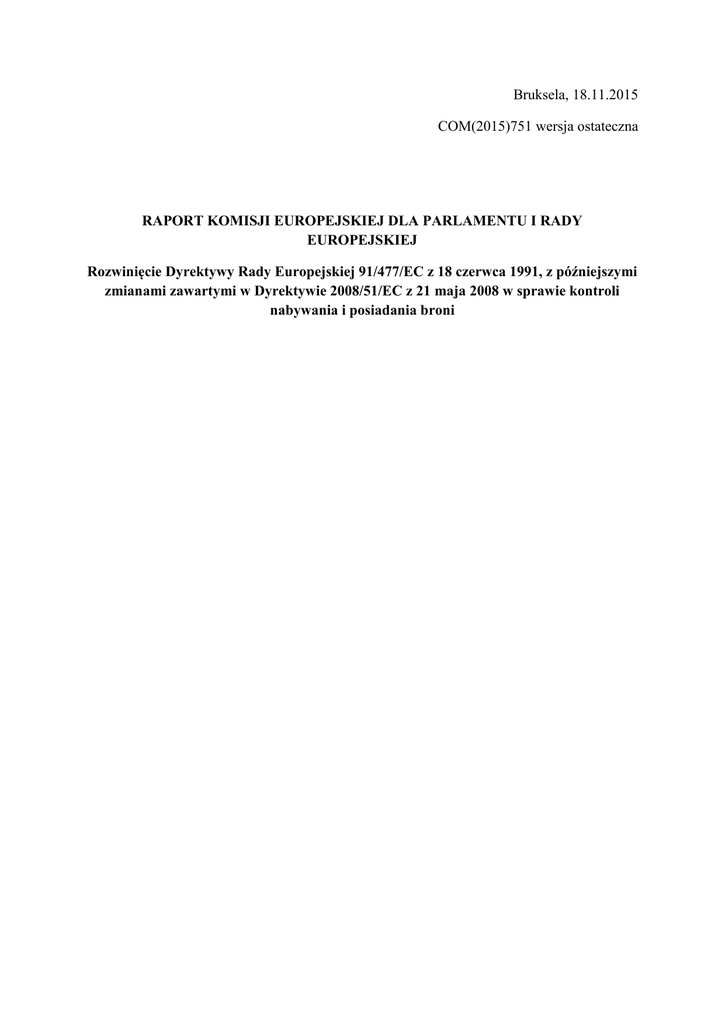 Bruksela, 18.11.2015 COM(2015)751 wersja ostateczna RAPORT KOMISJI EUROPEJSKIEJ DLA PARLAMENTU I RADY EUROPEJSKIEJ Rozwinięcie Dyrektywy Rady Europejskiej 91/477/EC z 18 czerwca 1991, z późniejszymi zmianami zawartymi w Dyrektywie 2008/51/EC z 21 maja 2008 w sprawie kontroli nabywania i posiadania broni RAPORT KOMISJI EUROPEJSKIEJ DLA PARLAMENTU I RADY EUROPEJSKIEJ Rozwinięcie Dyrektywy Rady Europejskiej 91/477/EC z 18 czerwca 1991, z późniejszymi zmianami zawartymi w Dyrektywie 2008/51/EC z 21 maja 2008 w sprawie kontroli nabywania i posiadania broni 1. Wstęp (1) Dyrektywa Rady 91/477/EEC dotycząca kontroli nabywania i posiadania broni została przyjęta 18 czerwca 19911 oraz zmieniona Dyrektywą 2008/51/EC 21 maja 20082 (Dyrektywa o broni palnej). (2) Artykuł 17 Dyrektywy o broni palnej mówi, że “Komisja powinna do 28 lipca 2015 przedstawić Parlamentowi Europejskiemu oraz Radzie Europejskiej raport dot. sytuacji wynikającej z implementacji Dyrektywy oraz, jeżeli to konieczne, propozycje rozwiązań.” Mając na uwadze przygotowanie raportu, Komisja z pomocą zewnętrznych konsultantów przeprowadziła ocenę. Ocena, którą zakończono w grudniu 20143, zawiera obszerną analizę implementacji Dyrektywy oraz analizę jej obowiązywania zgodnie z pięcioma kluczowymi kryteriami oceny. Przygotowana ocena zawiera także, sporządzone na podstawie wniosków, szczegółowe rekomendacje ulepszeń skierowane do Komisji lub władz Państw Członkowskich lub obydwu podmiotów. Ocena była powiązana z programem sprawności i wydajności regulacyjnej (REFIT), realizowanym przez Komisję Europejską. 4 (3) Po przeprowadzeniu oceny, Komisja poprosiła członków Komitetu powołanego zgodnie z art. 13(a) Dyrektywy (Komitet ds. broni palnej), reprezentujących 28 Państw Członkowskich oraz cztery kraje z Europejskiego Obszaru Gospodarczego (EOG)5 oraz Europejskiego Stowarzyszenia Wolnego Handlu6 o skomentowanie i sporządzenie oceny wniosków oraz przedstawienie własnych rekomendacji. Członkowie Komitetu przedstawili swoje odpowiedzi ustnie na spotkaniach Komitetu (18 grudnia 2014 oraz 25 marca 2015), a niektóre Państwa Członkowskie uzupełniły wypowiedzi pisemnym komentarzem (Belgia, Francja, Szwecja oraz Wielka Brytania). (4) Ostateczny raport zawierający ocenę został przekazany tuż przed tragicznymi wydarzeniami w Paryżu i Kopenhadze w styczniu 2015. Wydarzenia te zwróciły uwagę na naglące kwestie bezpieczeństwa na poziomie Unii Europejskiej. Na spotkanie Komitetu ds. broni palnej, które odbyło się w marcu 2015, Komisja zaprosiła reprezentantów Państw Członkowskich, by nie tylko skomentowali wnioski oceny, ale także przedstawili inne możliwe obawy w związku z Dyrektywą ds. broni palnej w nawiązaniu do dramatycznych wydarzeń, o których konsultanci – autorzy oceny – nie mieli jeszcze wiedzy. (5) Celem raportu jest opisanie wniosków oceny, uzupełnienie ich wnioskami płynącymi z komentarzy otrzymanych do tej pory oraz przedstawienie Komisji krytycznej oceny. W początkowej części raport nakreśla podstawy wydania aktu oraz przedstawia główne postanowienia Dyrektywy ds. broni palnej. Ukazuje metodologię, rezultaty oceny w 1 OJ L 256, 13.9.1991, p.51 OJ L 179, 8.7.2008, p. 5 3 http://bookshop.europa.eu/en/evaluation-of-the-firearms-directive-pbNB0514159/; http://bookshop.europa.eu/en/evaluation-of-the-firearms-directive-pbNB0114006/ 4 COM(2013)685 wersja ostateczna 5 Europejski Obszar Gospodarczy 6 Islandia, Liechtenstein, Norwegia, Szwajcaria 2 odniesieniu do pięciu kluczowych kryteriów oceny (tj. efektywność, wydajność, spójność, przydatność, wartość dodana dla UE) oraz rekomendacje działań. Raport przedstawia również krytyczną ocenę wniosków z przeprowadzonych przez konsultantów badań. Ponadto, wskazuje na to które inicjatywy Komisja mogłaby rozważyć, by wyeliminować kwestie podkreślone w ocenie i potwierdzone przez Państwa Członkowskie. 2. Podstawa wydania Dyrektywy (6) Dyrektywa ds. Broni palnej reguluje nabycie oraz posiadanie, a także wymianę handlową na terenie UE cywilnej broni palnej (np. broń sportowa i myśliwska). Dokument nakreśla wspólne minimalne standardy, co do których Państwa Członkowskie muszą dokonać transpozycji do prawa krajowego, regulującego kwestie broni oraz muszą je zawrzeć w polityce bezpieczeństwa (tj. wysoki poziom bezpieczeństwa i ochrona przed przestępstwami i nielegalnym handlem) na terenie UE. (7) Dyrektywa 91/477/EEC była początkowo środkiem wspomagającym tworzenie rynku wewnętrznego. Zniesienie kontroli posiadania broni w granicach wewnątrzwspólnotowych stworzyło konieczność przyjęcia efektywnych zasad uprawniających do kontroli wewnątrz Państw Członkowskich. W tym celu Dyrektywa zawiera zasady nabycia i posiadania broni palnej oraz jej transferów między Państwami Członkowskimi. Dyrektywa umożliwia Państwom Członkowskim przyjęcie bardziej restrykcyjnych zasad niż ustanowione (art. 3). (8) Komisja Europejska złożyła Parlamentowi i Radzie Europejskiej pierwszy raport w 2000 oceniający wprowadzenie Dyrektywy 91/477/EEC w Państwach Członkowskich.7 Raport ten utrzymywał, że Państwa Członkowskie oraz zainteresowane strony uznały ramy prawne określone przez Dyrektywy za wystarczające. Jednakże, określono główne problemy dotyczące implementacji Dyrektywy na gruncie prawa krajowego: problemy z wymianą informacji; różnorodność i rozbieżności w krajowej legislacji, środkach administracyjnych i procedurach zatwierdzania; różnice w klasyfikacji broni palnej myśliwskiej i sportowej oraz administracyjnych obciążeń nakładanych na sektor MŚP. Ukazało to potrzebę ujednolicenia niektórych przepisów (np. definiujących wybrane typy broni, mianowicie broni pozbawionej cech użytkowych oraz zabytkowej), by zapewnić bardziej spójne zastosowanie Dyrektywy. (9) Raport ten został złożony podczas gdy Komisja prowadziła n