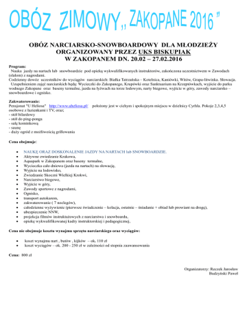 OBÓZ NARCIARSKO-SNOWBOARDOWY DLA MŁODZIEŻY ORGANIZOWANY PRZEZ UKS BISKUPIAK W ZAKOPANEM DN. 20.02 – 27.02.2016 Program: Nauka jazdy na nartach lub snowboardzie pod opieką wykwalifikowanych instruktorów, zakończona uczestnictwem w Zawodach (slalom) z nagrodami. Codzienny dowóz uczestników do wyciągów narciarskich: Białka Tatrzańska – Kotelnica, Kaniówki, Witów, Grapa-litwinka. Słowacja. Uzupełnieniem zajęć narciarskich będą: Wycieczki do Zakopanego, Krupówki oraz Sanktuarium na Krzeptówkach, wyjście do parku wodnego Zakopane oraz baseny termalne, jazda na łyżwach na torze lodowym, narty biegowe, wyjście w góry, zawody narciarsko – snowboardowe i ognisko. Zakwaterowanie: Pensjonat "U Heliosa" http://www.uheliosa.pl/ położony jest w cichym i spokojnym miejscu w dzielnicy Cyrhla. Pokoje 2,3,4,5 osobowe z łazienkami i TV, oraz; - stół bilardowy - stół do ping-ponga - salę kominkową - saunę - duży ogród z możliwością grillowania Cena obejmuje: NAUKĘ ORAZ DOSKONALENIE JAZDY NA NARTACH lub SNOWBOARDZIE. Aktywne zwiedzanie Krakowa, Aquapark w Zakopanem oraz baseny termalne, Wycieczka cało dniowa (jazda na nartach) na słowację, Wyjście na lodowisko, Zwiedzanie Skoczni Wielkiej Krokwi, Narciarstwo biegowe, Wyjście w góry, Zawody sportowe z nagrodami, Ognisko, transport autokarem, zakwaterowanie ( 7 noclegów), całodzienne wyżywienie (pierwsze świadczenie – kolacja, ostatnie – śniadanie + obiad lub prowiant na drogę), ubezpieczenie NNW, projekcja filmów instruktażowych z narciarstwa i snowboardu, opiekę wykwalifikowanej kadry instruktorskiej i pedagogicznej, Cena nie obejmuje kosztu wynajmu sprzętu narciarskiego oraz wyciągów: koszt wynajmu nart , butów , kijków – ok. 110 zł koszt wyciągów – ok. 200 - 250 zł w zależności od stopnia zaawansowania Cena: 800 zł Organizatorzy: Reczek Jarosław Budzyński Paweł
