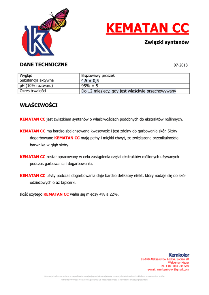 KEMATAN CC Związki syntanów DANE TECHNICZNE Wygląd Substancja aktywna pH (10% roztworu) Okres trwałości 07-2013 Brązowawy proszek 4,5 ± 0,5 95% ± 5 Do 12 miesięcy, gdy jest właściwie przechowywany WŁAŚCIWOŚCI KEMATAN CC jest związkiem syntanów o właściwościach podobnych do ekstraktów roślinnych. KEMATAN CC ma bardzo zbalansowaną kwasowość i jest zdolny do garbowania skór. Skóry dogarbowane KEMATAN CC mają pełny i miękki chwyt, ze zwiększoną przenikalnością barwnika w głąb skóry. KEMATAN CC został opracowany w celu zastąpienia części ekstraktów roślinnych używanych podczas garbowania i dogarbowania. KEMATAN CC użyty podczas dogarbowania daje bardzo delikatny efekt, który nadaje się do skór odzieżowych oraz tapicerki. Ilość użytego KEMATAN CC waha się między 4% a 22%. Kemkolor 95-070 Aleksandrów Łódzki, Sobień 2K Waldemar Mazur Tel. +48 - 883 045 550 e-mail: [email protected] Informacje i zalecenia podane są na podstawie naszej najlepszej aktualnej wiedzy, popartej doświadczeniem i dokładnym prowadzeniem testów. Jednak te informacje nie stanowią gwarancji lub odpowiedzialności za korzystanie z naszych produktów.