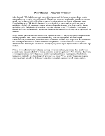 Piotr Rączka – Program wyborczy Jako skarbnik PTF chciałbym przede wszystkim doprowadzić do końca te zmiany, które zostały zapoczątkowane za mojej obecnej kadencji. Chodzi tu w pierwszej kolejności o utrwalenie systemu tanich kont bankowych dla oddziałów terenowych, udostępnianych w formie subkont do konta Zarządu Głównego PTF. O takie konta od lat upominali się przedstawiciele mniej zasobnych oddziałów, dla których koszty utrzymania własnego konta bankowego były zbyt wysokie. Konto posiadające taką funkcjonalność zostało w tym roku założone przez PTF w Banku Handlowym i obecnie kończone są formalności wymagane do zapewnienia oddziałom dostępu do przypisanych im subkont. Drugą zmianą, jaka zaszła w ostatnim czasie, było stworzenie – z inicjatywy i przy walnym udziale obecnego prezesa PTF - nowej strony internetowej, umożliwiającej m.in. wnoszenie opłat członkowskich przez internet, bez konieczności odwiedzin w banku bądź na poczcie. W założeniach taki moduł powinien bardzo ułatwić nadzorowanie płatności składek członkowskich i szybkie aktualizowanie informacji o członkach. Chciałbym przyczynić się do dopracowania i utrwalenia tego modułu. Pełniąc obowiązki skarbnika w obecnej kadencji stwierdziłem także, że istnieją duże możliwości pozyskiwania funduszy dla PTF w formie darowizn, np.od tzw. patronów. PTF otrzymuje darowizny od szeregu instytucji, ale wydaje się, że możliwości są tu dalekie od wyczerpania. Dzięki takim funduszom można by zwiększyć nagrody przyznawane przez PTF do kwot wykraczających poza symbole, a także umożliwić dofinansowanie ciekawych akcji organizowanych przez oddziały.