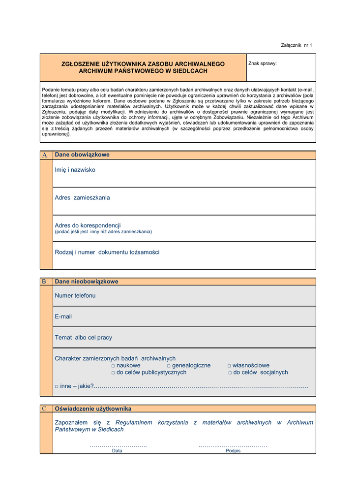 Załącznik nr 1 ZGŁOSZENIE UŻYTKOWNIKA ZASOBU ARCHIWALNEGO ARCHIWUM PAŃSTWOWEGO W SIEDLCACH Znak sprawy: Podanie tematu pracy albo celu badań charakteru zamierzonych badań archiwalnych oraz danych ułatwiających kontakt (e-mail, telefon) jest dobrowolne, a ich ewentualne pominięcie nie powoduje ograniczenia uprawnień do korzystania z archiwaliów (pola formularza wyróżnione kolorem. Dane osobowe podane w Zgłoszeniu są przetwarzane tylko w zakresie potrzeb bieżącego zarządzania udostępnianiem materiałów archiwalnych. Użytkownik może w każdej chwili zaktualizować dane wpisane w Zgłoszeniu, podając datę modyfikacji. W odniesieniu do archiwaliów o dostępności prawnie ograniczonej wymagane jest złożenie zobowiązania użytkownika do ochrony informacji, ujęte w odrębnym Zobowiązaniu. Niezależnie od tego Archiwum może zażądać od użytkownika złożenia dodatkowych wyjaśnień, oświadczeń lub udokumentowania uprawnień do zapoznania się z treścią żądanych przezeń materiałów archiwalnych (w szczególności poprzez przedłożenie pełnomocnictwa osoby uprawnionej). A Dane obowiązkowe Imię i nazwisko Adres zamieszkania Adres do korespondencji (podać jeśli jest inny niż adres zamieszkania) Rodzaj i numer dokumentu tożsamości B Dane nieobowiązkowe Numer telefonu E-mail Temat albo cel pracy Charakter zamierzonych badań archiwalnych □ naukowe □ genealogiczne □ do celów publicystycznych □ własnościowe □ do celów socjalnych □ inne – jakie?……………………………………………………………………………………………… C Oświadczenie użytkownika Zapoznałem się z Regulaminem korzystania z materiałów archiwalnych w Archiwum Państwowym w Siedlcach ……………………….. Data ……….……………………. Podpis Załącznik nr 2 ZOBOWIĄZANIE UŻYTKOWNIKA DO OCHRONY INFORMACJI (na podstawie Zarządzenia nr 4 Naczelnego Dyrektora Archiwów Państwowych z dnia 1 lutego 2013 r. w sprawie organizacji udostępniania materiałów archiwalnych w archiwach państwowych) Zobowiązanie należy wypełnić w odniesieniu do archiwaliów o dostępności prawnie ograniczonej. ZOBOWIĄZANIE Zobowiązuję się do wykorzystania informacji uzyskanych na podstawie udostępnionych materiałów archiwalnych, a mających znamiona aktualności, w sposób nienaruszający wolności albo praw, wynikających w szczególności z przepisów chroniących dobra osobiste lub dane osobowe. ……………………….. Data ………………………………………………… Podpis