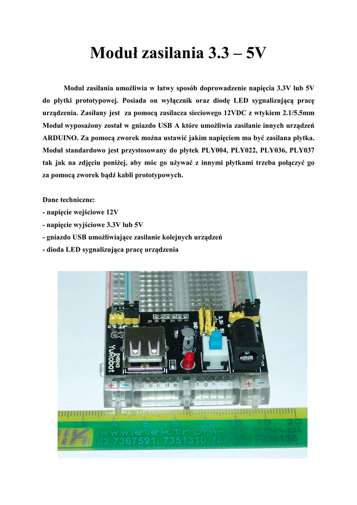 Moduł zasilania 3.3 – 5V Moduł zasilania umoŜliwia w łatwy sposób doprowadzenie napięcia 3.3V lub 5V do płytki prototypowej. Posiada on wyłącznik oraz diodę LED sygnalizującą pracę urządzenia. Zasilany jest za pomocą zasilacza sieciowego 12VDC z wtykiem 2.1/5.5mm Moduł wyposaŜony został w gniazdo USB A które umoŜliwia zasilanie innych urządzeń ARDUINO. Za pomocą zworek moŜna ustawić jakim napięciem ma być zasilana płytka. Moduł standardowo jest przystosowany do płytek PLY004, PLY022, PLY036, PLY037 tak jak na zdjęciu poniŜej, aby móc go uŜywać z innymi płytkami trzeba połączyć go za pomocą zworek bądź kabli prototypowych. Dane techniczne: - napięcie wejściowe 12V - napięcie wyjściowe 3.3V lub 5V - gniazdo USB umoŜliwiające zasilanie kolejnych urządzeń - dioda LED sygnalizująca pracę urządzenia