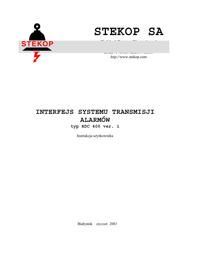 STEKOP SA Zakład Pracy Chronionej 15-404 Białystok, ul. Młynowa 21 tel./fax : (+48 85) 7420039, 7423567 http://www.stekop.com INTERFEJS SYSTEMU TRANSMISJI ALARMÓW typ RDC 400 ver. 1 Instrukcja użytkownika Białystok styczeń 2001 Spis treści : • • • • • • • • • • • • • • • • • • • • • • • Charakterystyka Interfejsu RCA-L ...............................................................................2 Zasada działania............................................................................................................3 Układ elektryczny zacisków .........................................................................................3 Załączenie/wyłącznie systemu......................................................................................4 Kasowanie alarmu ........................................................................................................4 Wejścia alarmowe .........................................................................................................4 Interpretacja stanu napięć linii .....................................................................................4 Układ parametryzujący ................................................................................................5 Linia .............................................................................................................................5 Linia natychmiastowa ..................................................................................................5 Wyjścia ........................................................................................................................5 Obwód antysabotażowy sygnalizatora..........................................................................6 Zasilanie czujników ......................................................................................................6 Zasilanie czujników OUT3 ...........................................................................................6 Sygnalizacja stanu interfejsu.........................................................................................6 Programowanie parametrów nadajnika.........................................................................7 Ustawianie identyfikatora systemowego ......................................................................7 Kontrola łączności z obiektem......................................................................................8 Ustawianie czasu raportowania.....................................................................................9 Regulacja mocy ............................................................................................................9 Montaż urządzenia ......................................................................................................10 Wersja bezprzewodowa ..............................................................................................11 Dane techniczne ..........................................................................................................12 Charakterystyka pracy interfejsu RCA-L5 Radiowy interfejs nadawczy RCA-L5 i RCA-L5/B jest elementem Systemu Transmisji Alarmów X-2000. Przeznaczony jest do pracy w sieciach monitorowania alarmów : włamania, napadu, pożaru i zagrożeń ekologicznych. Radiomodem jest nadajnikiem pracującym w trybie Simplex i jest zbudowany w oparciu o najnowsze układy scalone produkowane w technice VLSI oraz SMD. Zastosowanie wspomnianych komponentów pozwoliło na znaczne obniżenie poboru prądu z sieci zasilającej, co ma duże znaczenie w technice alarmowej, szczególnie przy zaniku napięcia sieci ~ 220V (długi czas pracy z baterii). Układ elektryczny bazuje na syntezie częstotliwości, którą steruje procesor z wewnętrzną pamięcią w której zapisane są informacje o : częstotliwość pracy nadajnika, kanale w którym pracuje, jak również jego indywidualny identyfikator, itp. Jako tor transmisji wykorzystywane są łącza radiowe w paśmie częstotliwości 430 – 460 MHz. Urządzenie w zależności od ustawień parametrów pracy spełnia wymagania zawarte w Polskiej Normie PN-EN 50131-1, PN-93 E-08390/54 dla obiektów klasy SA1 - SA4. Specyfikację parametrów systemowych zawiera tabela 1. Interfejs RDC posiada układ wejść/wyjść elektrycznych w poniższej konfiguracji • wejście stanu systemu (system wyłączony / załączony) • 5 wejść alarmów strefowych • wejście odwołania alarmu • wejście potwierdzenia alarmu • 3 wyjścia (sygnalizatory lub inne urządzenia) Stany wejść, odzwierciedlające stan monitorowanego obiektu, są przesyłane z interfejsu drogą radiową do odbiornika sprzężonego z Stacją Monitorowania Alarmów. Sprawność obiektu jest kontrolowaną poprzez ciągłe śledzenie obecności sygnałów kontrolnych emitowanych w określonych (definiowalnych) okresach czasu przez Stację Monitorowania. Brak impulsów kontrolnych powoduje wyzwolenie alarmu technicznego. Stany wejść, odzwierciedlające stan monitorowanego obiektu, są przesyłane z interfejsu drogą radiową do odbiornika sprzężonego z Stacją Monitorowania Alarmów. Sprawność obiektu jest kontrolowaną poprzez ciągłe śledzenie obecności sygnałów kontrolnych emitowanych w określonych (definiowalnych) okresach czasu przez Stację Monitorowania. Brak impulsów kontrolnych powoduje wyzwolenie alarmu technicznego. Parametry systemu Czas transmisji /D/ Raportowanie łącza /T/ Dostępność /A/ Zabez. transmisji /S/ Bezp. informacji /I/ D4 T5 do T3 A3 do A4 S1 I0 - I1 10 sek. 90 sek. - 300 min. 97% - 99,8% Zasada działania Urządzenie działa na bazie programu zapisanego w pamięci mikroprocesora jednoukładowego, i łączy cechy prostej centrali alarmowej z nadajnikiem radiowym systemu monitorowania alarmów. Określenie parametrów pracy centrali alarmowej odbywa się na poziomie producenta. Rys 1. Układ elektry
