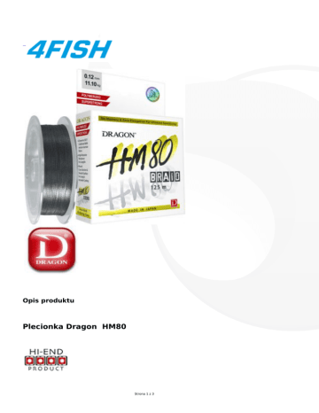 Opis produktu Plecionka Dragon HM80 Strona 1 z 3 Nazwa HM jest w firmie Dragon zarezerwowana dla produktów, które można określić mianem wędkarskiego Hi-End. Plecionki HM69 i HM80, wyprodukowane na nasze zamówienie przez japoński koncern chemiczny Toray International Inc., są na pewno jednym z najlepszych produktów w tej kategorii. Toray posiada własną, opatentowaną metodę uszlachetniania włókna typu Dyneema poprzez dodatkowe procesy polimeryzacji i wzbogacania włókien polietylenowych (typ Dyneema 60, 66 i 75) cząstkami Amilanu. Amilan to marka włókna aramidowego, mocniejszego o ponad 15% od Kevlaru, zarejestrowana przez Toray. Dzięki zastosowaniu tych i wielu innych technologii plecionki Toray nie mają sobie równych jeżeli chodzi o wytrzymałość i absolutny brak rozciągliwości. Nowe włókno uzyskane przez Toray, wytworzone na bazie Dyneemy SK75, jest prawdopodobnie najmocniejszym i najmniej rozciągliwym tworzywem tego rodzaju na świecie. Klasyczne włókno Dyneema rozciąga się przy zerwaniu o 3,5%, dla porównania włókno szklane o 5,5% a kopolimer nylonowy (stosowany do żyłek wędkarskich) od 10 do 25 %. Nowe plecionki firmy Toray rozciągają się maksymalnie o 2%. Oznacza to, że na trzydziestometrowym odcinku żyłka rozciągnie się podczas silnego zacięcia o co najmniej 3 do 5m, standardowa plecionka o ponad 1 metr a plecionka Toray maksymalnie o 60cm. Jak ważną cechą dla wędkarza jest tak niska rozciągliwość linki, nie musimy nikogo przekonywać. Szczególnie spinningiści, łowiący z opadu na dużych głębokościach powinni natychmiast docenić wszelkie walory tego produktu. HM80 indeks średnica [mm] wytrzym. [kg] dł. [m] 40-00-006 0.06 5.10 125 40-00-008 0.08 6.25 125 40-00-010 0.10 8.40 125 40-00-012 0.12 11.10 125 40-00-015 0.15 14.90 125 40-00-018 0.18 18.20 125 40-00-021 0.20 22.50 125 Nowa plecionka HM80 wyprodukowana z najnowszej generacji włókna Dyneema SK75 charakteryzuje się wyjątkowo ciasnym splotem, dużą sztywnością i niemal zerową rozciągliwością, co czyni ją idealną linką spinningową do wykorzystania w każdych warunkach. Dzięki dodatkowym zabezpieczeniom powierzchni w procesie polimeryzacji włókien (dodatek Amilanu) plecionka jest bardzo odporna na uszkodzenia mechaniczne i ścieranie. Nawet po długim okresie użytkowania nie zmienia swoich właściwości fizyko–chemicznych, a zewnętrzna powłoka nie ulega degradacji. Jest to w tej chwili prawdopodobnie najmocniejsze włókno tego typu na świecie. Okrągły przekrój, a także gładkość powierzchni korzystnie wpływają na długość rzutów i redukują prawdopodobieństwo splątania. Plecionka oferowana jest w kolorze szarym, na szpulach po 125 metrów. Strona 2 z 3 SYMBOL KATALOGOWY: 40-00-018 ŚREDNICA: 0,18mm WYTRZYMAŁOŚĆ: 18,20kg DŁUGOŚĆ: 125m KOLOR: szary Strona 3 z 3