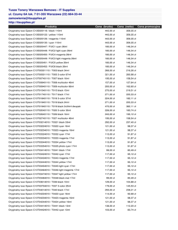 Tusze Tonery Warszawa Bemowo - IT Supplies ul. Czumy 6A lok. 7 01-355 Warszawa (22) 664-33-44 [email protected] http://itsupplies.pl/ Produkty Cena (brutto) Cena (netto) Oryginalny tusz Epson C13S020118 / black 110ml 442,00 zł 359,35 zł Oryginalny tusz Epson C13S020122 / yellow 110ml 442,00 zł 359,35 zł Oryginalny tusz Epson C13S020126 / magenta 110ml 442,00 zł 359,35 zł Oryginalny tusz Epson C13S020130 / cyan 110ml 442,00 zł 359,35 zł Oryginalny tusz Epson C13S020447 / PJIC1 cyan 26ml 180,00 zł 146,34 zł Oryginalny tusz Epson C13S020448 / PJIC2 light cyan 26ml 180,00 zł 146,34 zł Oryginalny tusz Epson C13S020450 / PJIC4 magenta 26ml 180,00 zł 146,34 zł Oryginalny tusz Epson C13S020449 / PJIC3 light magenta 26ml 180,00 zł 146,34 zł Oryginalny tusz Epson C13S020451 / PJIC5 yellow 26ml 180,00 zł 146,34 zł Oryginalny tusz Epson C13S020452 / PJIC6 black 26ml 180,00 zł 146,34 zł Oryginalny tusz Epson C13T00301110 / T003 black 34ml 266,00 zł 216,26 zł Oryginalny tusz Epson C13T00501110 / T005 3-color 67ml 321,00 zł 260,98 zł Oryginalny tusz Epson C13T00740110 / T007 black 16ml 195,00 zł 158,54 zł Oryginalny tusz Epson C13T00840110 / T008 multicolor 46ml 157,00 zł 127,64 zł Oryginalny tusz Epson C13T00940110 / T009 multicolor 66ml 200,00 zł 162,60 zł Oryginalny tusz Epson C13T01540110 / T015 black 15ml 270,00 zł 219,51 zł Oryginalny tusz Epson C13T01740110 / T017 black 17ml 271,00 zł 220,33 zł Oryginalny tusz Epson C13T01840110 / T018 3-color 37ml 224,00 zł 182,11 zł Oryginalny tusz Epson C13T01940110 / T019 black 24ml 271,00 zł 220,33 zł Oryginalny tusz Epson C13T01940110 / T019 black 2x24ml dwupak 470,00 zł 382,11 zł Oryginalny tusz Epson C13T02040110 / T020 3-color 35ml 226,00 zł 183,74 zł Oryginalny tusz Epson C13T02640110 / T026 black 16ml 240,00 zł 195,12 zł Oryginalny tusz Epson C13T02740110 / T027 multicolor 46ml 195,00 zł 158,54 zł Oryginalny tusz Epson C13T03214010 / T0321 black 33ml 292,00 zł 237,40 zł Oryginalny tusz Epson C13T03224010 / T0322 cyan 16ml 121,00 zł 98,37 zł Oryginalny tusz Epson C13T03234010 / T0323 magenta 16ml 121,00 zł 98,37 zł Oryginalny tusz Epson C13T03324010 / T0332 cyan 17ml 113,00 zł 91,87 zł Oryginalny tusz Epson C13T03334010 / T0333 magenta 17ml 113,00 zł 91,87 zł Oryginalny tusz Epson C13T03344010 / T0334 yellow 17ml 113,00 zł 91,87 zł Oryginalny tusz Epson C13T03354010 / T0335 photo cyan 17ml 113,00 zł 91,87 zł Oryginalny tusz Epson C13T03414010 / T0341 black 17ml 99,00 zł 80,49 zł Oryginalny tusz Epson C13T03424010 / T0342 cyan 17ml 117,00 zł 95,12 zł Oryginalny tusz Epson C13T03434010 / T0343 magenta 17ml 117,00 zł 95,12 zł Oryginalny tusz Epson C13T03444010 / T0344 yellow 17ml 117,00 zł 95,12 zł Oryginalny tusz Epson C13T03454010 / T0345 light cyan 17ml 117,00 zł 95,12 zł Oryginalny tusz Epson C13T03464010 / T0346 light magenta 17ml 117,00 zł 95,12 zł Oryginalny tusz Epson C13T03474010 / T0347 light yellow 17ml 117,00 zł 95,12 zł 99,00 zł 80,49 zł Oryginalny tusz Epson C13T03614010 / T036 black 10ml 129,00 zł 104,88 zł Oryginalny tusz Epson C13T03704010 / T037 3-color 25ml 179,00 zł 145,53 zł Oryginalny tusz Epson C13T04014010 / T040 black 17ml 293,00 zł 238,21 zł Oryginalny tusz Epson C13T04224010 / T0422 cyan 16ml 114,00 zł 92,68 zł Oryginalny tusz Epson C13T04234010 / T0423 magenta 16ml 121,00 zł 98,37 zł Oryginalny tusz Epson C13T04244010 / T0424 yellow 16ml 121,00 zł 98,37 zł Oryginalny tusz Epson C13T04414010 / T0441 black 13ml 138,00 zł 112,20 zł Oryginalny tusz Epson C13T04424010 / T0442 cyan 13ml 103,00 zł 83,74 zł Oryginalny tusz Epson C13T03484010 / T0348 black mat 17ml Cena promocyjna Oryginalny tusz Epson C13T04434010 / T0443 magenta 13ml 103,00 zł 83,74 zł Oryginalny tusz Epson C13T04444010 / T0444 yellow 13ml 103,00 zł 83,74 zł Oryginalny tusz Epson C13T04454010 / T0445 CMYK 4x13ml multipak 316,00 zł 256,91 zł Oryginalny tusz Epson C13T04524010 / T0452 cyan 8ml 80,00 zł 65,04 zł Oryginalny tusz Epson C13T04534010 / T0453 magenta 8ml 80,00 zł 65,04 zł Oryginalny tusz Epson C13T04544010 / T0454 yellow 8ml 80,00 zł 65,04 zł Oryginalny tusz Epson C13T04814010 / T0481 black 13ml 112,00 zł 91,06 zł Oryginalny tusz Epson C13T04824010 / T0482 cyan 13ml 112,00 zł 91,06 zł Oryginalny tusz Epson C13T04834010 / T0483 magenta 13ml 112,00 zł 91,06 zł Oryginalny tusz Epson C13T04844010 / T0484 yellow 13ml 112,00 zł 91,06 zł Oryginalny tusz Epson C13T04854010 / T0485 light cyan 13ml 112,00 zł 91,06 zł Oryginalny tusz Epson C13T04864010 / T0486 light magenta 13ml 112,00 zł 91,06 zł Oryginalny tusz Epson C13T04874010 / T0487 multicolor (black/ cyan/ magenta/ yellow/light cyan/ magenta) 474,00 zł 385,37 zł Oryginalny tusz Epson C13T048C4010 / T048C black/ cyan/ magenta 13ml 301,00 zł 244,72 zł Oryginalny tusz Epson C13T05014010 / T0501 black 15ml 200,00 zł 162,60 zł Oryginalny tusz Epson C13T05114010 / T0511 black 24ml 227,00 zł 184,55 zł Oryginalny tusz Epson C13T05114210 / T0511 black 2x24ml dwupak 393,00 zł 319,51 zł Oryginalny tusz Epson C13T05204010 / T0520 3-color 35ml 226,00 zł 183,74 zł Oryginalny tusz Epson C13T05304010 / T0530 multicolor (C/M/Y/light cyan/light magenta) 43ml 152,00 zł 123,58 zł Oryginalny tusz nabłyszczający Epson C13T05404010 / T0540 13ml 55,00 zł 44,72 zł Oryginalny tusz Epson C13T05414010 / T0541 black 13ml 92,00 zł 74,80 zł Oryginalny tusz Epson C13T05424010 / T0542 cyan 13ml 91,00 zł 73,98 zł Oryginalny tusz Epson C13T05434010 / T0543 magenta 13ml 92,00 zł 74,80 zł Oryginalny tusz Epson C13T05444010 / T0544 yellow 13ml 92,00 zł 74,80 zł Oryginalny tusz Epson C13T05474010 / T0547 red 13ml 92,00 zł 74,80 zł Oryginalny tusz Epson C13T05484010 / T0548 black mat 13ml 92,00 zł 74,80 zł Oryginalny tusz Epson C13T05494010 / T0549 blue 13ml 92,00 zł 74,80 zł Oryginalny tusz Epson C13T05514010 / T0551 black 8ml 59,00 zł 47,97 zł Oryginalny tusz Epson C13T05524010 / T0552 cyan 8ml 59,00 z