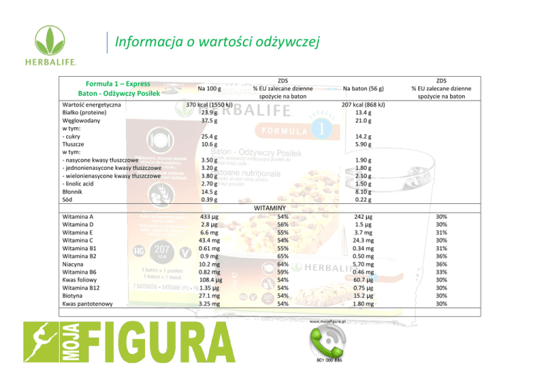Informacja o wartości odżywczej Formuła 1 – Express Baton - Odżywczy Posiłek Wartość energetyczna Białko (proteine) Węglowodany w tym: - cukry Tłuszcze w tym: - nasycone kwasy tłuszczowe - jednonienasycone kwasy tłuszczowe - wielonienasycone kwasy tłuszczowe - linolic acid Błonnik Sód Na 100 g ZDS % EU zalecane dzienne spożycie na baton Na baton (56 g) 370 kcal (1550 kJ) 23.9 g 37.5 g 207 kcal (868 kJ) 13.4 g 21.0 g 25.4 g 10.6 g 14.2 g 5.90 g 3.50 g 3.20 g 3.80 g 2.70 g 14.5 g 0.39 g 1.90 g 1.80 g 2.10 g 1.50 g 8.10 g 0.22 g ZDS % EU zalecane dzienne spożycie na baton WITAMINY Witamina A Witamina D Witamina E Witamina C Witamina B1 Witamina B2 Niacyna Witamina B6 Kwas foliowy Witamina B12 Biotyna Kwas pantotenowy 433 µg 2.8 µg 6.6 mg 43.4 mg 0.61 mg 0.9 mg 10.2 mg 0.82 mg 108.4 µg 1.35 µg 27.1 mg 3.25 mg 54% 56% 55% 54% 55% 65% 64% 59% 54% 54% 54% 54% 242 µg 1.5 µg 3.7 mg 24.3 mg 0.34 mg 0.50 mg 5.70 mg 0.46 mg 60.7 µg 0.75 µg 15.2 µg 1.80 mg 30% 30% 31% 30% 31% 36% 36% 33% 30% 30% 30% 30% Informacja o wartości odżywczej SKŁADNIKI MINERALNE Wapń Żelazo Fosfor Magnez Cynk Jod Potas Miedź Selen Mangan 428 mg 11.1 mg 604 mg 98.0 mg 6.21 mg 82.5 µg 928 mg 0.83 mg 29.9 µg 1.08 mg 54% 79% 86% 26% 62% 55% 46% 83% 54% 54% 239 mg 6.20 mg 338 mg 54.9 mg 3.48 mg 46.2 mg 519 mg 0.46 mg 16.7 µg 0.61 mg 30% 44% 48% 15% 35% 31% 26% 46% 30% 30% SKŁADNIKI granulat sojowy, syrop fruktozowo-glukozowy, chrupki sojowe (białko sojowe, skrobia z tapioki, sól), czekolada mleczna 8.9% (cukier, masło kakaowe, pełnotłuste mleko w proszku, masa kakaowa, emulgator: lecytyna sojowa; aromaty), syrop glukozowy, polydekstroza, białko sojowe, oligofruktoza, ekstradowane czekoladowe płatki kukurydziane, (mąka kukurydziana, mąka pszenna, kakao niskotłuszczowe, cukier, słód pszenny, sól, aromaty), fruktoza, składniki mineralne (kwas fosforowy, fosforan trójwapniowy, tlenek magnezu, kadm żelaza III dwufosforanu, tlenek cynku, siarczan magnezu, siarczan miedzi, tlenek potasu, selenin sodu), czekoladowy granulat 1.8% (cukier, masa kakaowa, masło kakaowe, emulgator: lecytyna sojowa, wanilia), błonnik pochodzenia roślinnego: guma akacjowa; olej słonecznikowy, aromaty, sól, kwas cytrynowy; emulgator: lecytyna sojowa; witaminy (kwas askorbinowy, nikotynamid, octan DL-alfa-tokoferylu, pantotenian wapnia, ryboflawina, chlorowodorek pirydoksyny, chlorowodorek tiaminy, octan retinolu, kwas pteroilomonoglutaminowy, D-biotyna, cholekalcyferol, cyjanokobalamina). Zawiera mleko, soję i gluten. Może zawierać śladowe ilości, syrop orzechów ziemnych i nasion sezamu.