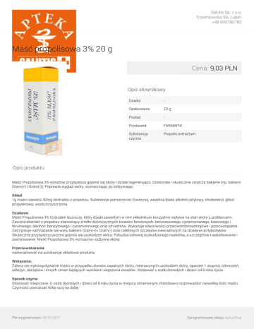 Salutis Sp. z o.o. Trześniowska 59i, Lublin +48 605780782 Maść propolisowa 3% 20 g Cena: 9,03 PLN Opis słownikowy Dawka - Opakowanie 20 g Postać - Producent FARMAPIA Substancja czynna Propolis extractum Opis produktu Maść Propolisowa 3% wyraźnie przyśpiesza gojenie się skóry i działa regenerująco. Doskonale i skutecznie zwalcza bakterie (np. bakterii Gram(+) i Gram(-)). Poprawia wygląd skóry, wzmacniając ją i odżywiając. Skład: 1g maści zawiera 30mg ekstraktu z propolisu. Substancje pomocnicze: Euceryna, wazelina biała, alkohol cetylowy, cholesterol, glikol propylenowy, woda oczyszczona. Działanie: Maść Propolisowa 3% to środek leczniczy, który dzięki zawartym w nim składnikom korzystnie wpływa na stan skóry z problemami. Zawiera ekstrakt z propolisu stanowiący źródło dobroczynnych kwasów fenolowych: benzoesowego, cynamonowego, kawowego i ferulowego; alkoholi: benzylowego i cynamonowego oraz ich estrów. Wykazuje właściwości przeciwdrobnoustrojowe i przeciwzapalne. Zatrzymuje namnażanie się wielu bakterii Gram(+) i Gram(-) oraz niektórych szczepów niewrażliwych na działanie antybiotyków. Skutecznie przyśpiesza proces gojenia się uszkodzeń skóry. Pobudza odnowę uszkodzonego naskórka, a szczególnie naskórkowanie i ziarninowanie. Maść Propolisowa 3% wzmacnia i odżywia skórę. Przeciwwskazania: nadwrażliwość na substancje składowe produktu Wskazania: Zaleca się wykorzystywanie maści w przypadku stanów zapalnych skóry, nieznacznych uszkodzeń skóry, oparzeń 1 stopnia, odmrożeń, odleżyn, obrzęków i innych zmian będących wynikiem ukąszenia owadów. Stosować u osób dorosłych i dzieci od 6 roku życia. Sposób użycia: Stosować miejscowo. U osób dorosłych i dzieci od 6 roku życia w miejscu zmienionym chorobowo rozprowadzić niewielką ilość maści. Czynność powtarzać kilka razy na dobę. Plik wygenerowano: 08-03-2017 Oprogramowanie sklepu: AptusShop Salutis Sp. z o.o. Trześniowska 59i, Lublin +48 605780782 Przed użyciem zapoznaj się z ulotką dołączoną do opakowania, która zawiera wskazania, przeciwwskazania, dane dotyczące działań niepożądanych i dawkowanie oraz informacje dotyczące stosowania i przechowywania produktu leczniczego, bądź skonsultuj się z lekarzem lub farmaceutą, gdyż każdy lek niewłaściwie stosowany zagraża Twojemu życiu lub zdrowiu. Plik wygenerowano: 08-03-2017 Powered by TCPDF (www.tcpdf.org) Oprogramowanie sklepu: AptusShop