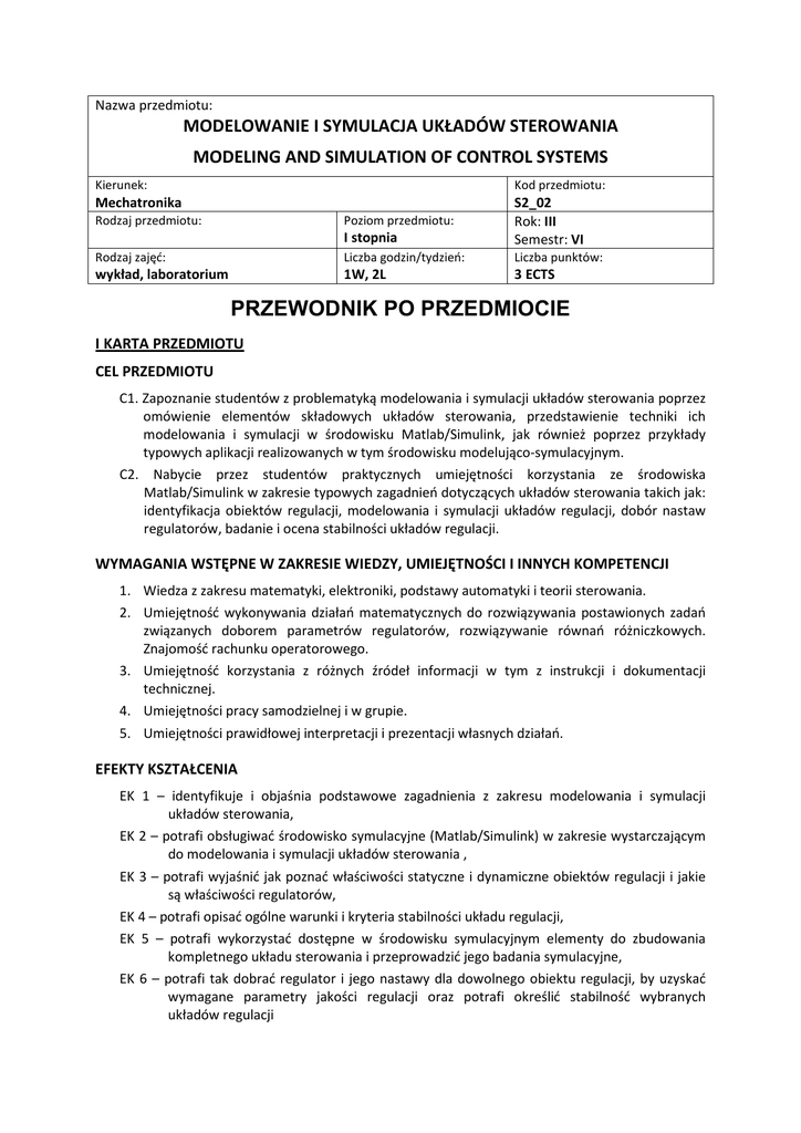 Nazwa przedmiotu: MODELOWANIE I SYMULACJA UKŁADÓW STEROWANIA MODELING AND SIMULATION OF CONTROL SYSTEMS Kierunek: Kod przedmiotu: Mechatronika I stopnia S2_02 Rok: III Semestr: VI Rodzaj zajęć: Liczba godzin/tydzień: Liczba punktów: wykład, laboratorium 1W, 2L 3 ECTS Rodzaj przedmiotu: Poziom przedmiotu: PRZEWODNIK PO PRZEDMIOCIE I KARTA PRZEDMIOTU CEL PRZEDMIOTU C1. Zapoznanie studentów z problematyką modelowania i symulacji układów sterowania poprzez omówienie elementów składowych układów sterowania, przedstawienie techniki ich modelowania i symulacji w środowisku Matlab/Simulink, jak również poprzez przykłady typowych aplikacji realizowanych w tym środowisku modelująco-symulacyjnym. C2. Nabycie przez studentów praktycznych umiejętności korzystania ze środowiska Matlab/Simulink w zakresie typowych zagadnień dotyczących układów sterowania takich jak: identyfikacja obiektów regulacji, modelowania i symulacji układów regulacji, dobór nastaw regulatorów, badanie i ocena stabilności układów regulacji. WYMAGANIA WSTĘPNE W ZAKRESIE WIEDZY, UMIEJĘTNOŚCI I INNYCH KOMPETENCJI 1. Wiedza z zakresu matematyki, elektroniki, podstawy automatyki i teorii sterowania. 2. Umiejętność wykonywania działań matematycznych do rozwiązywania postawionych zadań związanych doborem parametrów regulatorów, rozwiązywanie równań różniczkowych. Znajomość rachunku operatorowego. 3. Umiejętność korzystania z różnych źródeł informacji w tym z instrukcji i dokumentacji technicznej. 4. Umiejętności pracy samodzielnej i w grupie. 5. Umiejętności prawidłowej interpretacji i prezentacji własnych działań. EFEKTY KSZTAŁCENIA EK 1 – identyfikuje i objaśnia podstawowe zagadnienia z zakresu modelowania i symulacji układów sterowania, EK 2 – potrafi obsługiwać środowisko symulacyjne (Matlab/Simulink) w zakresie wystarczającym do modelowania i symulacji układów sterowania , EK 3 – potrafi wyjaśnić jak poznać właściwości statyczne i dynamiczne obiektów regulacji i jakie są właściwości regulatorów, EK 4 – potrafi opisać ogólne warunki i kryteria stabilności układu regulacji, EK 5 – potrafi wykorzystać dostępne w środowisku symulacyjnym elementy do zbudowania kompletnego układu sterowania i przeprowadzić jego badania symulacyjne, EK 6 – potrafi tak dobrać regulator i jego nastawy dla dowolnego obiektu regulacji, by uzyskać wymagane parametry jakości regulacji oraz potrafi określić stabilność wybranych układów regulacji EK 7 – potrafi zaprojektować oraz zrealizować i przebadać prosty układ regulacji, EK 8 – potrafi przygotować sprawozdanie z przebiegu realizacji ćwiczeń. TREŚCI PROGRAMOWE Forma zajęć – WYKŁADY W 1 – Wprowadzenie do układów sterowania. Omówienie środowiska Matlab/Simulink. W 2 – Modele matematyczne obiektów regulacji. W 3 – Charakterystyki czasowe obiektów regulacji. Przykłady obiektów regulacji. W 4 – Charakterystyki częstotliwościowe. Tworzenie charakterystyk w Matlabie. W 5 – Regulatory. Rodzaje, parametry. Transmitancje, charakterystyki skokowe i amplitudowo-fazowe. W 6 – Regulacja. Dokładność statyczna i dynamiczna. Odpowiedzi układu statycznego i astatycznego. W 7 – Dobór nastaw regulatorów. Schematy blokowe, przekształcanie schematów. W 8 – Przykłady schematów blokowych. Grafy przepływu sygnałów. W 9 – Stabilność. Ogólne warunki stabilności. Wpływ lokalizacji pierwiastków na stabilność układu. W 10 – Kryteria stabilności. Przykłady układów regulacji. W 11 – Logarytmiczne kryterium stabilności. Zapas stabilności. W 12 – Synteza układów liniowych sterowania automatycznego. W 13 – Podstawowe algorytmy sterowania. W 14 – Sterowanie cyfrowe. W 15 – Synteza układów przełączających. Forma zajęć – LABORATORIUM L 1 – Zapoznanie się ze środowiskiem Matlab/Simulink. L 2 – Charakterystyki czasowe obiektów regulacji. L 3 – Charakterystyki częstotliwościowe obiektów regulacji. L 4 – Regulatory. Budowa, charakterystyki. L 5 – Układ regulacji. Budowa, dobór regulatora do obiektu regulacji. L 6 – Dobór nastaw regulatora metodą Zieglera-Nicholsa. L 7 – Odpowiedzi układu statycznego i dynamicznego. L 8 – Badanie stabilności układu regulacji. Wpływ parametrów obiektu regulacji na stabilność. L 9 – Badanie stabilności układu regulacji. Wpływ parametrów regulatora na stabilność. L 10 – Wykorzystanie kryteriów stabilności do określania stabilności wybranych układów regulacji. L 11 – Badanie logarytmicznych kryteriów stabilności dla wybranych układów regulacji. L 12 – Projekt układu regulacji. Wybór układu, określenie wymagań. L 13 – Projekt układu regulacji. Realizacja składowych. L 14 – Projekt układu regulacji. Badanie, dobór nastaw, wyznaczenie dokładności statycznej i dynamicznej. Parametry jakości regulacji L 15 – Projekt układu regulacji. Dyskusja uzyskanych wyników. Liczba godzin 1 1 1 1 1 1 1 1 1 1 1 1 1 1 1 Liczba godzin 2 2 2 2 2 2 2 2 2 2 2 2 2 2 2 2 NARZĘDZIA DYDAKTYCZNE 1. – wykład z wykorzystaniem prezentacji multimedialnych 2. – ćwiczenia laboratoryjne, opracowanie sprawozdań z realizacji przebiegu ćwiczeń 3. – przykładowe aplikacje 4. – instrukcje do wykonania ćwiczeń laboratoryjnych 5. – środowisko programistyczne do realizacji programu ćwiczeń SPOSOBY OCENY ( F – FORMUJĄCA, P – PODSUMOWUJĄCA) F1. – ocena przygotowania do ćwiczeń laboratoryjnych F2. – ocena umiejętności stosowania zdobytej wiedzy podczas wykonywania ćwiczeń F3. – ocena sprawozdań z realizacji ćwiczeń objętych programem nauczania F4. – ocena aktywności podczas zajęć P1. – ocena umiejętności rozwiązywania postawionych problemów oraz sposobu prezentacji uzyskanych wyników – zaliczenie na ocenę* P2. – ocena opanowania materiału nauczania będącego przedmiotem wykładu – zaliczenie wykładu (lub egzam
