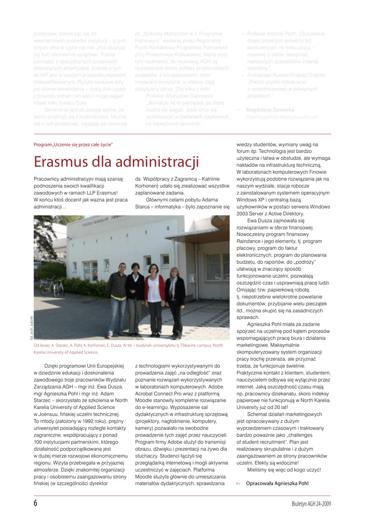 przepisów, odwołując się do wewnętrznych procedur instytucji – a tych często albo w ogóle nie ma, albo okazują się być niezmiernie uciążliwe. Trzeba pamiętać o specyficznych przepisach dotyczących amortyzacji, a także o tym, że VAT jest w każdym przypadku kosztem niekwalifikowanym. Ryzyko kursowe leży po stronie beneficjenta – straty (lub zyski) z powodu wahań cen walut mogą sięgać nawet kilku tysięcy Euro. Generalnie jednak panuje opinia, że warto zmierzyć się z trudnościami. Można się o tym przekonać, sięgając po broszurę pt. „Sukcesy Małopolski w 7. Programie Ramowym”, wydanej przez Regionalny Punkt Kontaktowy Programów Ramowych przy Politechnice Krakowskiej. Warto przy tym nadmienić, że naukowcy AGH są realizatorami blisko połowy przytoczonych projektów, a ich wypowiedzi, choć miejscami krytyczne, w efekcie dają pozytywny obraz. Oto kilka z nich: – Profesor Władysław Dąbrowski: „Jednakże są to pieniądze, po które trudno nie sięgać, jeżeli chce się uczestniczyć w badaniach naukowych na najwyższym poziomie.” Program „Uczenie się przez całe życie” Erasmus dla administracji ds. Współpracy z Zagranicą – Katriinie Korhonen) udało się zrealizować wszystkie zaplanowane zadania. Głównymi celami pobytu Adama Starca – informatyka – było zapoznanie się fot. arch. autorki Pracownicy administracyjni mają szansę podnoszenia swoich kwalifikacji zawodowych w ramach LLP Erasmus! W końcu ktoś docenił jak ważna jest praca administracji… Od lewej: A. Starzec, A. Pohl, K. Korhonen, E. Dusza. W tle – budynek uniwersytetu tj. Tikkarine campus, North Karelia University of Applied Science. Dzięki programowi Unii Europejskiej w dziedzinie edukacji i doskonalenia zawodowego troje pracowników Wydziału Zarządzania AGH – mgr inż. Ewa Dusza, mgr Agnieszka Pohl i mgr inż. Adam Starzec – skorzystało ze szkolenia w North Karelia University of Applied Science w Joensuu, fińskiej uczelni technicznej. To młody (założony w 1992 roku), prężny uniwersytet posiadający rozległe kontakty zagraniczne, współpracujący z ponad 100 instytucjami partnerskimi, którego działalność podporządkowana jest w dużej mierze rozwojowi ekonomicznemu regionu. Wizyta przebiegała w przyjaznej atmosferze. Dzięki znakomitej organizacji pracy i osobistemu zaangażowaniu strony fińskiej (w szczególności dyrektor 6 z technologiami wykorzystywanymi do prowadzenia zajęć „na odległość” oraz poznanie rozwiązań wykorzystywanych w laboratoriach komputerowych. Adobe Acrobat Connect Pro wraz z platformą Moodle stanowiły kompletne rozwiązanie do e-learningu. Wyposażenie sal dydaktycznych w infrastrukturę sprzętową (projektory, nagłośnienie, komputery, kamery) pozwalało na swobodne prowadzenie tych zajęć przez nauczycieli. Program firmy Adobe służył do transmisji obrazu, dźwięku i prezentacji na żywo dla słuchaczy. Studenci łączyli się przeglądarką internetową i mogli aktywnie uczestniczyć w zajęciach. Platforma Moodle służyła głównie do umieszczania materiałów dydaktycznych, sprawdzania – Profesor Andrzej Pach: „Oczywiście dzięki projektom jesteśmy też konkurencyjni na rynku pracy – możemy u siebie zatrzymać najlepszych specjalistów z danej dziedziny.” – Aleksander Kusznir/Andrzej Oziębło: „Prestiż uczelni rośnie wraz z uczestniczeniem w poważnych projektach.” Magdalena Żurawska Dział Programów Międzynarodowych wiedzy studentów, wymiany uwag na forum itp. Technologia jest bardzo użyteczna i łatwa w obsłudze, ale wymaga nakładów na infrastrukturę techniczną. W laboratoriach komputerowych Finowie wykorzystują podobne rozwiązania jak na naszym wydziale, stacje robocze z zainstalowanym systemem operacyjnym Windows XP i centralną bazą użytkowników w postaci serwera Windows 2003 Server z Active Direktory. Ewa Dusza zajmowała się rozwiązaniami w sferze finansowej. Nowoczesny program finansowy Raindance i jego elementy, tj. program płacowy, program do faktur elektronicznych, program do planowania budżetu, do raportów, do „podróży” ułatwiają w znaczący sposób funkcjonowanie uczelni, pozwalają oszczędzić czas i usprawniają pracę ludzi. Omijając tzw. papierkową robotę, tj. niepotrzebne wielokrotne powielanie dokumentów, przybijanie wielu pieczątek itd., można skupić się na zasadniczych sprawach. Agnieszka Pohl miała za zadanie spojrzeć na uczelnię pod kątem procesów wspomagających pracę biura i działania marketingowe. Maksymalnie skomputeryzowany system organizacji pracy trochę przeraża, ale przyznać trzeba, że funkcjonuje świetnie. Praktycznie kontakt z klientem, studentem, nauczycielem odbywa się wyłącznie przez internet. Jaką oszczędność czasu mają np. pracownicy dziekanatu, skoro indeksy papierowe nie funkcjonują w North Karelia University już od 20 lat! Schemat działań marketingowych jest opracowywany z dużym wyprzedzeniem czasowym i traktowany bardzo poważnie jako „challenges of student recruitment”. Plan jest realizowany skrupulatnie i z dużym zaangażowaniem ze strony pracowników uczelni. Efekty są widoczne! Mieliśmy się więc od kogo uczyć! Opracowała Agnieszka Pohl Biuletyn AGH 24-2009