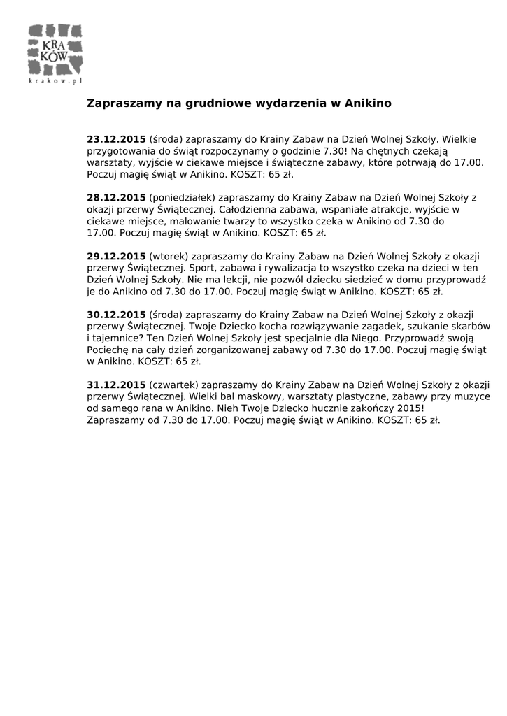 Zapraszamy na grudniowe wydarzenia w Anikino 23.12.2015 (środa) zapraszamy do Krainy Zabaw na Dzień Wolnej Szkoły. Wielkie przygotowania do świąt rozpoczynamy o godzinie 7.30! Na chętnych czekają warsztaty, wyjście w ciekawe miejsce i świąteczne zabawy, które potrwają do 17.00. Poczuj magię świąt w Anikino. KOSZT: 65 zł. 28.12.2015 (poniedziałek) zapraszamy do Krainy Zabaw na Dzień Wolnej Szkoły z okazji przerwy Świątecznej. Całodzienna zabawa, wspaniałe atrakcje, wyjście w ciekawe miejsce, malowanie twarzy to wszystko czeka w Anikino od 7.30 do 17.00. Poczuj magię świąt w Anikino. KOSZT: 65 zł. 29.12.2015 (wtorek) zapraszamy do Krainy Zabaw na Dzień Wolnej Szkoły z okazji przerwy Świątecznej. Sport, zabawa i rywalizacja to wszystko czeka na dzieci w ten Dzień Wolnej Szkoły. Nie ma lekcji, nie pozwól dziecku siedzieć w domu przyprowadź je do Anikino od 7.30 do 17.00. Poczuj magię świąt w Anikino. KOSZT: 65 zł. 30.12.2015 (środa) zapraszamy do Krainy Zabaw na Dzień Wolnej Szkoły z okazji przerwy Świątecznej. Twoje Dziecko kocha rozwiązywanie zagadek, szukanie skarbów i tajemnice? Ten Dzień Wolnej Szkoły jest specjalnie dla Niego. Przyprowadź swoją Pociechę na cały dzień zorganizowanej zabawy od 7.30 do 17.00. Poczuj magię świąt w Anikino. KOSZT: 65 zł. 31.12.2015 (czwartek) zapraszamy do Krainy Zabaw na Dzień Wolnej Szkoły z okazji przerwy Świątecznej. Wielki bal maskowy, warsztaty plastyczne, zabawy przy muzyce od samego rana w Anikino. Nieh Twoje Dziecko hucznie zakończy 2015! Zapraszamy od 7.30 do 17.00. Poczuj magię świąt w Anikino. KOSZT: 65 zł. Powered by TCPDF (www.tcpdf.org)