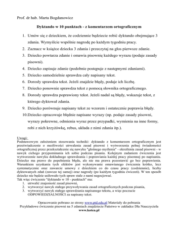 Prof. dr hab. Marta Bogdanowicz Dyktando w 10 punktach - z komentarzem ortograficznym 1. Umów się z dzieckiem, że codziennie będziecie robić dyktando obejmujące 3 zdania. Wymyślcie wspólnie nagrodę po każdym tygodniu pracy. 2. Zaznacz w książce dziecka 3 zdania i przeczytaj na głos pierwsze zdanie. 3. Dziecko powtarza zdanie i omawia pisownię każdego wyrazu (podaje zasady pisowni). 4. Dziecko zapisuje zdanie (podobnie postępuje z następnymi zdaniami). 5. Dziecko samodzielnie sprawdza cały napisany tekst. 6. Dorosły sprawdza tekst. Jeżeli znajdzie błędy, podaje ich liczbę. 7. Dziecko ponownie sprawdza tekst z pomocą słownika ortograficznego. 8. Dorosły sprawdza poprawiony tekst. Jeżeli nadal są błędy, wskazuje tekst, z którego dyktował zdania. 9. Dziecko porównuje napisany tekst ze wzorem i ostatecznie poprawia błędy. 10.Dziecko opracowuje błędnie napisane wyrazy (np. podaje zasady pisowni, wyrazy pokrewne, odmienia wyraz przez przypadki, wymienia na inne formy, robi z nich krzyżówkę, rebus, układa z nimi zdania itp.). Uwagi: Podstawowym założeniem stosowania techniki: dyktando z komentarzem ortograficznym jest przeświadczenie o możliwości utrwalenia zasad pisowni i wytworzenia pełnej świadomości ortograficznej przez przekształcenie się nawyku "głośnego myślenia" - określenia zasad pisowni - w nawyk cichego przypominania ich sobie podczas pisania. Kolejnym zadaniem ćwiczenia jest wytworzenie nawyku dokładnego sprawdzania i poprawiania każdej pracy pisemnej po napisaniu. Dziecko ma prawo do popełnienia błędu, ale nie ma prawa pozostawić go bez poprawienia. Warunkiem uzyskania tych efektów jest wykonywanie omawianego ćwiczenia krótko, lecz systematycznie oraz zawarcie umowy z dzieckiem co do czasu pracy (codziennie), liczby dyktowanych zdań (zawsze tej samej) oraz nagrody (po każdym tygodniu ćwiczeń). W ten sposób dziecko nie będzie usiłowało tych spraw stale z nami negocjować. Tak więc ćwiczenie "dyktando w 10 - punktach" ma: 1. utrwalić znajomość zasad pisowni, 2. wytworzyć nawyk stałego przywoływania zasad ortograficznych podczas pisania, 3. wytworzyć nawyk stałego sprawdzania napisanego tekstu, a więc poczucie ODPOWIEDZIALNOŚCI za napisany tekst. Opracowanie pobrano ze strony www.ptd.edu.pl Materiały do pobrania Przykładowe ćwiczenie pisowni na 5 zdaniach znajdziecie Państwo w zakładce Dla Nauczyciela www.kotea.pl